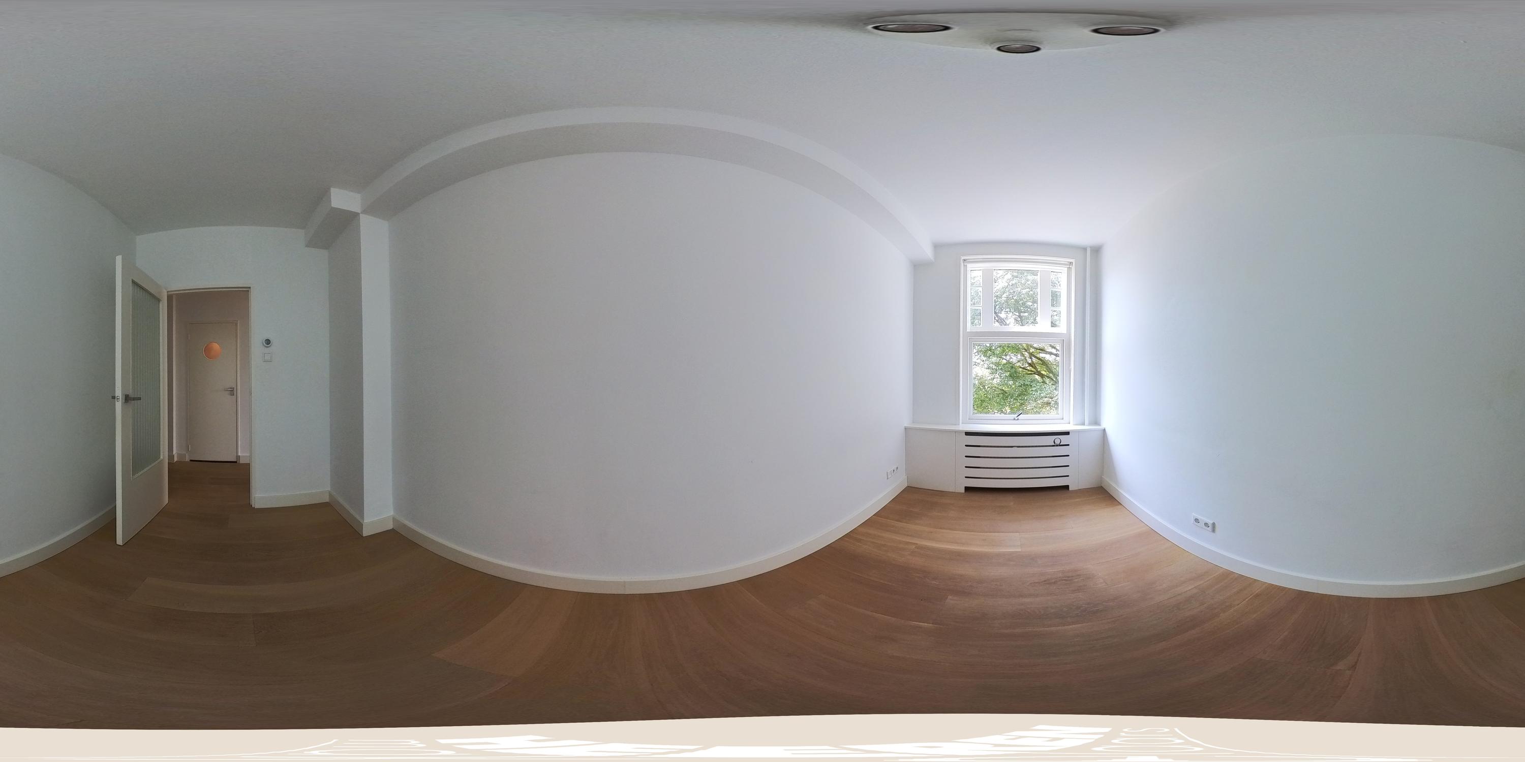 Entrance to the apartment through a spacious hallway providing access to all rooms. At the front is the living and dining area, offering beautiful views over the green and stately Minervaplein. The bright through-living room is surrounded by windows on three sides, flooding the space with natural light and enhancing the sense of openness. The open-plan kitchen is fitted with modern built-in appliances, including an induction cooktop, combination oven, dishwasher, fridge, and freezer.