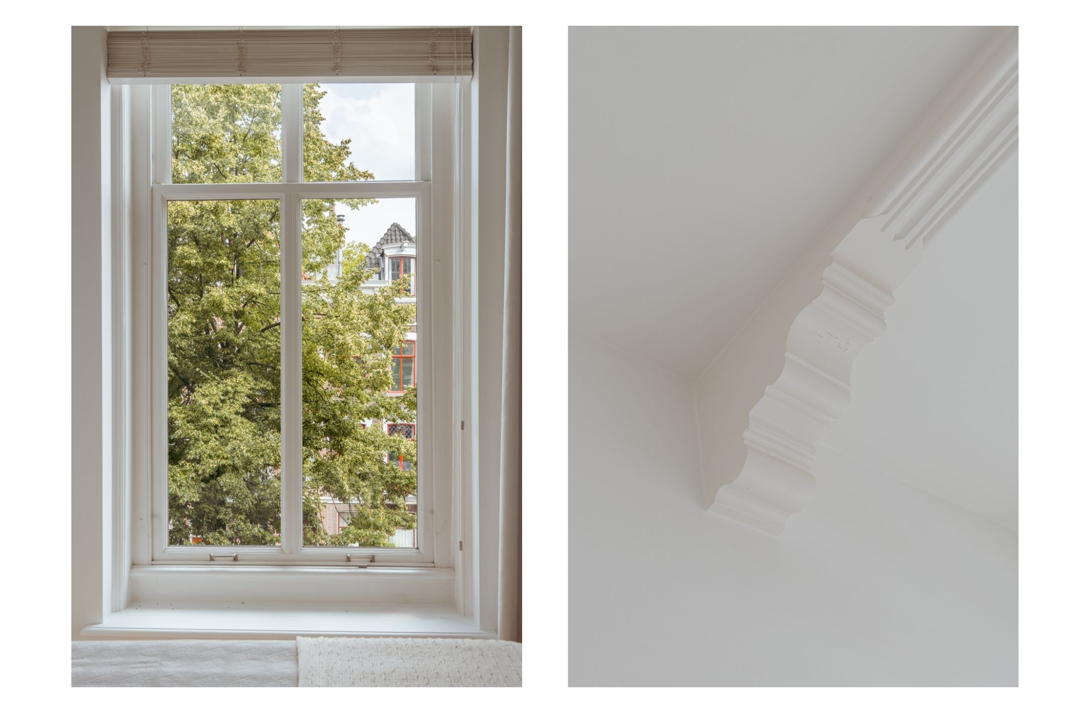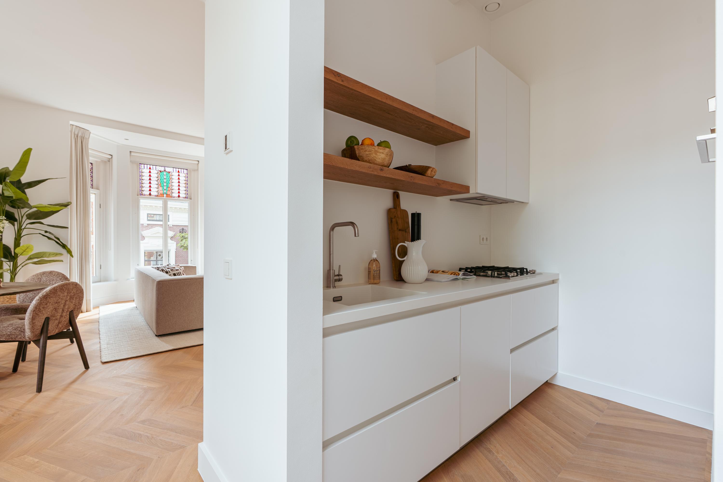 Apartment Amsterdam Vondelpark neighbourhood, measuring approximately 85 m², is set within a monumental building, offering a sense of quiet distinction in one of the city’s most beloved neighbourhoods. This second-floor residence has been fully renovated, with details such as over three-metre-high ceilings, elegant bay windows, and a wood-burning fireplace that anchor the main living space in calm, natural light. The layout is intuitive—a spacious hall connects all rooms. Two generously sized bedrooms each have private en-suite bathrooms with walk-in showers and thoughtful built-in wardrobes. The semi-open kitchen, equipped with luxury integrated appliances and a bar counter, invites both casual mornings and evenings shared with friends. Mechanical ventilation, underfloor heating, and lift access further elevate day-to-day comfort. Freehold tenure affords peace of mind.