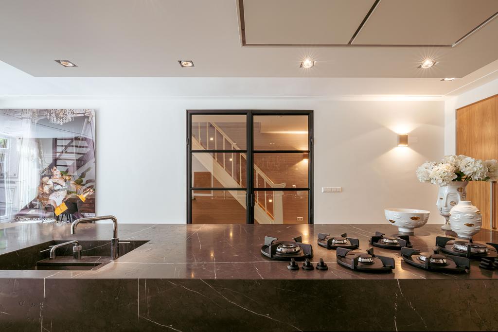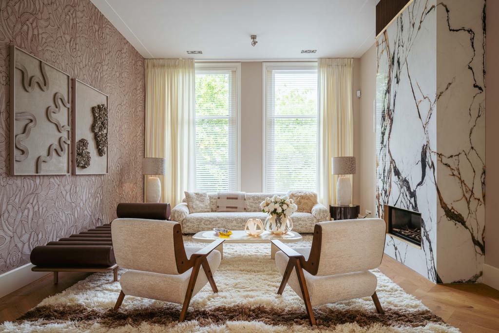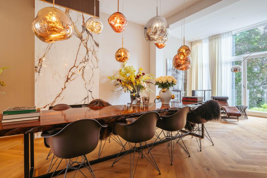 At the front, a cozy sitting area centers around a stylish gas fireplace with a marble mantelpiece, flooded with natural light through large windows and offering an uninterrupted view of Vondelpark. The dining area at the rear is accessible from both the living room and hallway through sleek steel pivot doors and features another gas fireplace with a marble surround, adding warmth and sophistication. A staircase connects this space to the kitchen in the lower ground floor, creating a natural flow between the levels.