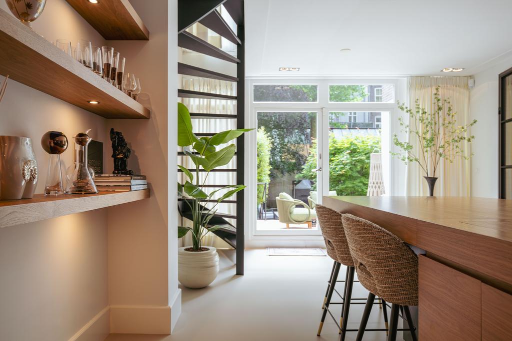 A gas fireplace enhances the cozy atmosphere, and the kitchen offers ample storage. It's accessible from the dining area above or through French doors from the hallway. Adjacent is a room currently used as a home office, which, like the kitchen, has direct access to the large terrace via French doors. The terrace leads down to the beautifully landscaped south-facing garden, also accessible via a rare private back entrance on Schapenburgerpad, allowing direct access to the garden—ideal for storing bikes, a unique feature in central Amsterdam.