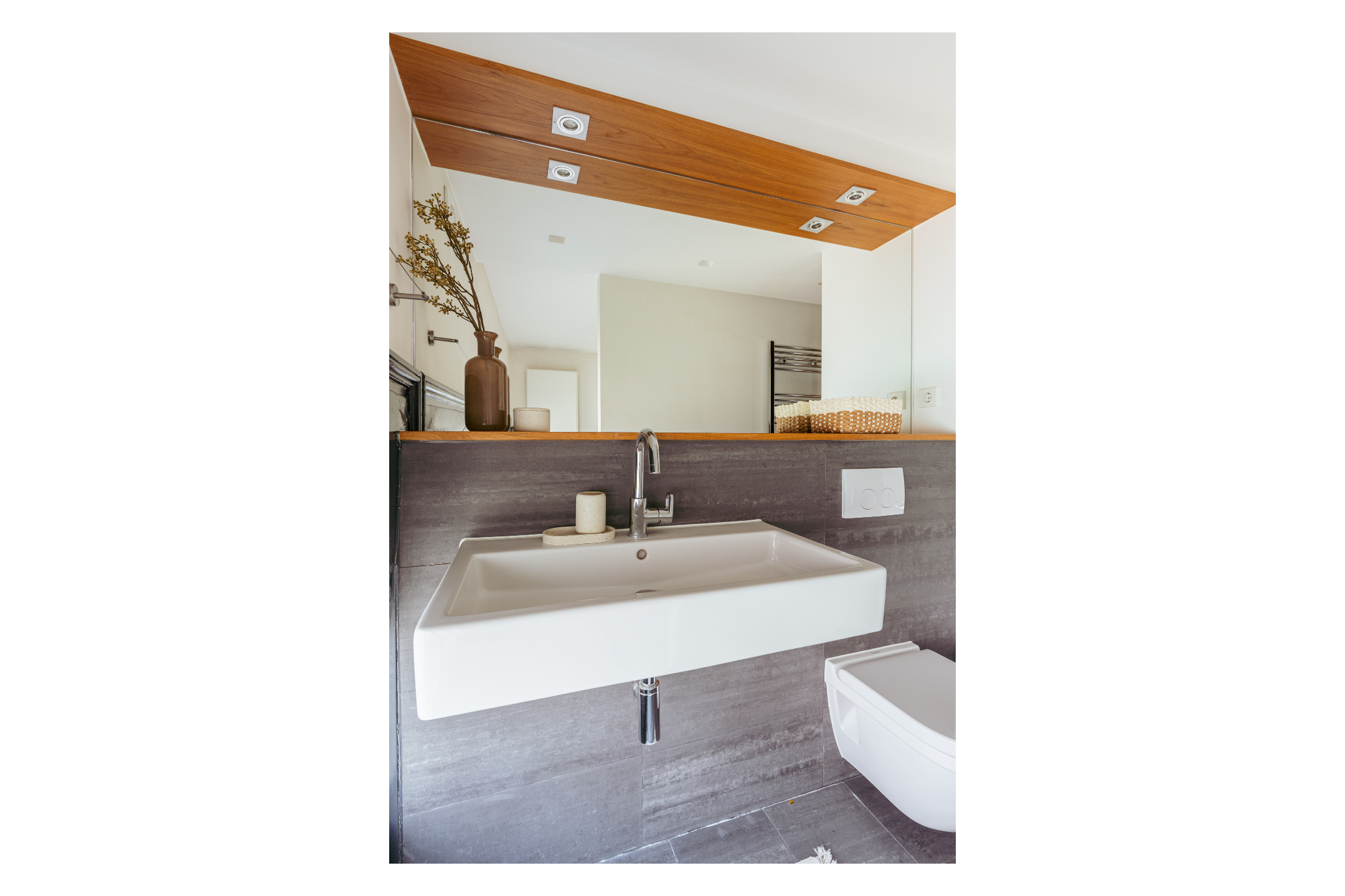 An open staircase in the living room leads to the first floor, which also has its own entrance via the communal staircase. The spacious hallway provides ample space for a coat area and additional storage. Here, you will find the first bathroom, fitted with a walk-in shower, washbasin unit, and a separate WC with a small sink.