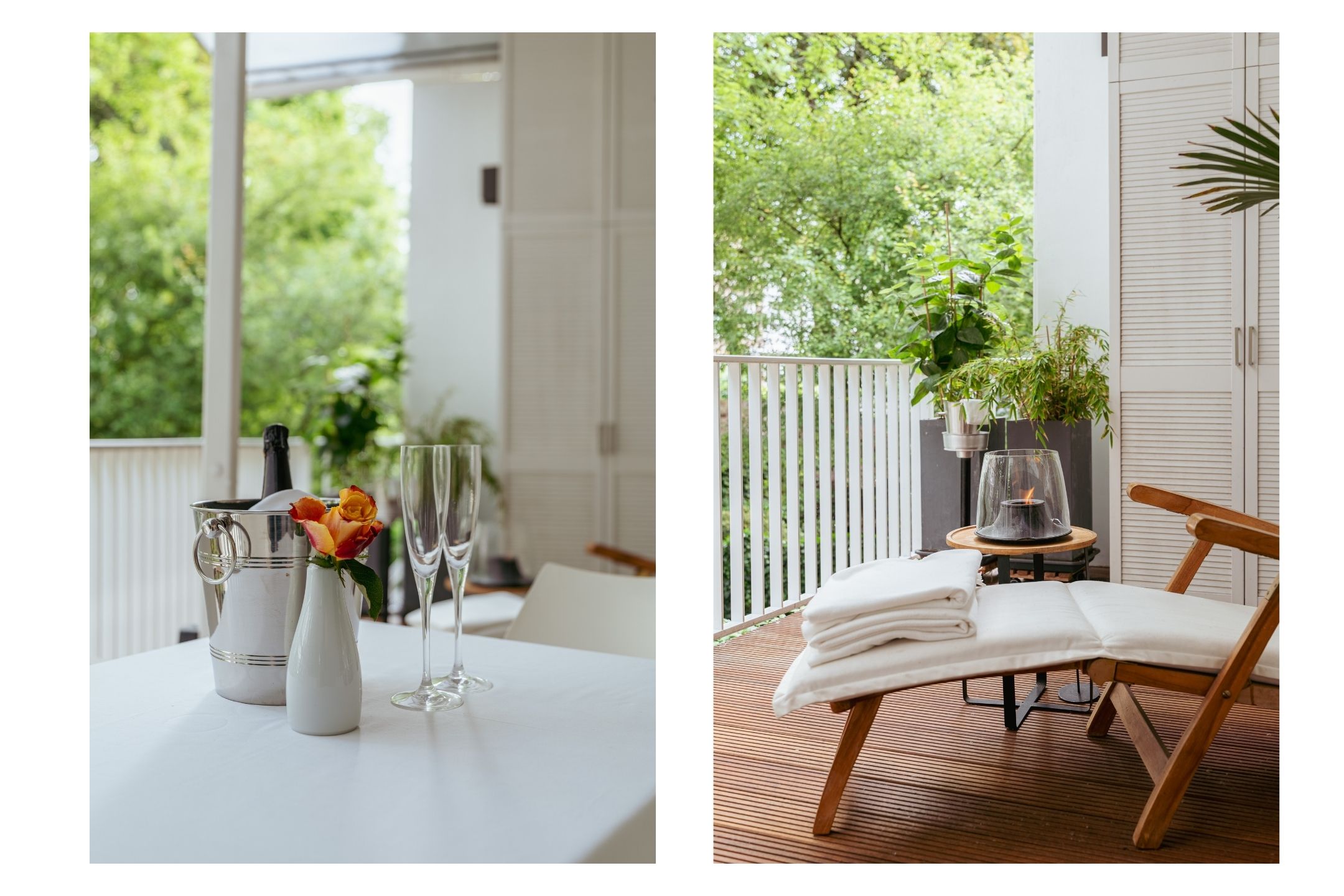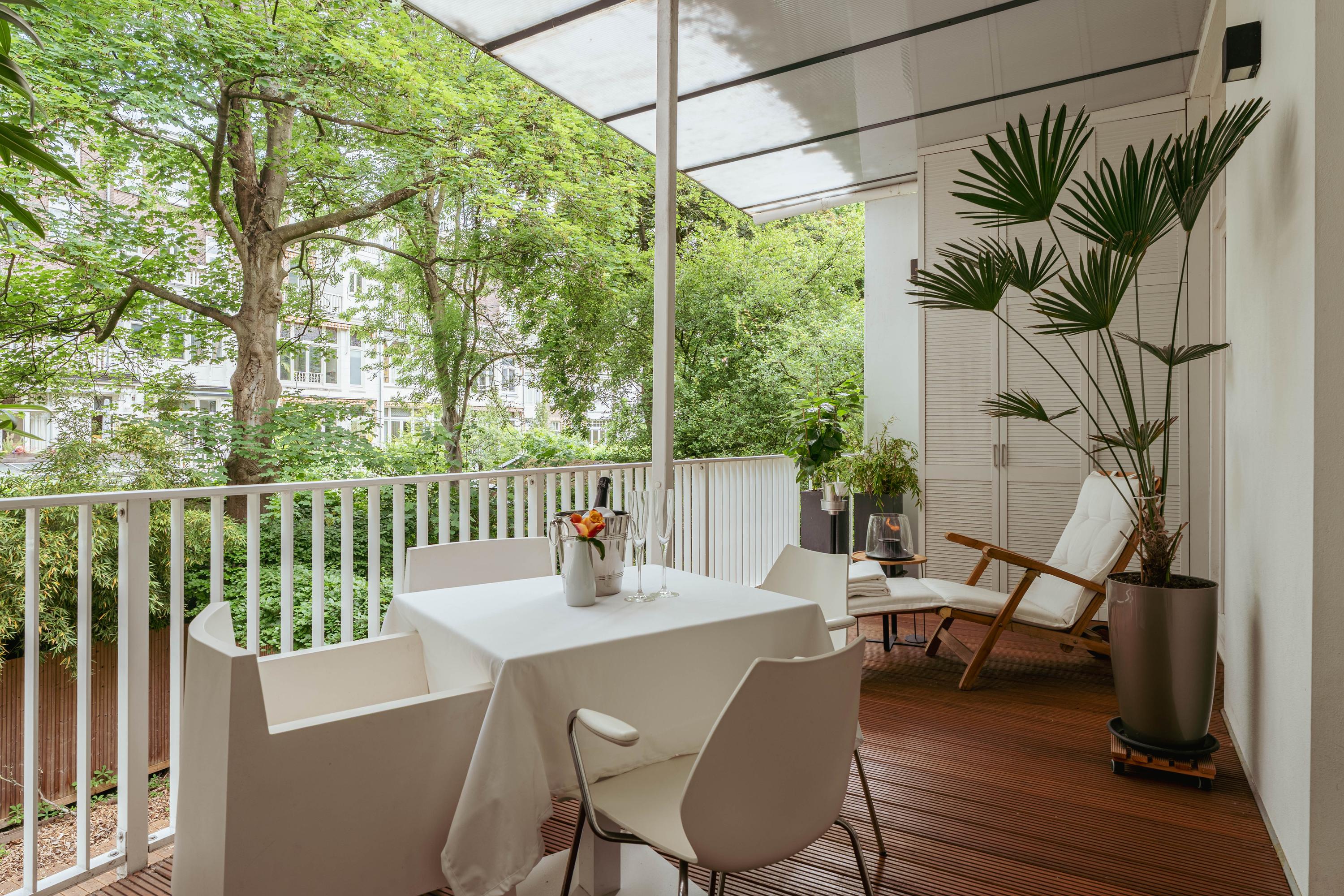 Double French doors provide access to the very deep balcony of approximately 17 m², fitted with a terrace canopy and a practical tall balcony storage cabinet.