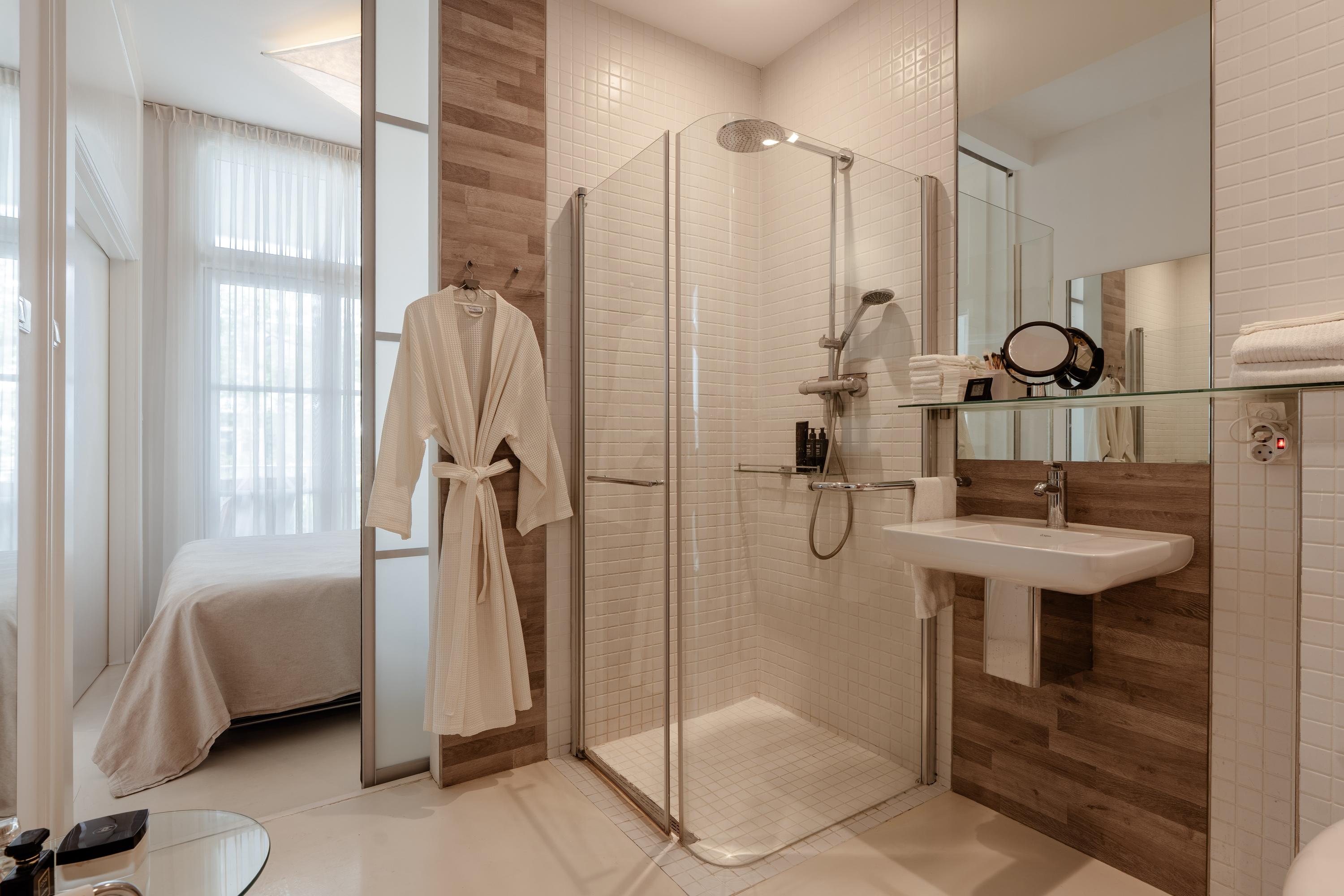 Adjacent to the bedroom is the en-suite bathroom, accessible via a sliding partition and equipped with a walk-in shower, washbasin, toilet and designer radiator.