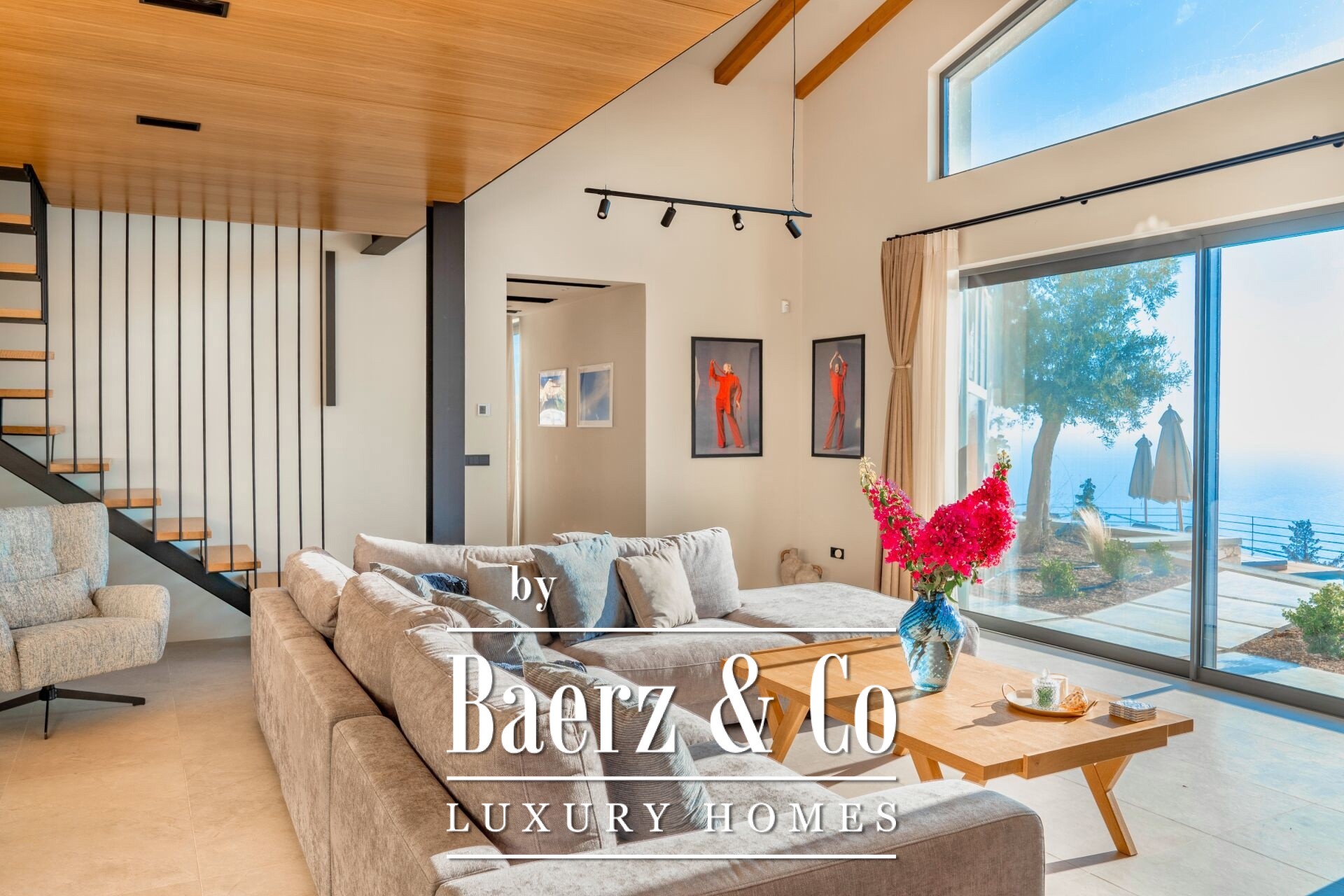 Luxury villa Lefkada invites a new chapter of Ionian living, set just 530 meters from the coastline. This luxury villa Lefkada harmoniously anchors 237 m² of refined interiors within 5,380 m² of private grounds, commanding 180-degree views across sea, mountains, and lush green slopes. Four master bedrooms and five bathrooms grant serenity and space, while the expansive living area with fireplace and the sleek modern kitchen offer both conviviality and seclusion. Throughout, light, architectural clarity, and understated detail prevail.