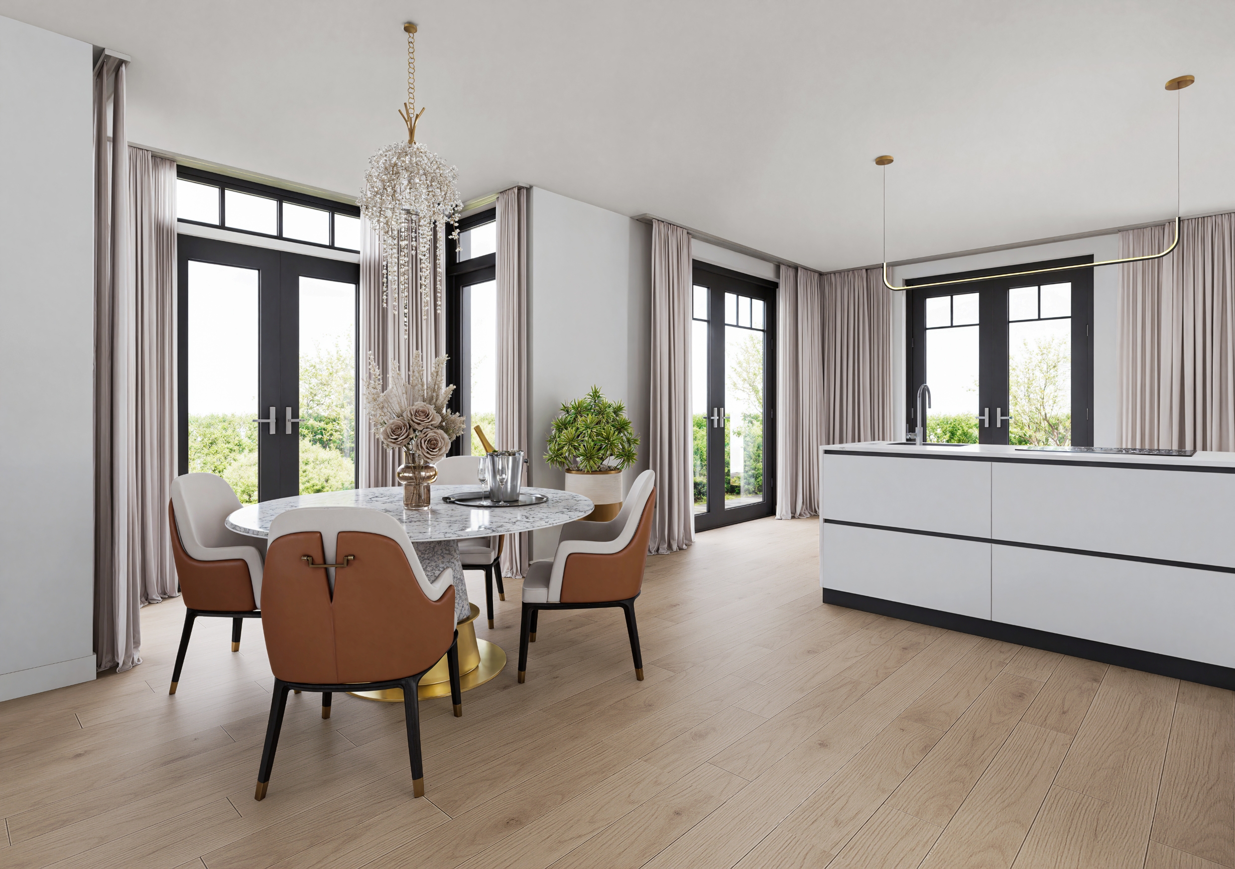 Upon entering, you are welcomed into a spacious hallway with a cloakroom area, a stylish staircase with leather-covered steps and a modern toilet. The ground floor features a sleek PVC floor with underfloor heating and cooling. From the hallway, you have a direct view of the large backyard, which immediately gives a sense of openness.