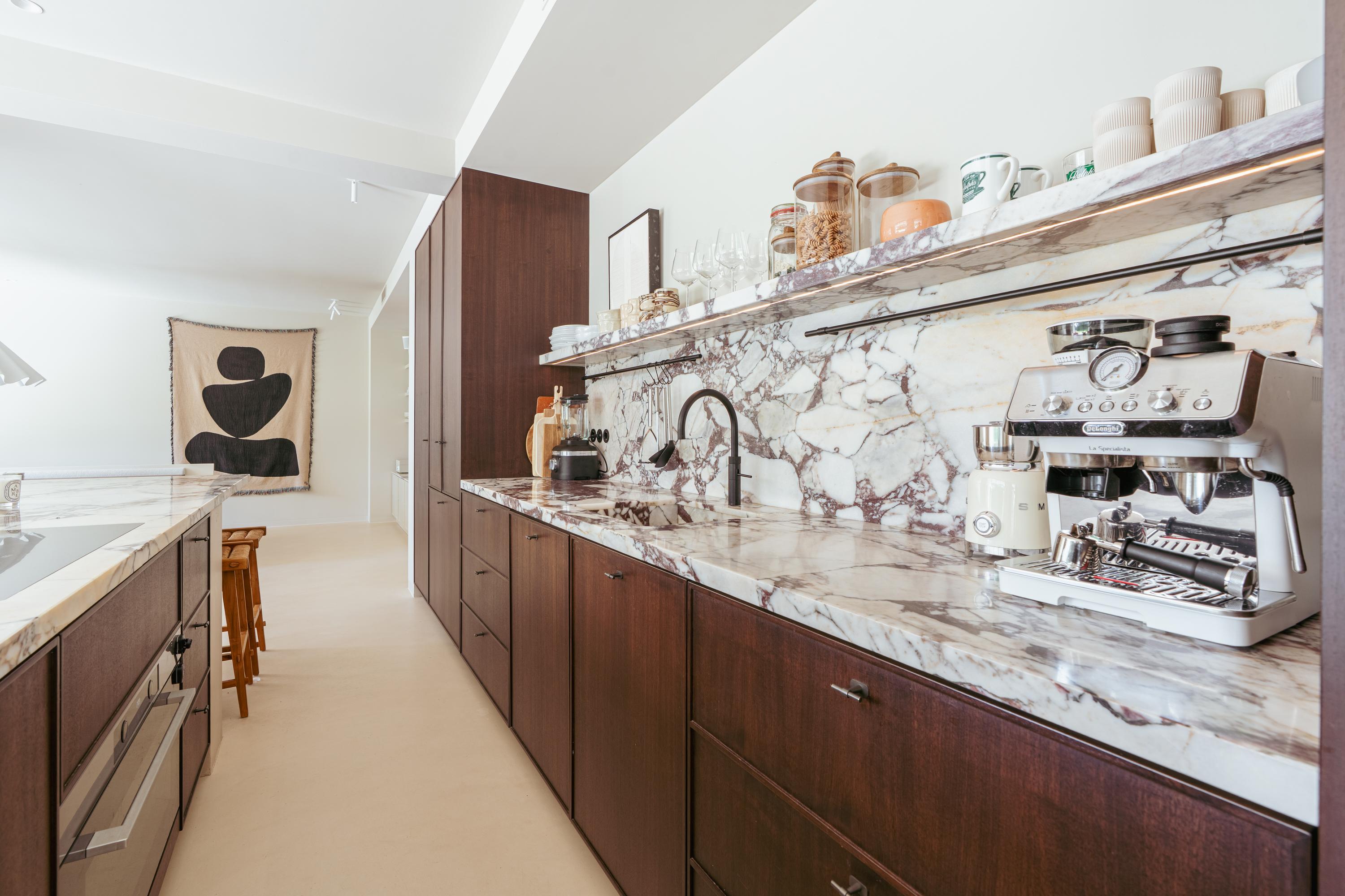 The expansive living room, featuring floor-to-ceiling windows and a stunning round bay window, is bathed in natural light, instantly creating a sense of space and tranquillity. The elegant fireplace forms a central feature of the open-plan living area, which flows seamlessly into the luxurious kitchen. The kitchen is equipped with high-end built-in appliances and modern conveniences, including a generous island of approx. 5 metres, Quooker tap, dishwasher, fridge/freezer combination, and an induction hob with integrated extractor. The exclusive book-matched marble worktop extends into the sink, giving the kitchen a refined and sophisticated finish. French steel doors open onto the delightful covered terrace and beautifully landscaped garden. Adjoining the kitchen is the spacious dining room.