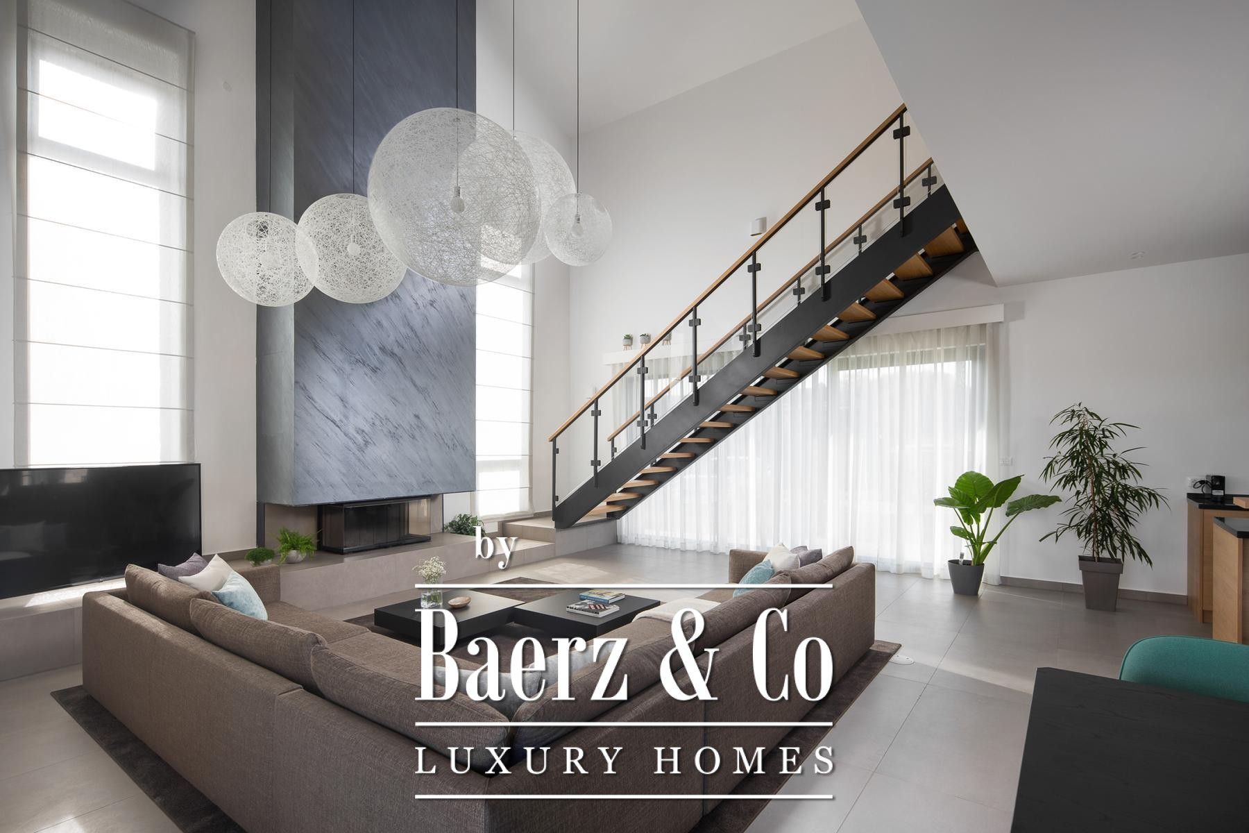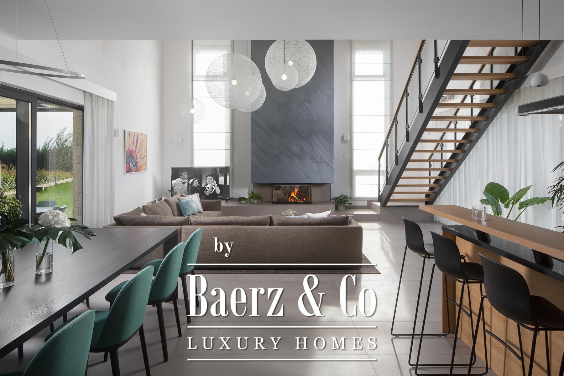 The villa’s architecture privileges openness and clarity, with natural finishes and an unwavering emphasis on privacy. The main living area spans 77 m² in an open-plan arrangement, integrating the kitchen, dining, and lounge beneath a contemporary aesthetic. Features such as underfloor heating, integrated air conditioning, a wood-burning fireplace, and advanced appliances create a faultless interior climate throughout the seasons.