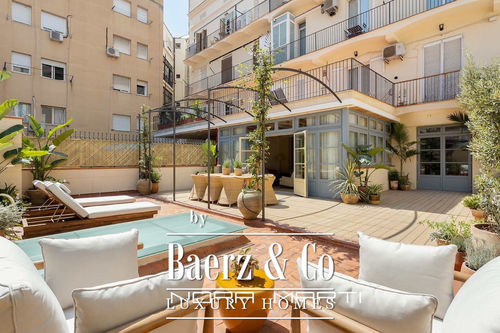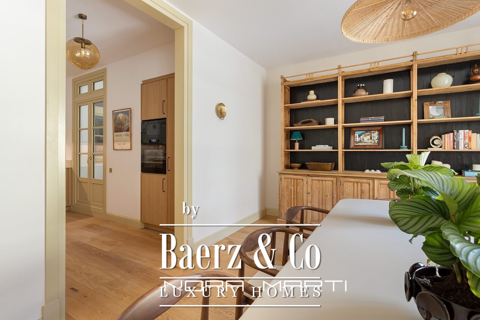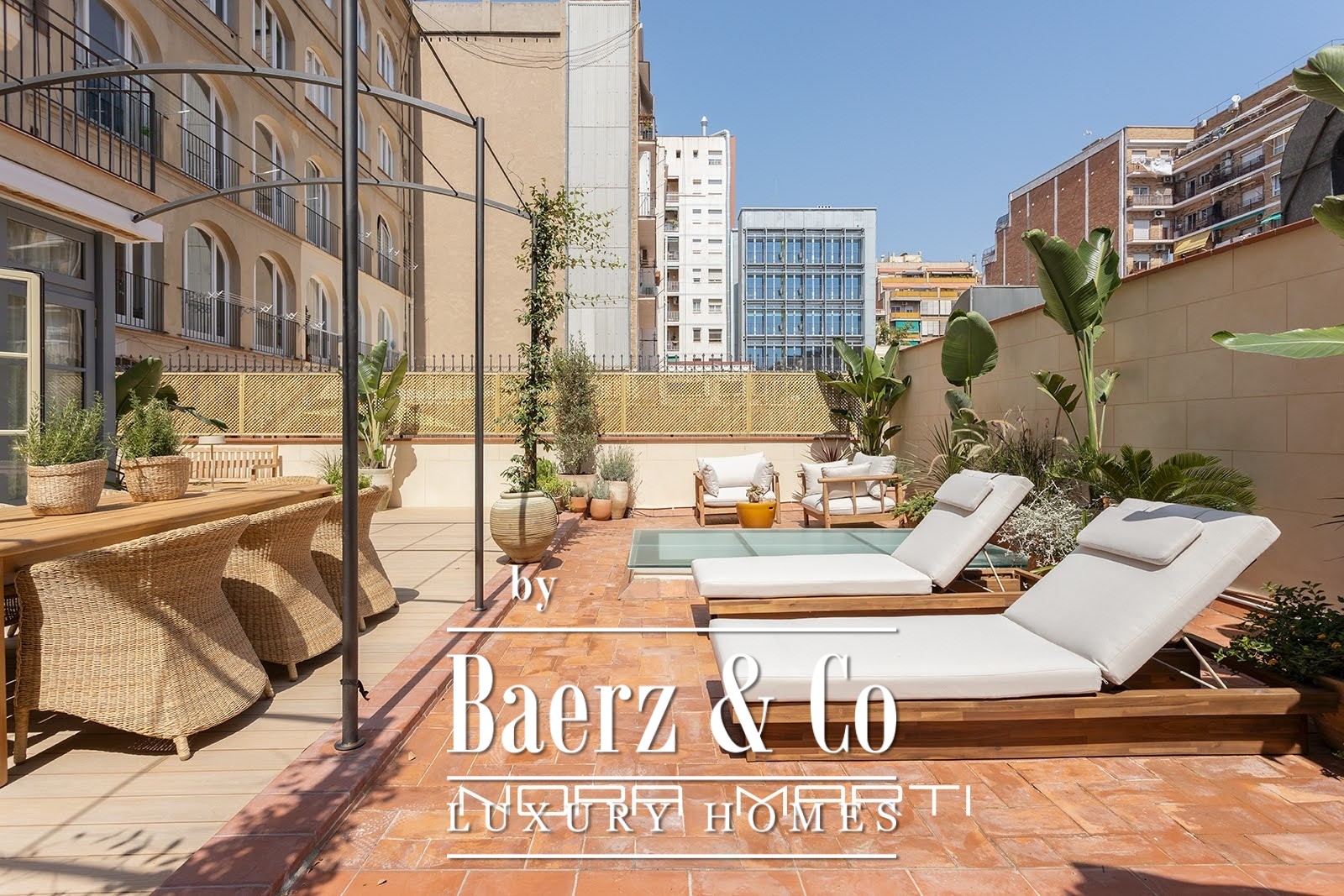 The interior design incorporates natural elements to create a warm and modern feel while maintaining an air of elegance. All three exterior bedrooms feature large double beds, built-in wardrobes, and en-suite bathrooms. The aged brass bathroom fixtures are from a local Catalan company known for its design and quality. Natural oak flooring covers the entire apartment; the wider-than-usual planks suggest a more modern approach to traditional, high-quality flooring. Underfloor heating throughout offers understated luxury, as does the dual-zone climate control system, adjustable in each room. The light fixtures, sourced from both Catalonia and England, feature decorative and functional pieces, including vintage and antique elements. The apartment's inviting green terrace adds another dimension, a space for entertaining, relaxing, and enjoying the feeling of spaciousness in the heart of Barcelona.