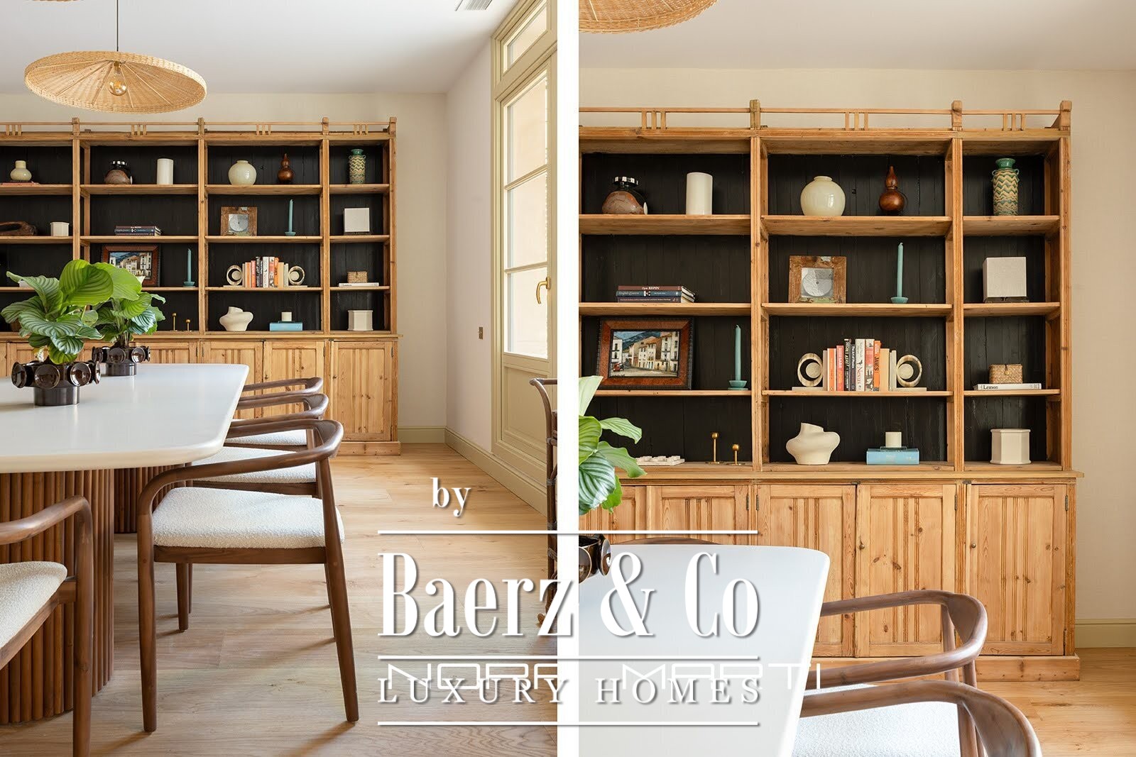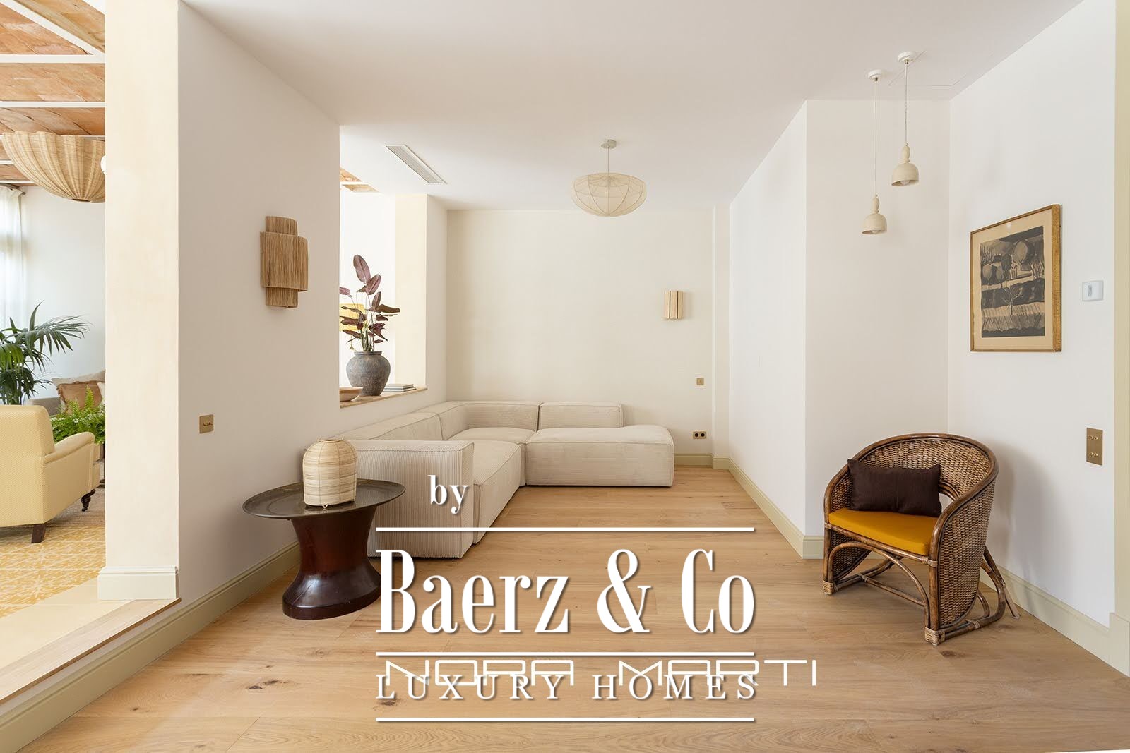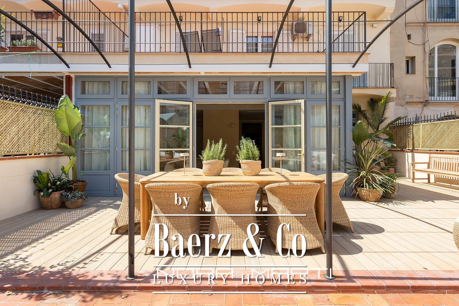 The interior design incorporates natural elements to create a warm and modern feel while maintaining an air of elegance. All three exterior bedrooms feature large double beds, built-in wardrobes, and en-suite bathrooms. The aged brass bathroom fixtures are from a local Catalan company known for its design and quality. Natural oak flooring covers the entire apartment; the wider-than-usual planks suggest a more modern approach to traditional, high-quality flooring. Underfloor heating throughout offers understated luxury, as does the dual-zone climate control system, adjustable in each room. The light fixtures, sourced from both Catalonia and England, feature decorative and functional pieces, including vintage and antique elements. The apartment's inviting green terrace adds another dimension, a space for entertaining, relaxing, and enjoying the feeling of spaciousness in the heart of Barcelona.