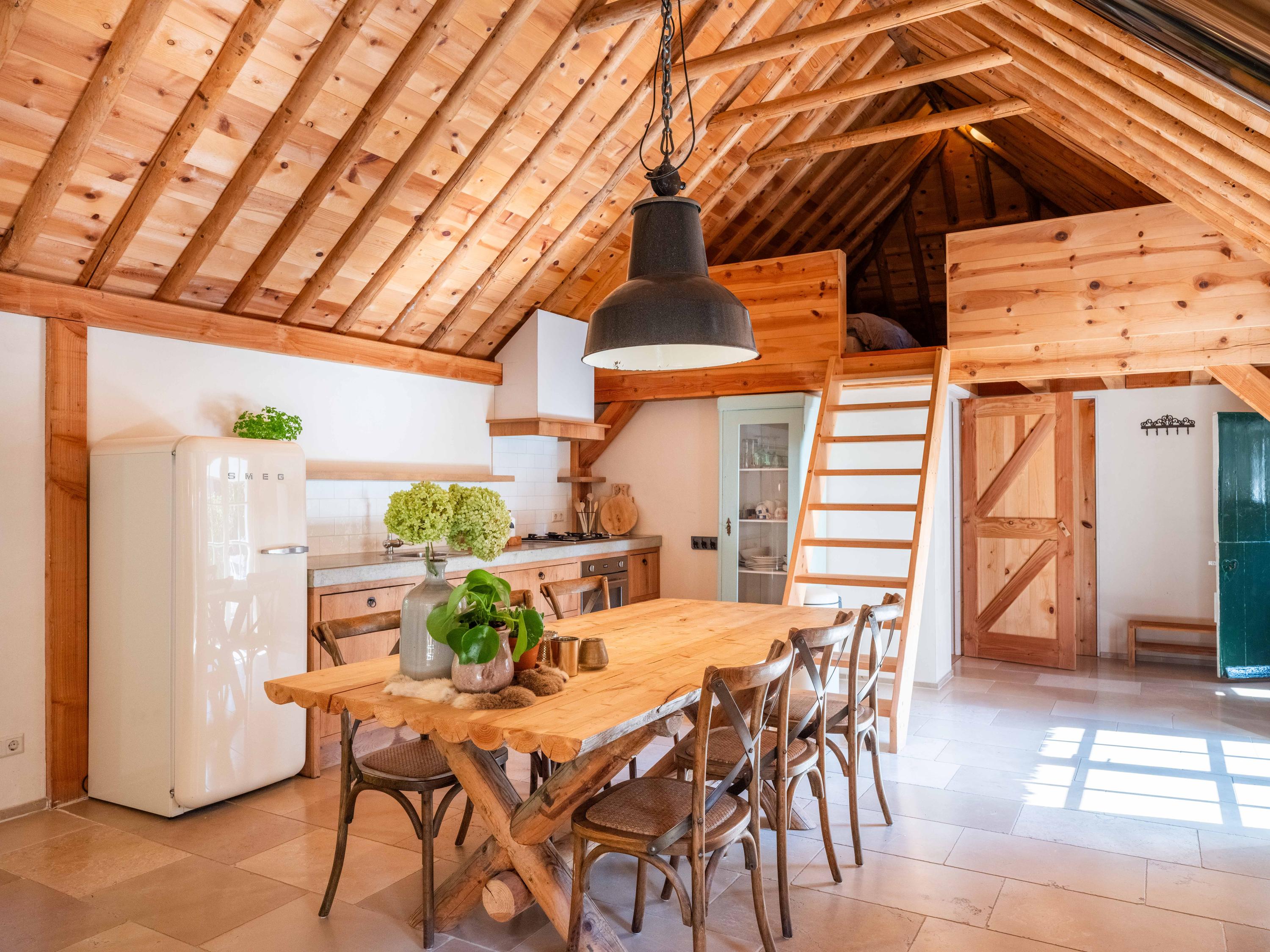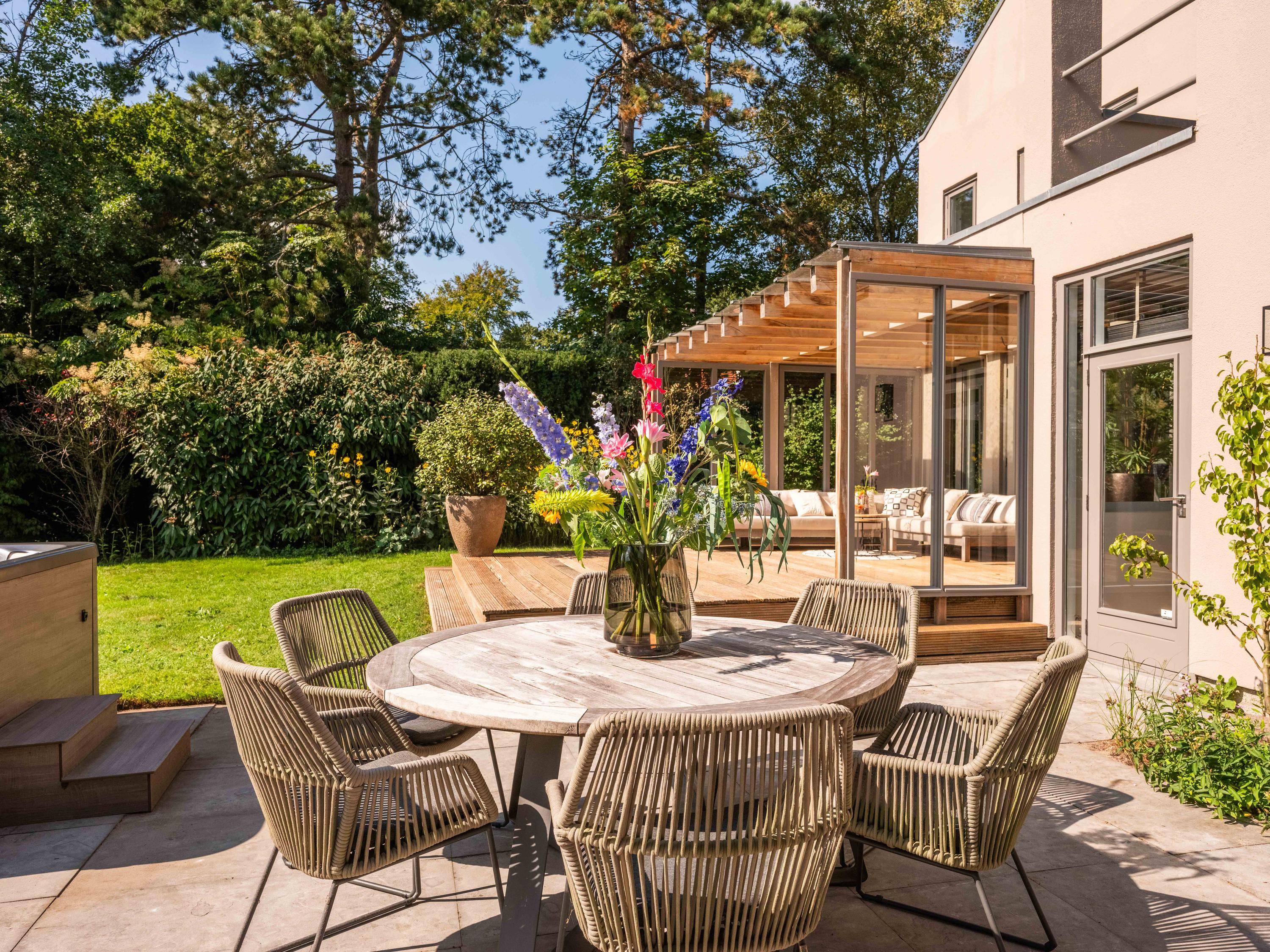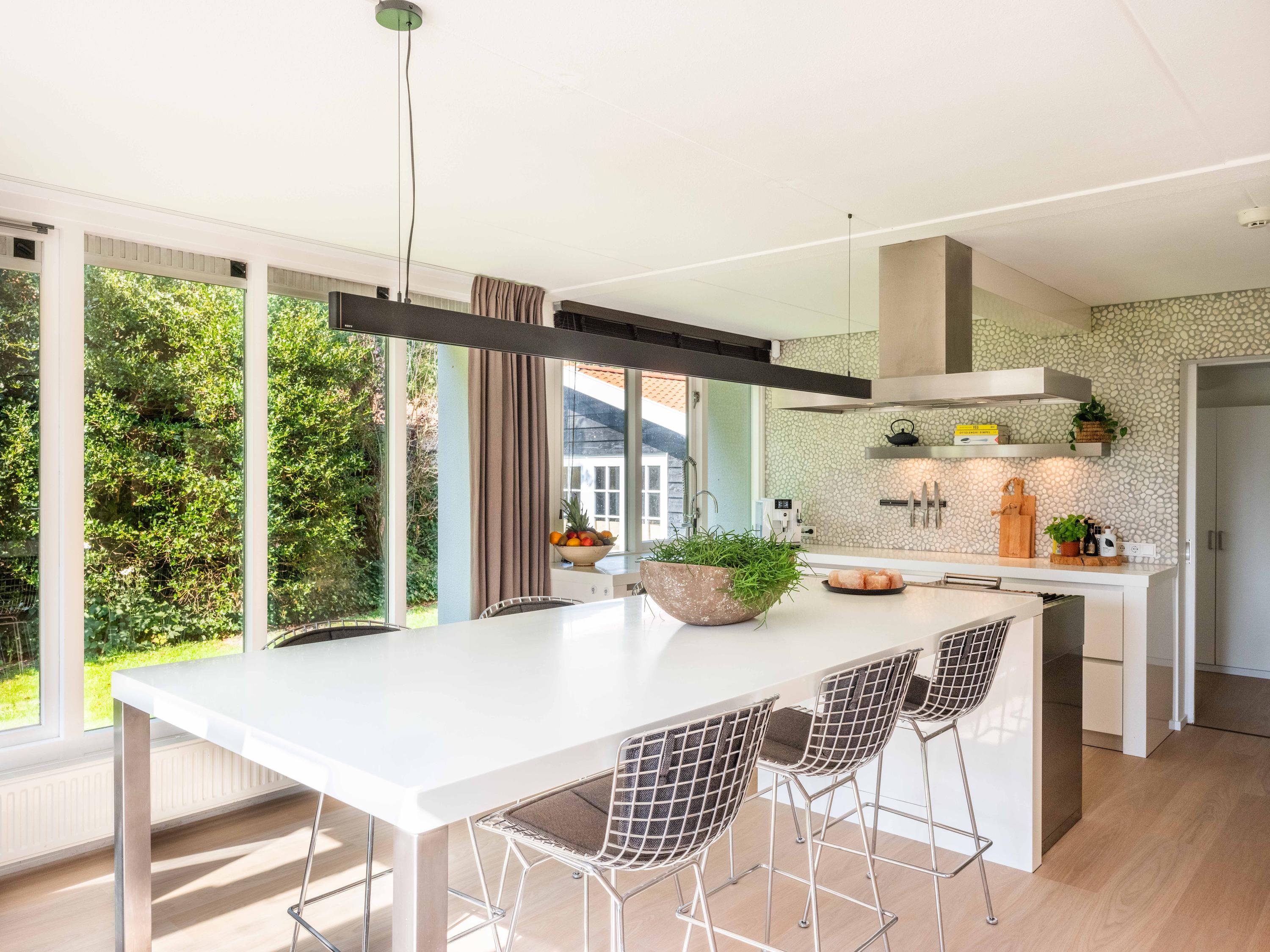 Main residence is a 344 m² architect-designed villa completed in 1984, exuding a calm, contemporary energy throughout. The generous living room captures daylight and open meadow prospect, complemented by a fireplace for evening warmth. In the kitchen, an island connects family gatherings with views of green, while French doors and a covered, heated terrace blur boundaries between indoors and out. Appliances include a quooker, professional stove with teppanyaki and deep fryer, steam oven, wine cooler, and more. Adjacent utility spaces offer further practicality.