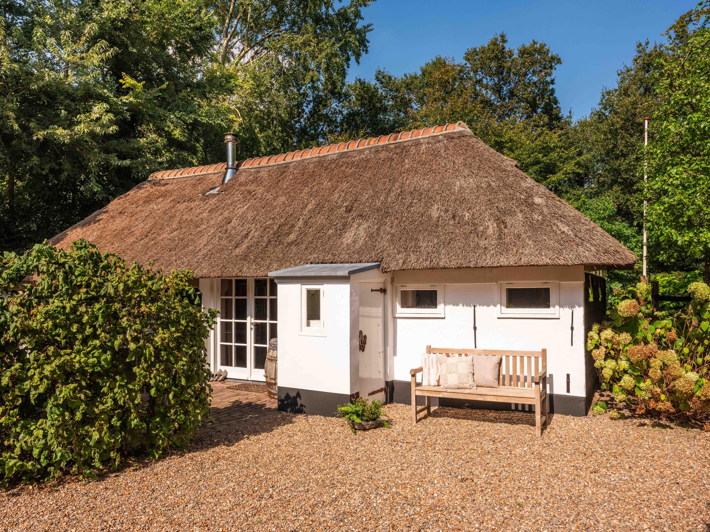 Villa Bergen stands in a singularly tranquil setting, with expansive meadow views and total privacy anchored by an artistically gated entrance. This villa Bergen estate quietly fuses history and modernity. At the front of the 2,684 m² plot, a mid-18th-century thatched farmhouse, meticulously renovated in 2014, provides a distinguished introduction to the property. This outbuilding is fully equipped for use as a home office, studio, or informal care—its flexibility matching its provenance.