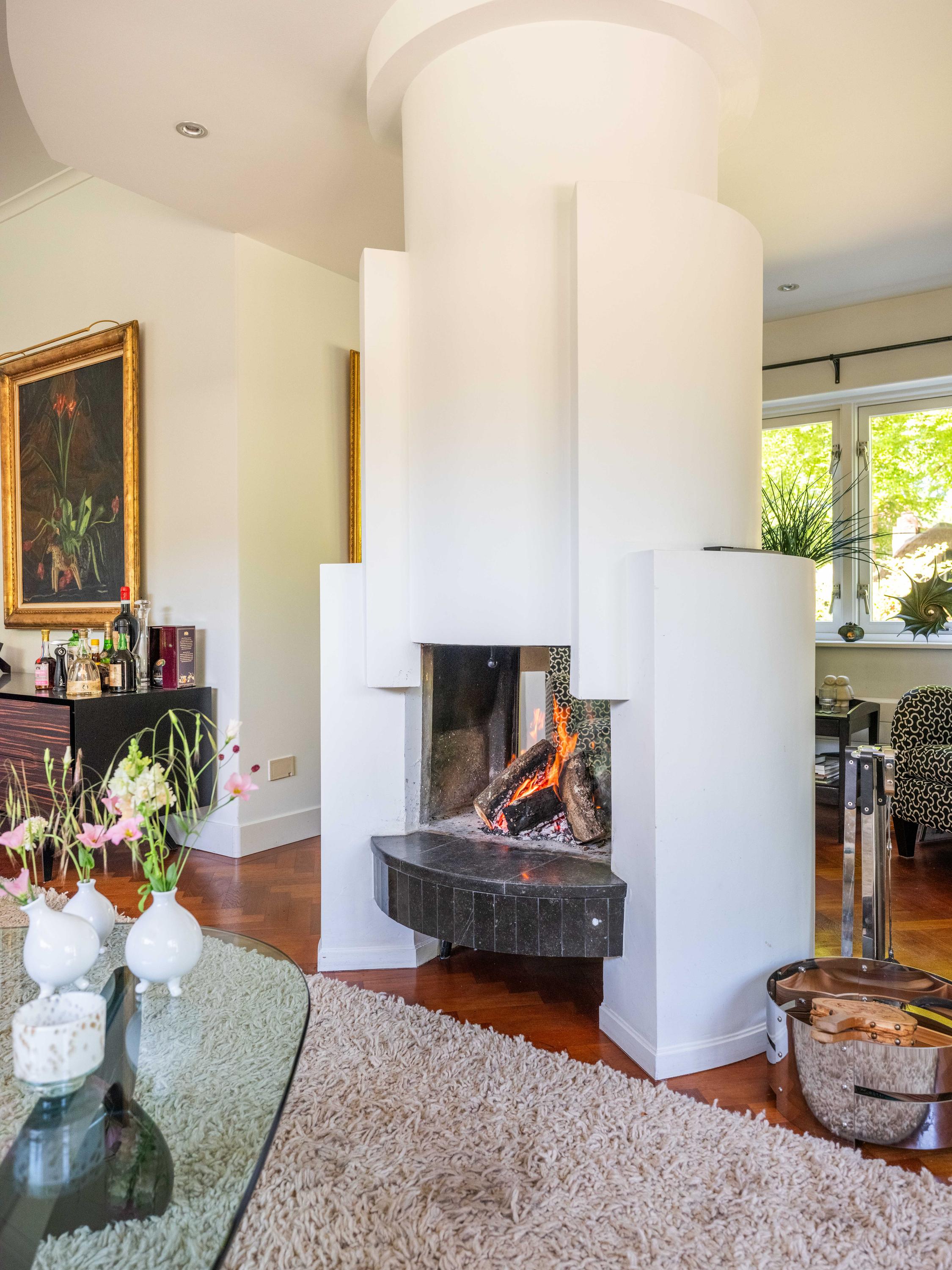 A few steps below, the playful half-hexagonal kitchen is fitted with modern built-in appliances and flows to a sunken dining area with space for large gatherings. Upstairs, three generous bedrooms await, including a master suite with gas fireplace, walk-in closet, balcony over the green garden, and access to two bathrooms—one with bathtub, shower, and wide sink, the other more intimate in scale.