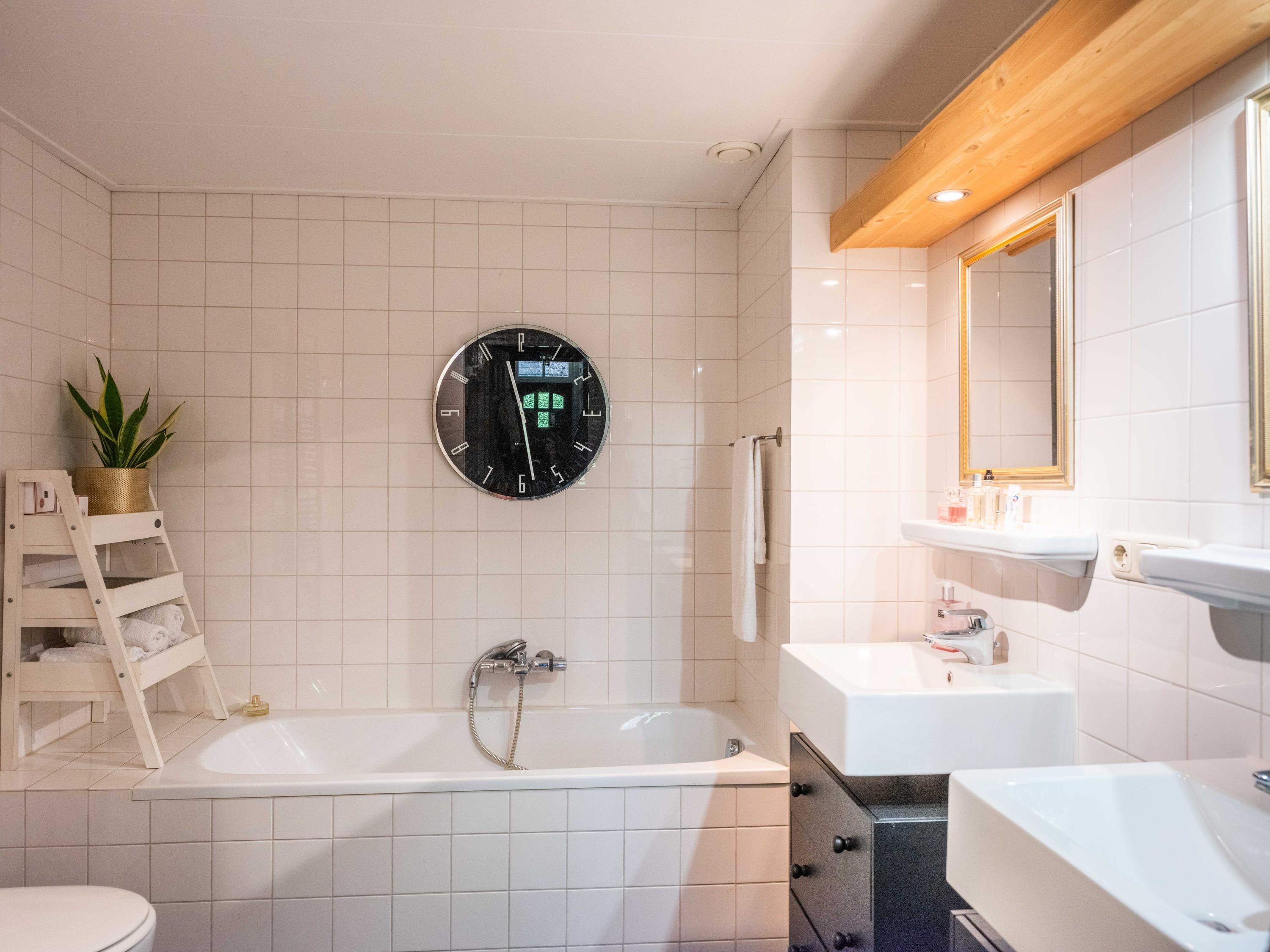 The spacious living room of 18 meters long is sunny and light because of the many windows. En-suite doors divide the space into an office and living room. The living room has a cozy wood-burning stove and a door to the front terrace. The spacious country style open kitchen has a striking mantelpiece with large stove. Adjacent to the kitchen is a large laundry room as well as a separate linen room. There is also a pantry with full-length built-in cupboards and a kitchenette with a door that leads to a second terrace and garden adjacent to the house.