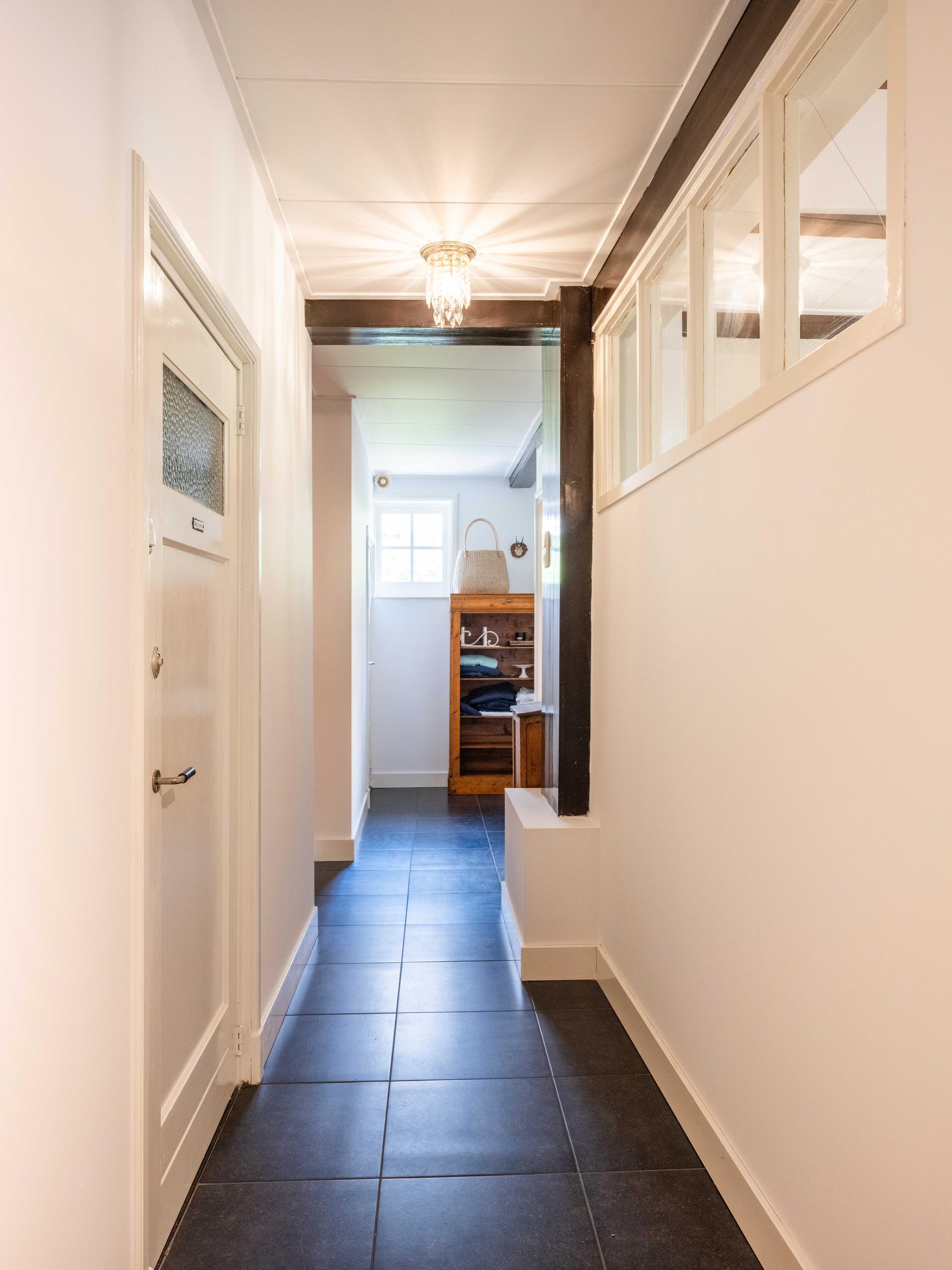 The first floor of the farmhouse, now an indoor storage space, can still be completely styled as you see fit. It is a huge space with a striking view of the wooden beams and thatched roof. The old farmhand's room now serves as a heated storage space.