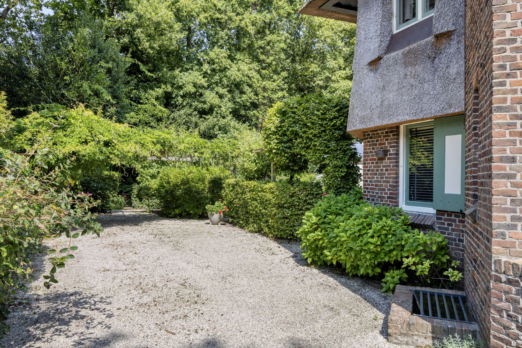 The villa is approached via a spacious driveway with room for several cars. At the front, the imposing thatched roof immediately catches the eye. From the entrance hall, you reach both the living room and the kitchen.