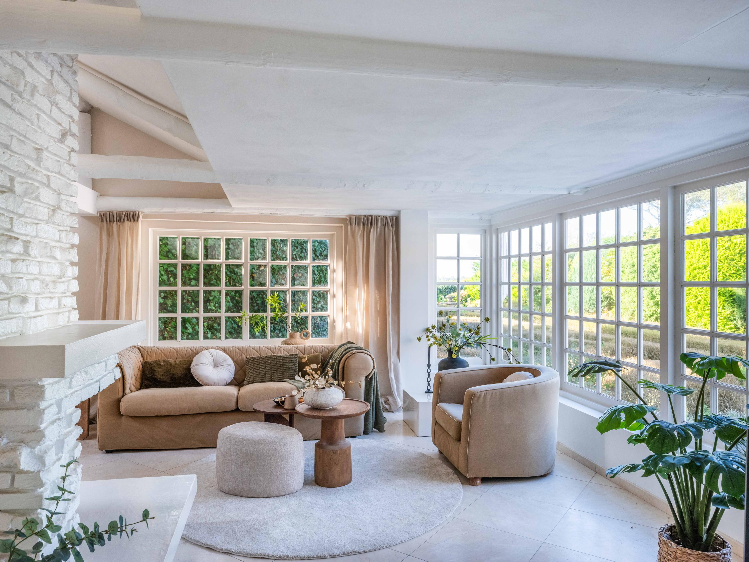 The spacious living room has a cozy gas fireplace (formerly fireplace) in the center of the room. The room is cozy with many authentic details. Think of the wooden beams in sight, a high ceiling up to the ridge and round stained-glass windows. At the back left we find the open kitchen with built-in appliances. From the kitchen we enter the utility room with the connection for the washer and dryer, the central heating system and a door to the outside.
