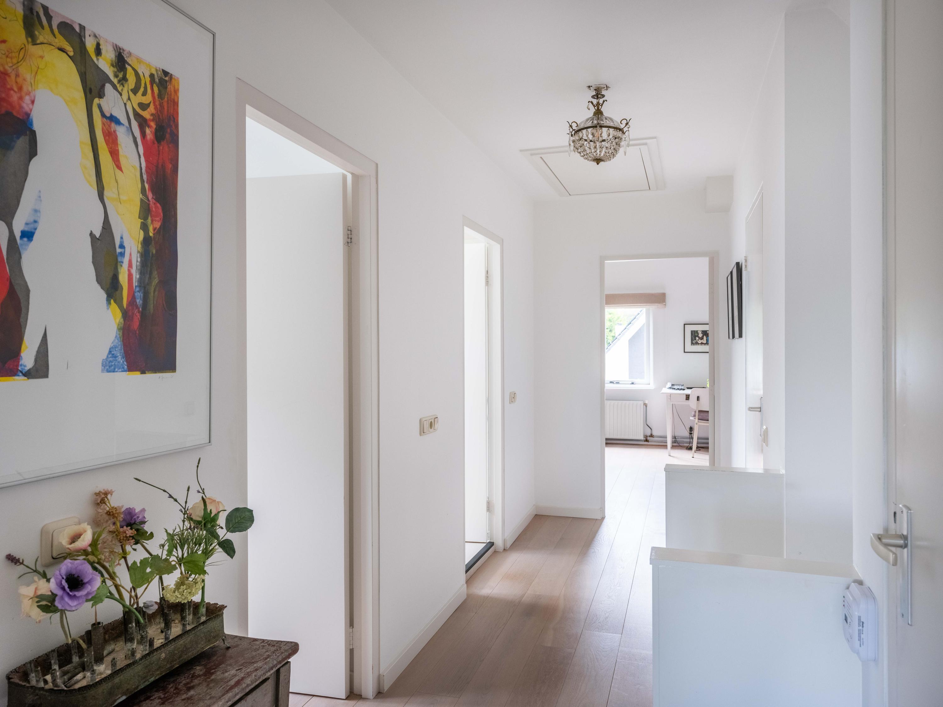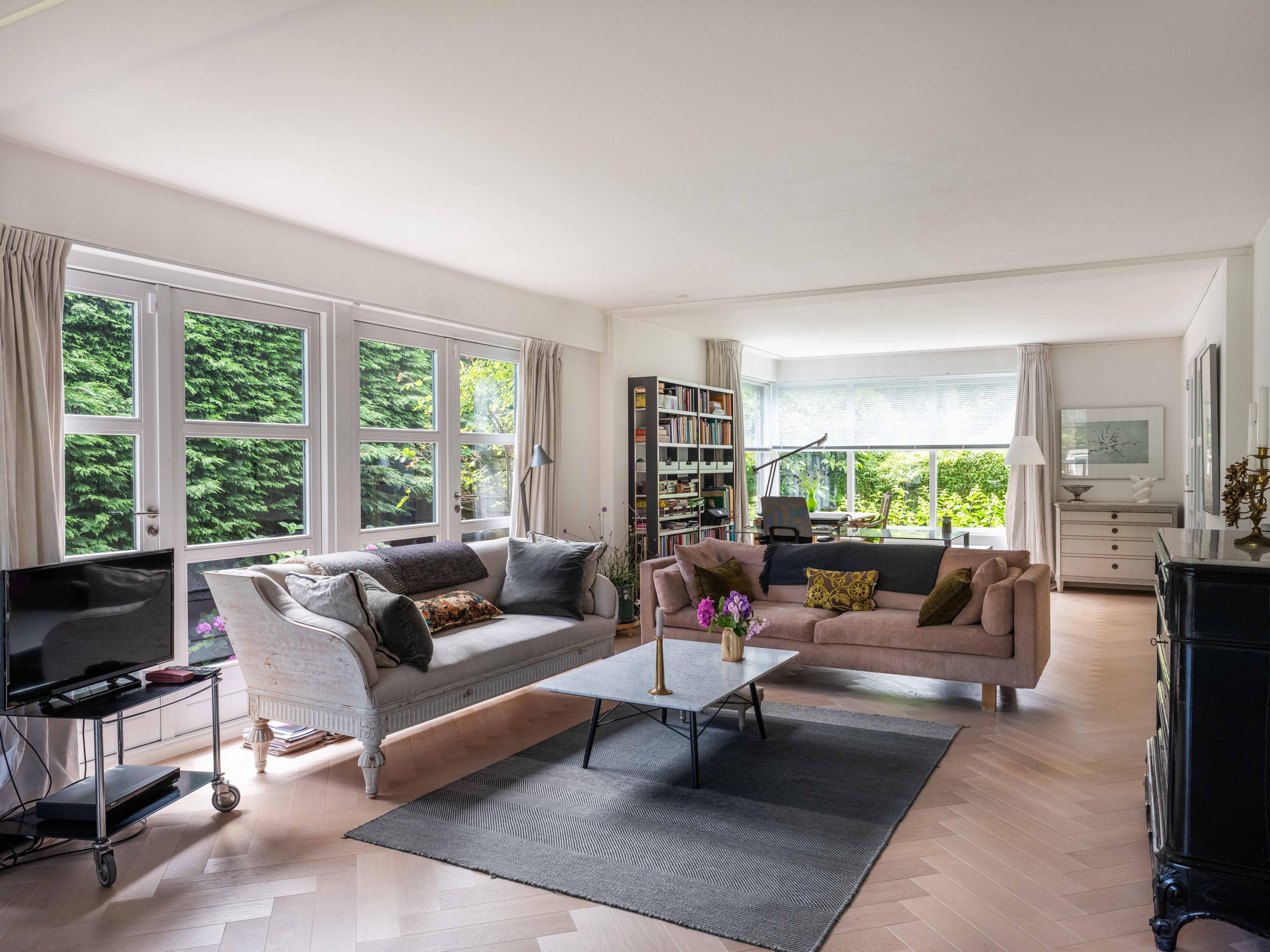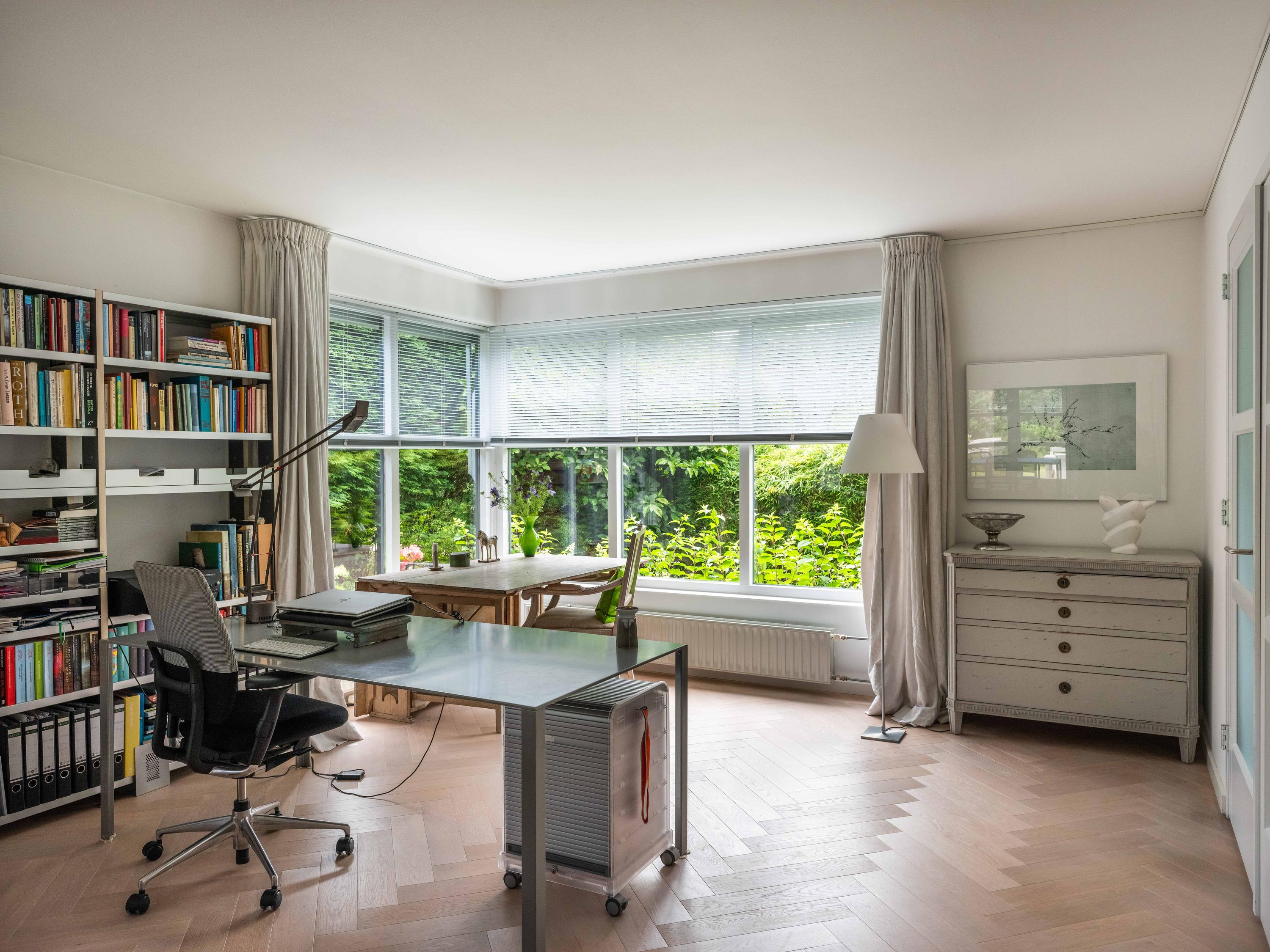 Entering through a well-proportioned hall, the rhythm of oak flooring and generous light define the expansive living area. French doors connect to a thoughtfully landscaped garden, offering multiple terraces and a sense of calm, while a dedicated work or hobby room extends the sense of purpose. The Bulthaup kitchen is appointed with an Atag oven, 5-burner stove, dishwasher and refrigerator. A former garage, now a large storage room with utility connections, enhances the sense of practical elegance.