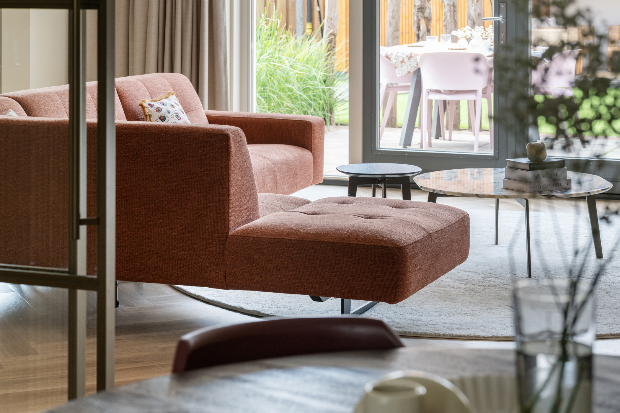 The inviting living room is bright and spacious, with the seating area at the rear. At the front, you’ll find the generous kitchen with a stylish island, finished with a luxurious marble countertop. The kitchen is fully equipped with high-end built-in appliances, including an induction cooktop with integrated extractor, oven, combination microwave, warming drawer, Quooker, fridge-freezer, and dishwasher.