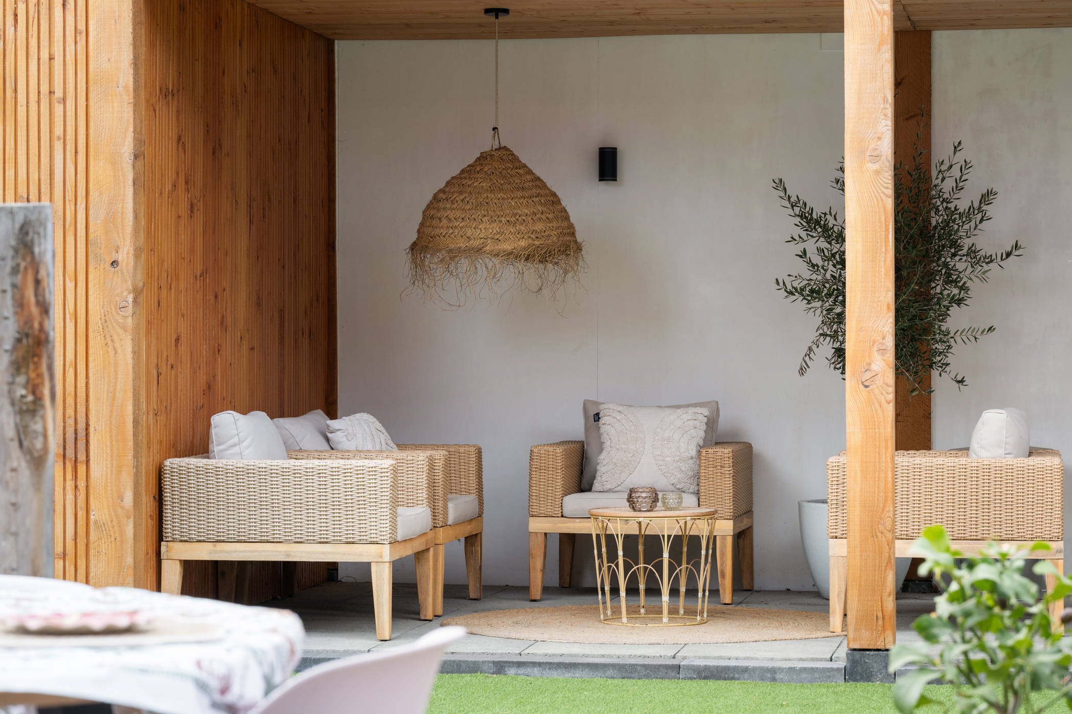 At the back is a charming covered area with storage: the perfect place to spend long evenings outdoors and enjoy the real outdoor life all year round.
