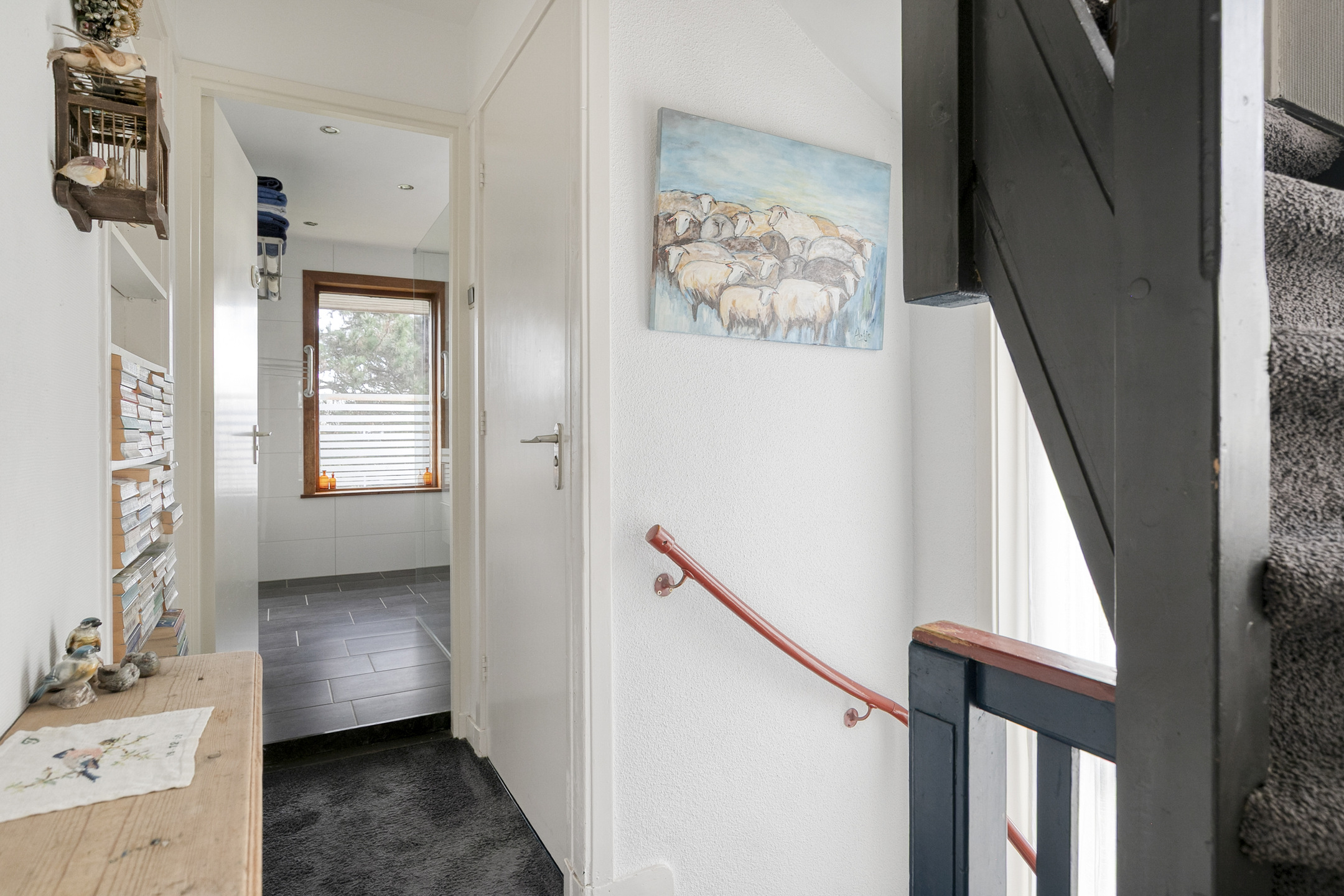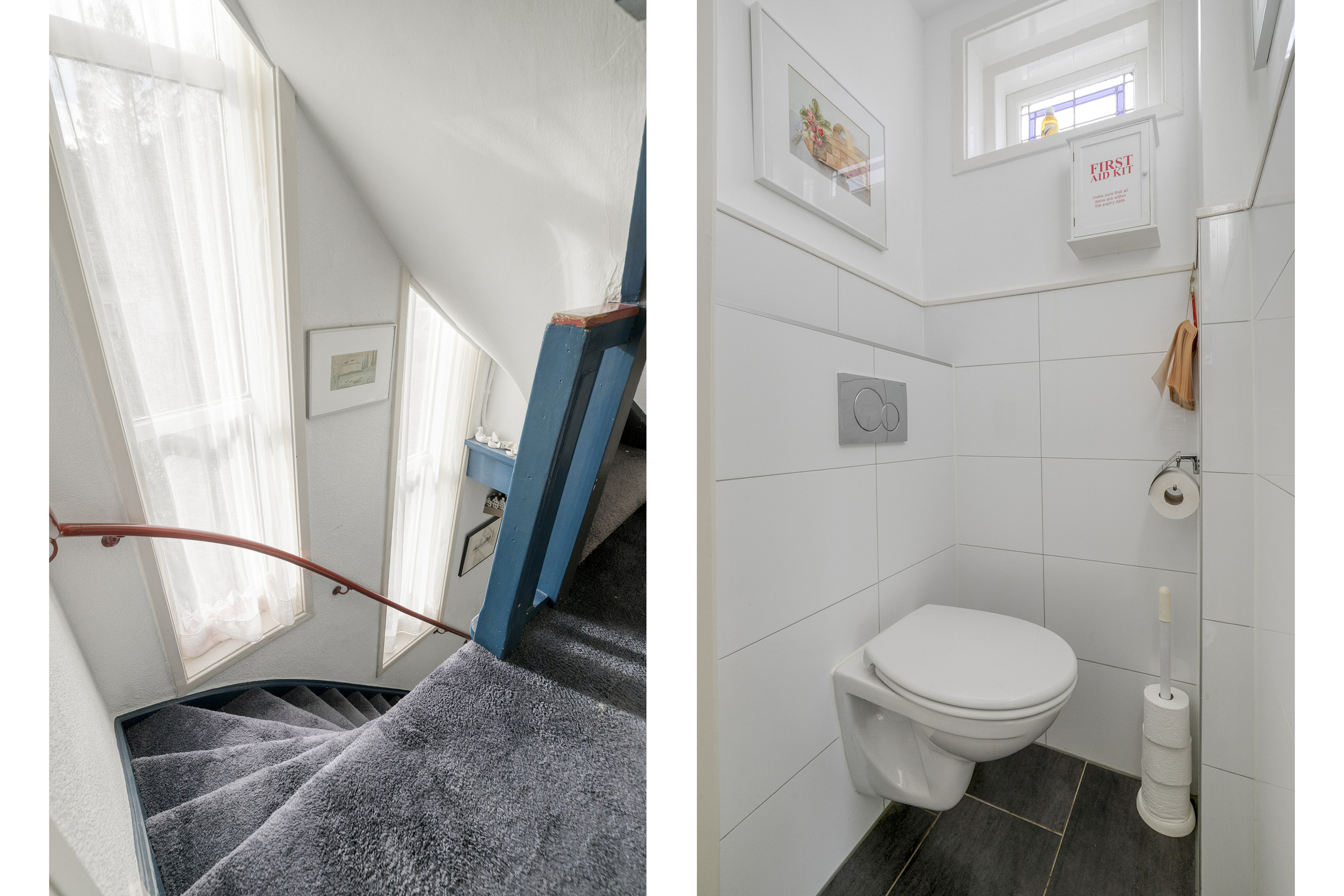 Through the entrance you step into the hall with the meter cupboard, toilet, staircase to the first floor, and access to both the living room and the basement level (souterrain).