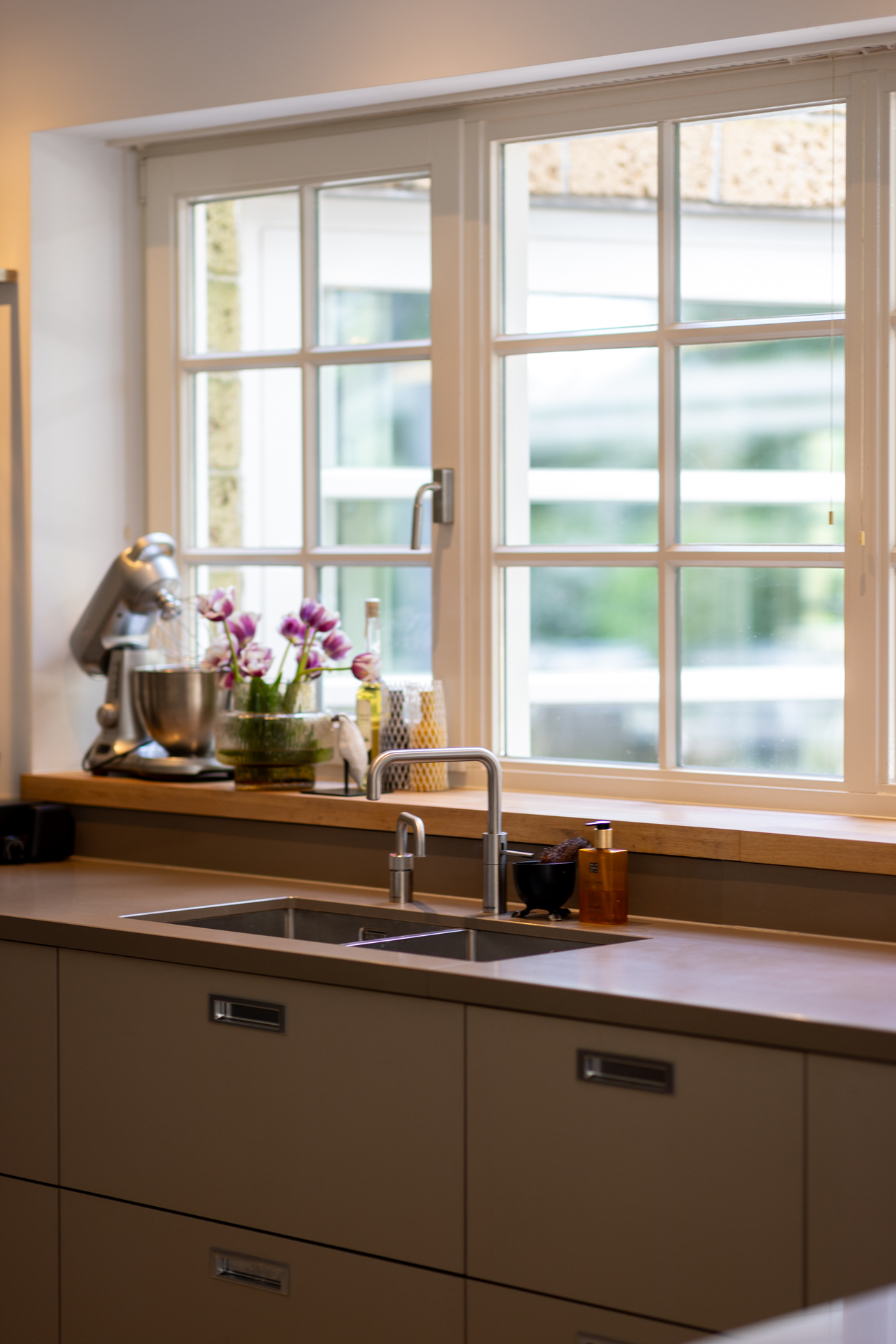 The main level is anchored by a generous living room illuminated by garden-facing windows and a gas fireplace, setting a relaxed rhythm for daily life. The custom-crafted kitchen by Antonissen Interior features premium Gaggenau appliances and connects intuitively to a covered terrace with a second outdoor kitchen, perfect for gathering throughout the seasons.