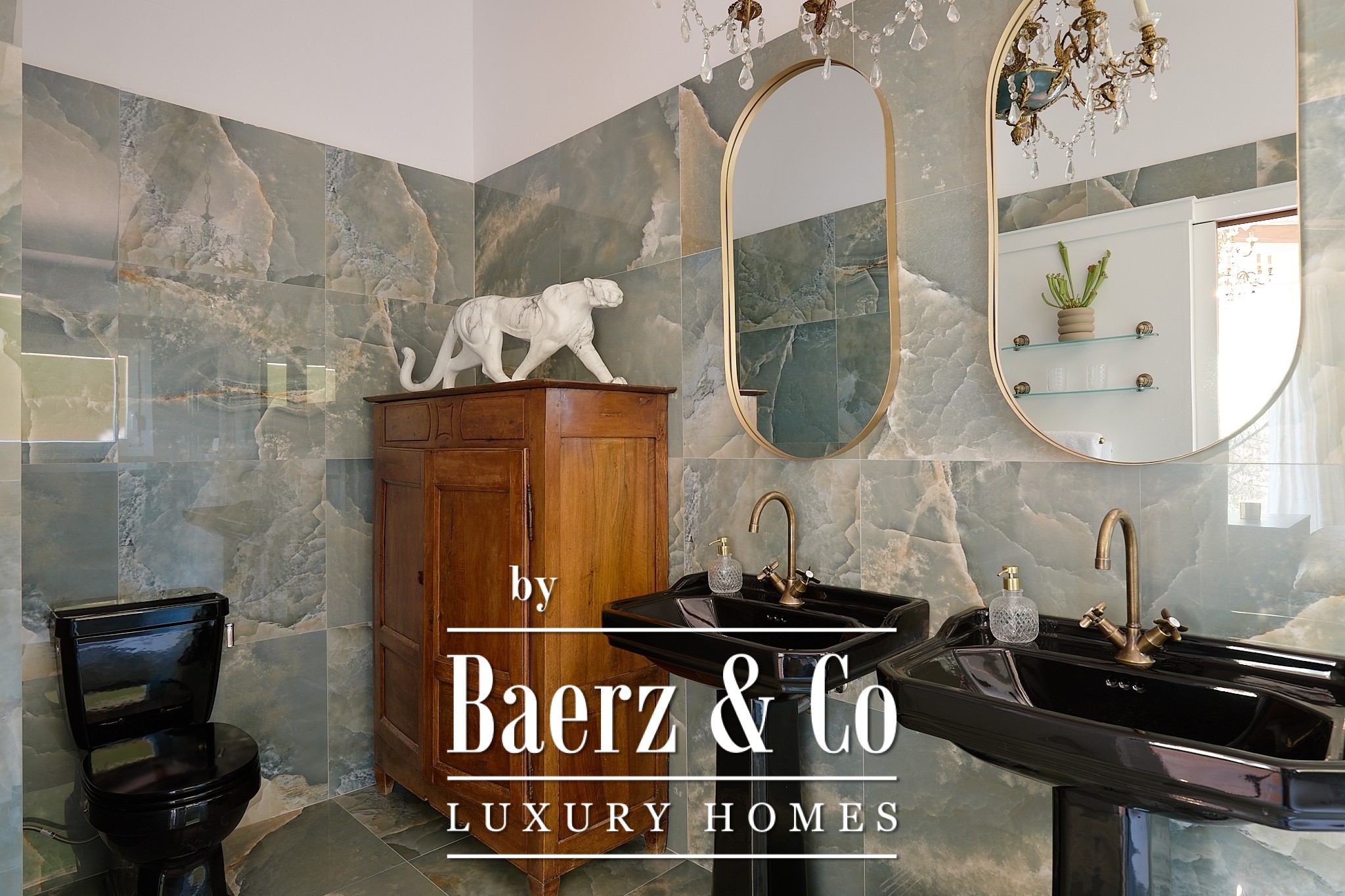A separate loft-style guest house provides guests with complete autonomy, including its own kitchen and bathroom. Outside, a new swimming pool, solarium, landscaped gardens, and a covered dining and barbecue area evoke authentic Mediterranean retreat. A large private garage accentuates practical luxury.