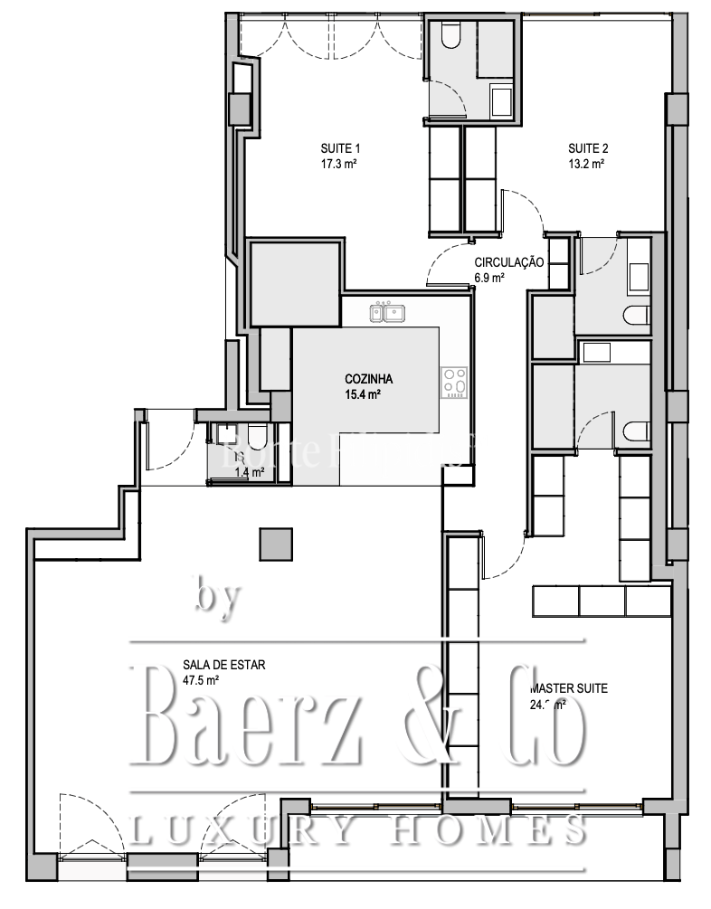 The private wing comprises three suites: a principal suite of 24 m², and two additional suites of 17 m² and 13 m², each designed to afford quiet intimacy. A dedicated laundry room and guest bathroom enhance functionality. Set in Amoreiras, one of Lisbon’s most central neighbourhoods, the property enjoys swift access to international schools, transport, shopping at the Amoreiras Center, and the green expanse of the city’s landscaped gardens. This luxury apartment for sale in Lisbon Amoreiras offers a rare equilibrium between vibrant urban living and considered private retreat.