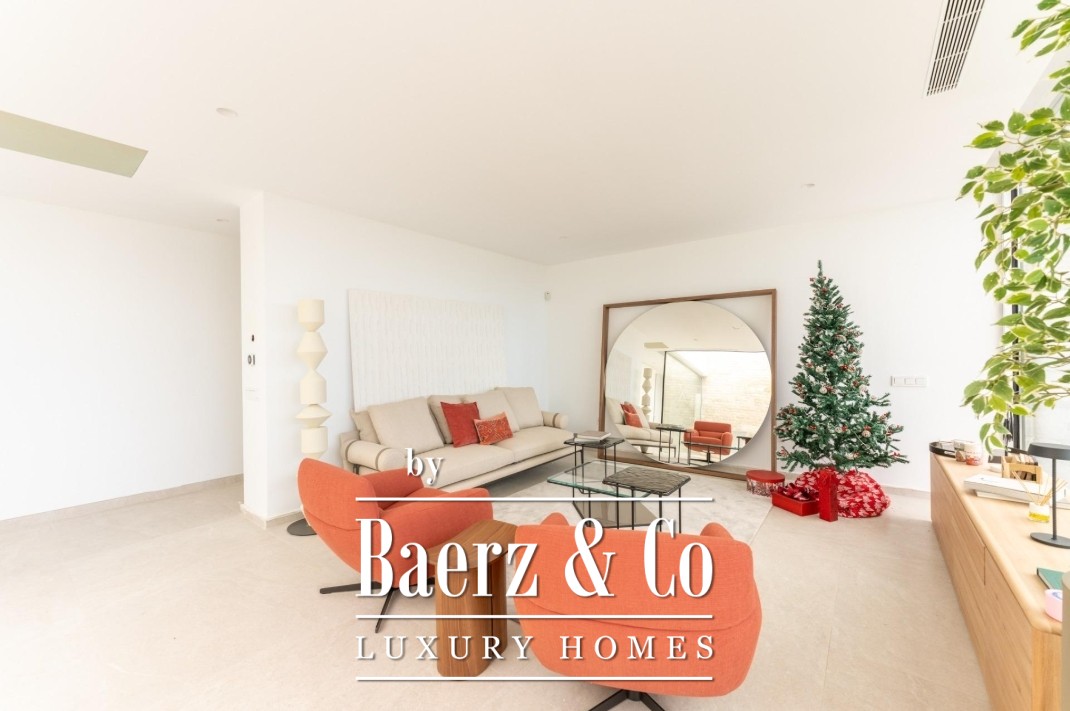 The entrance leads to the upper floor, where you’ll find the living room, equipped open-plan kitchen with central island, 2 of the bedrooms and a guest toilet. Floor-to-ceiling glass sliding doors flood the villa with natural light. A patio serves as a convenient outdoor dining space, even though there is ample room on the terrace as well. Right outside the living room is the terrace with private pool and outdoor shower.
