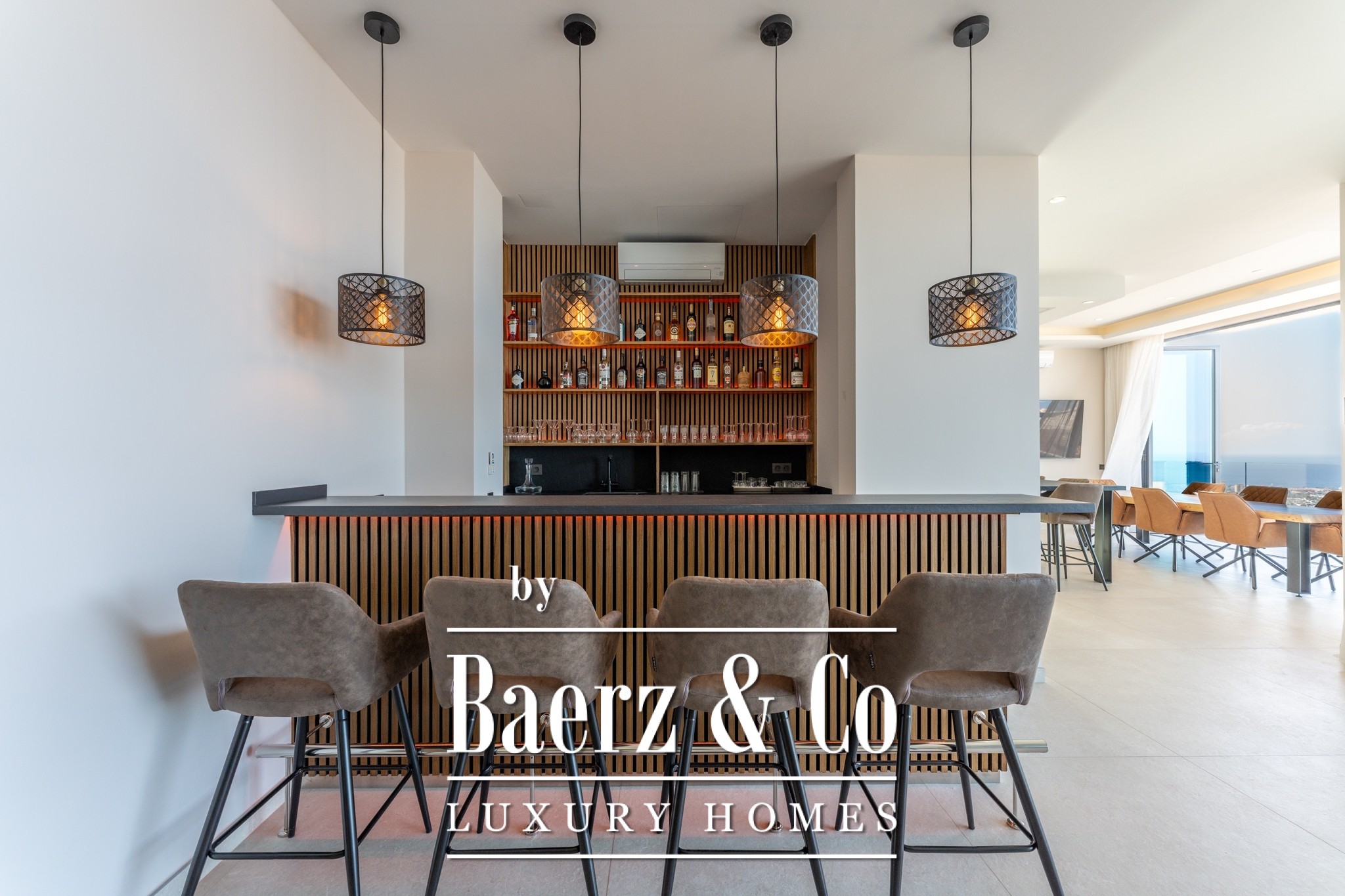 Built to the highest standards and with beautifully designed spaces, this elegant villa is a unique oasis of luxury and privacy. It covers a plot of 605 m² with a built area of 631 m² spread over three floors, which are connected by a lift. The ceiling height of 3.20 metres and large glass walls allow plenty of light to enter and offer a panoramic view of the sea and coastline.