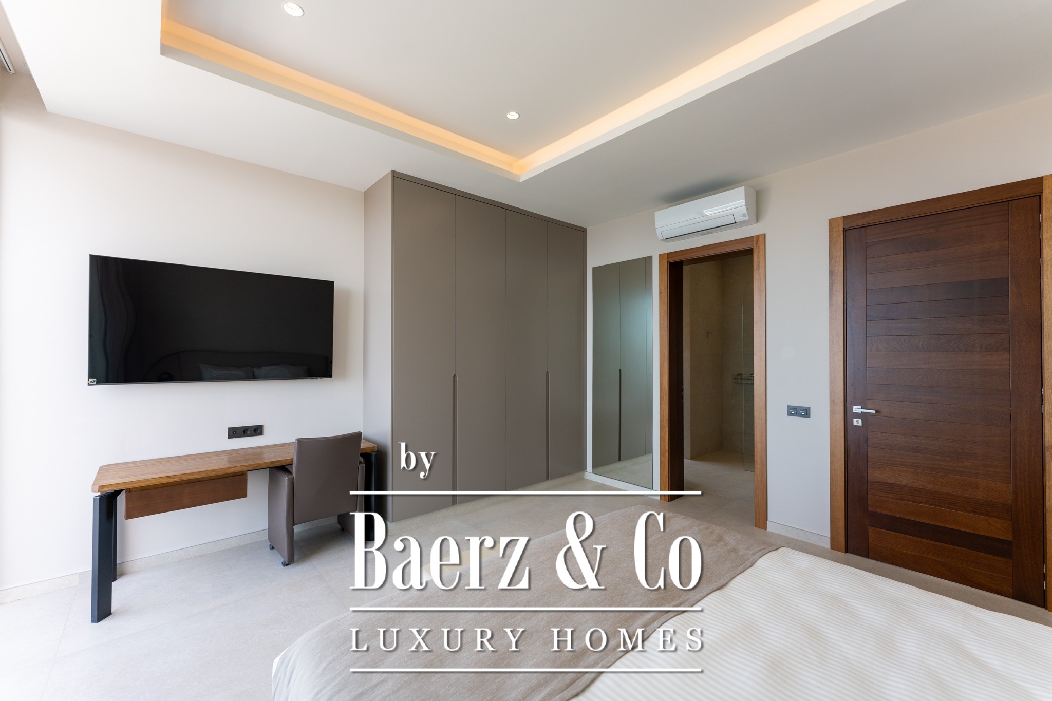 On the ground floor, you will find one of the bedrooms, a spacious living room with a bar for entertainment and a sleek designer kitchen, all finished to an impeccable standard. The villa has a total of 4 spacious en-suite bedrooms and a total of 6 beautiful bathrooms and a guest apartment with kitchen.