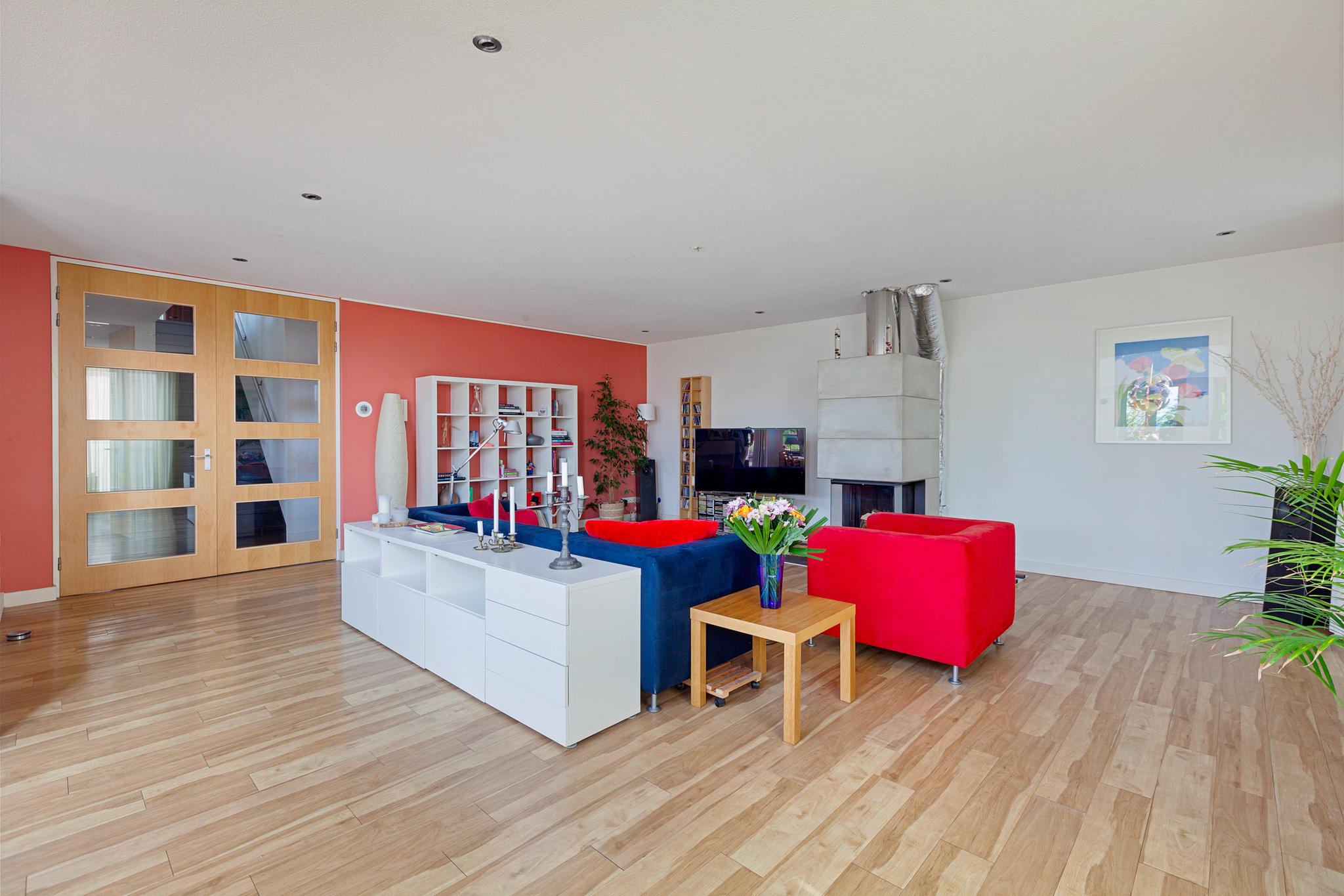 Entrance to the apartment. Spacious hallway providing access to various rooms. Exceptionally large living room with a cozy seating area and a large fireplace/stove. The bright dining area immediately stands out due to the unique ceiling height of no less than 5.50 meters, thanks to the mezzanine! During construction, this height was deliberately created to allow for the installation of a striking chandelier. The dining area provides access to a lovely sunroom on the terrace and to the open kitchen. The kitchen is modern, offers ample cupboard space, and is equipped with luxurious built-in appliances, including a fridge, freezer, microwave, oven, induction cooktop, extractor hood, dishwasher, and Quooker. The master bedroom is located on the northeast side of the apartment and is beautifully furnished with ample built-in wardrobes. From this bedroom, you can access a luxurious and spacious bathroom equipped with a walk-in shower, (whirlpool) bath with star ceiling, sauna, toilet, and a vanity unit – a wonderful space to fully unwind.