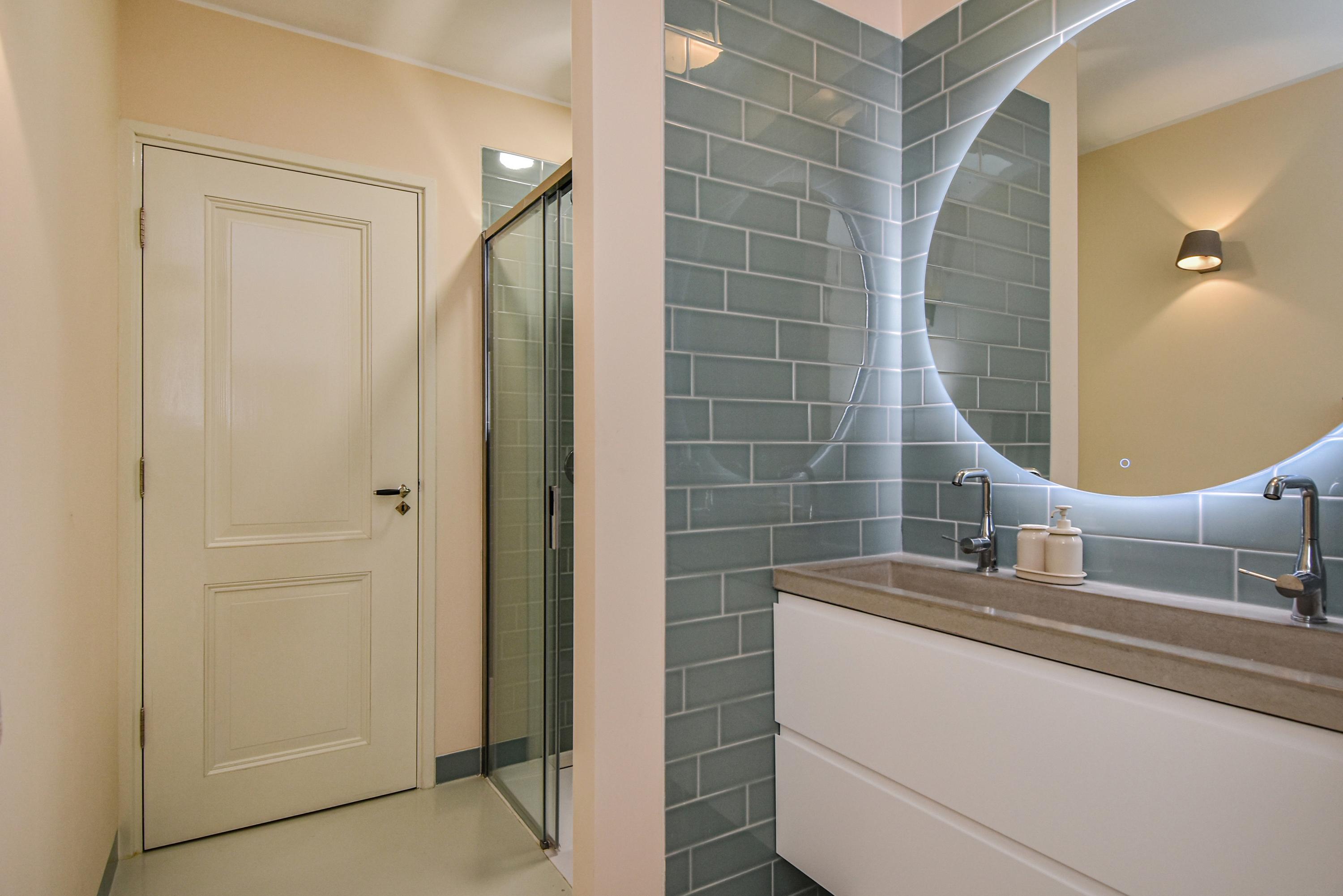 Upon entering, you are immediately impressed by the beautiful living kitchen with its strikingly high glass façades and an impressive ceiling height of no less than 3.55 meters. The original stucco decorative moulding has been preserved. The space is filled with light and offers ample room for a large dining table. The stylishly finished kitchen forms the heart of the home—a wonderful space equipped with luxury built-in appliances, perfect for cooking and entertaining guests.
