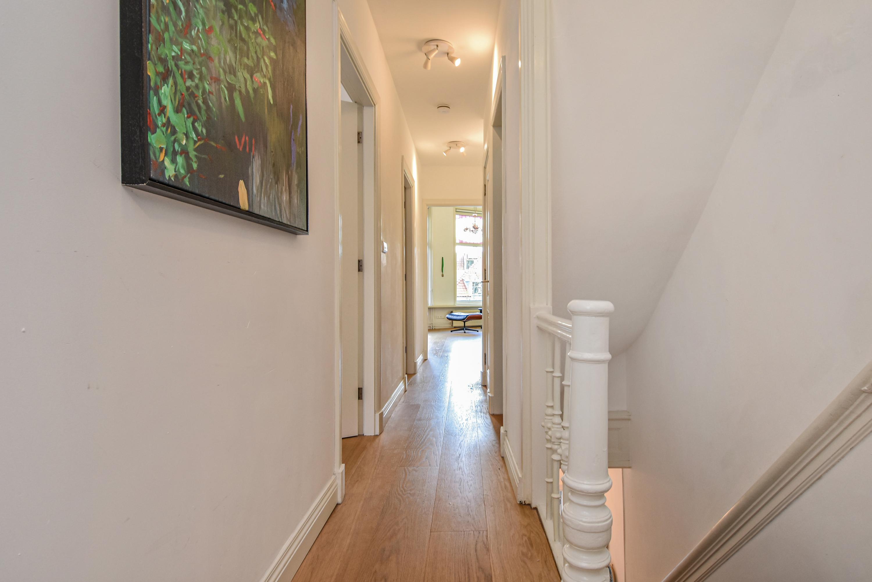 The landing provides access to a separate toilet with washbasin and additional storage space. The spacious and bright front bedroom features a high ceiling and a beautiful view over the canal. There are two additional large bedrooms, one with a walk-in shower and washbasin. All bedrooms are adorned with stained-glass windows. A separate laundry room gives access to the roof garden—a delightful, sheltered spot with optimal sunlight. From early morning until late evening, you can enjoy the sun, privacy, and a charming green setting. The terrace also includes a large wooden storage shed.