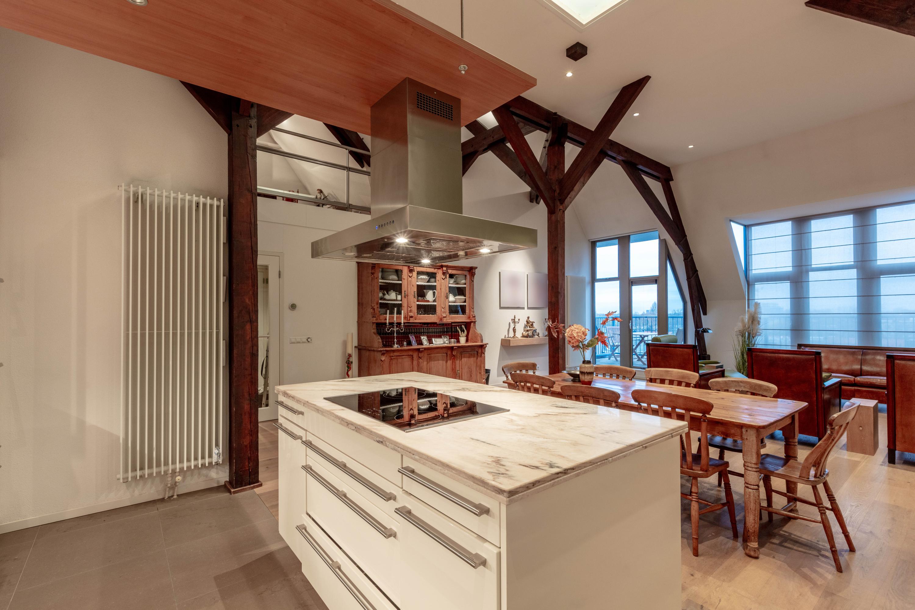 De bijzonder sfeervolle woonkamer is indrukwekkend door de unieke hoogte en fraaie zichtbare kapconstructie. De open keuken bevindt zich aan de achterzijde en beschikt over een kookeiland, volop kastruimte en diverse inbouwapparatuur. Vanuit de keuken is er prettig zicht op de woonkamer met een gezellig zitgedeelte en een apart eetgedeelte.