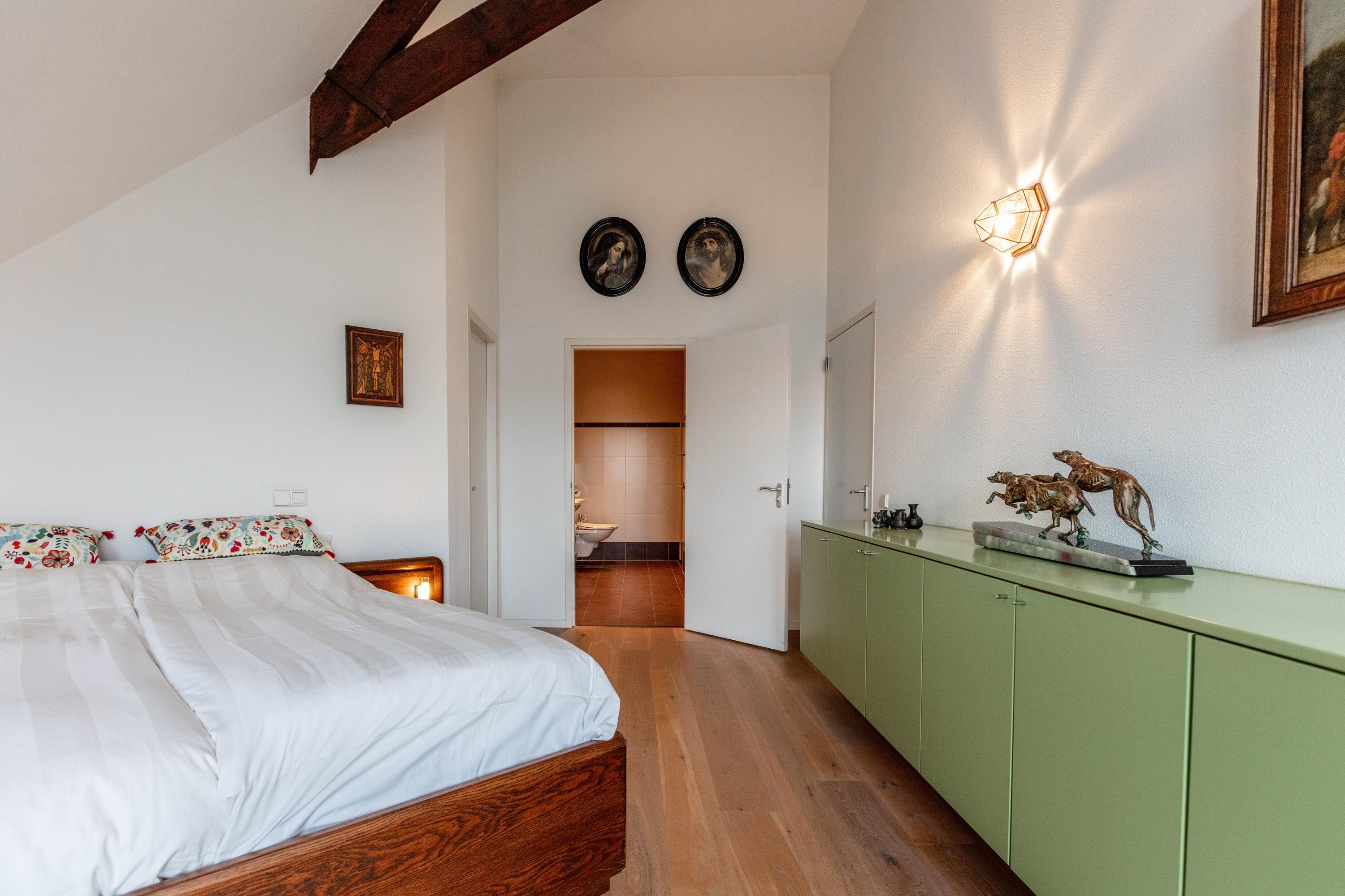 De grootste slaapkamer is in gebruik als masterbedroom en beschikt over een royale inloopkast en een aangrenzende ruime badkamer met inloopdouche, tweede toilet, bidet, ligbad en een badkamermeubel met dubbele wastafel.