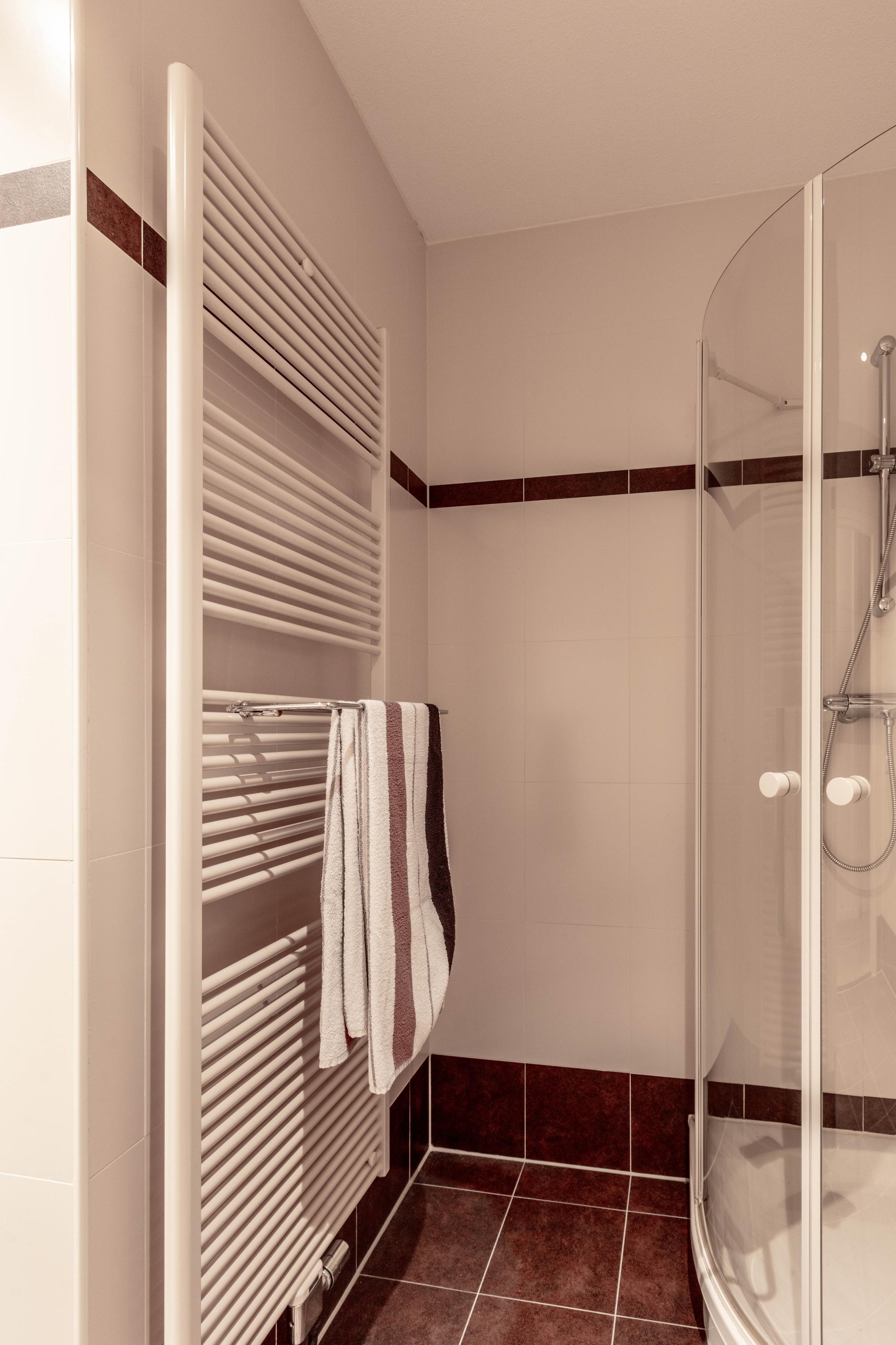 De tweede slaapkamer is ook voorzien van dakvensters en heeft eveneens een eigen badkamer met douche en wastafel.