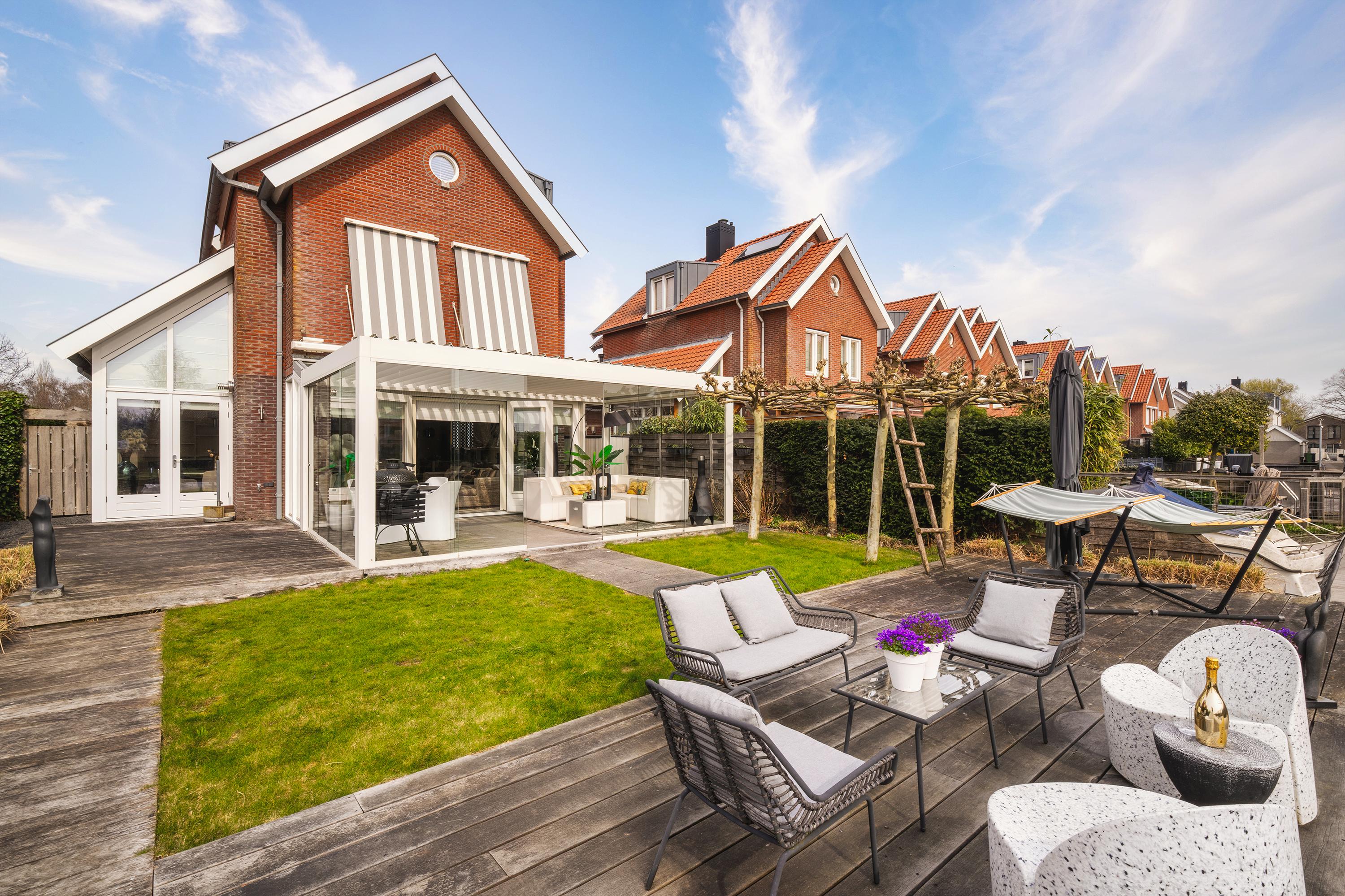 The garden is beautifully landscaped and thoughtfully designed. Located on the water with a private mooring for a sloop and a swimming ladder to enjoy the open water directly. Whether you are lying in the hammock or sitting on the terrace by the water, the view of the water and Het Twiske never gets boring. The garden has drip irrigation for optimal watering and atmospheric lighting with 12V spots. Under the canopy with louvered tilting roof and glass sliding doors (with integrated drainage function), you can enjoy it all year round.