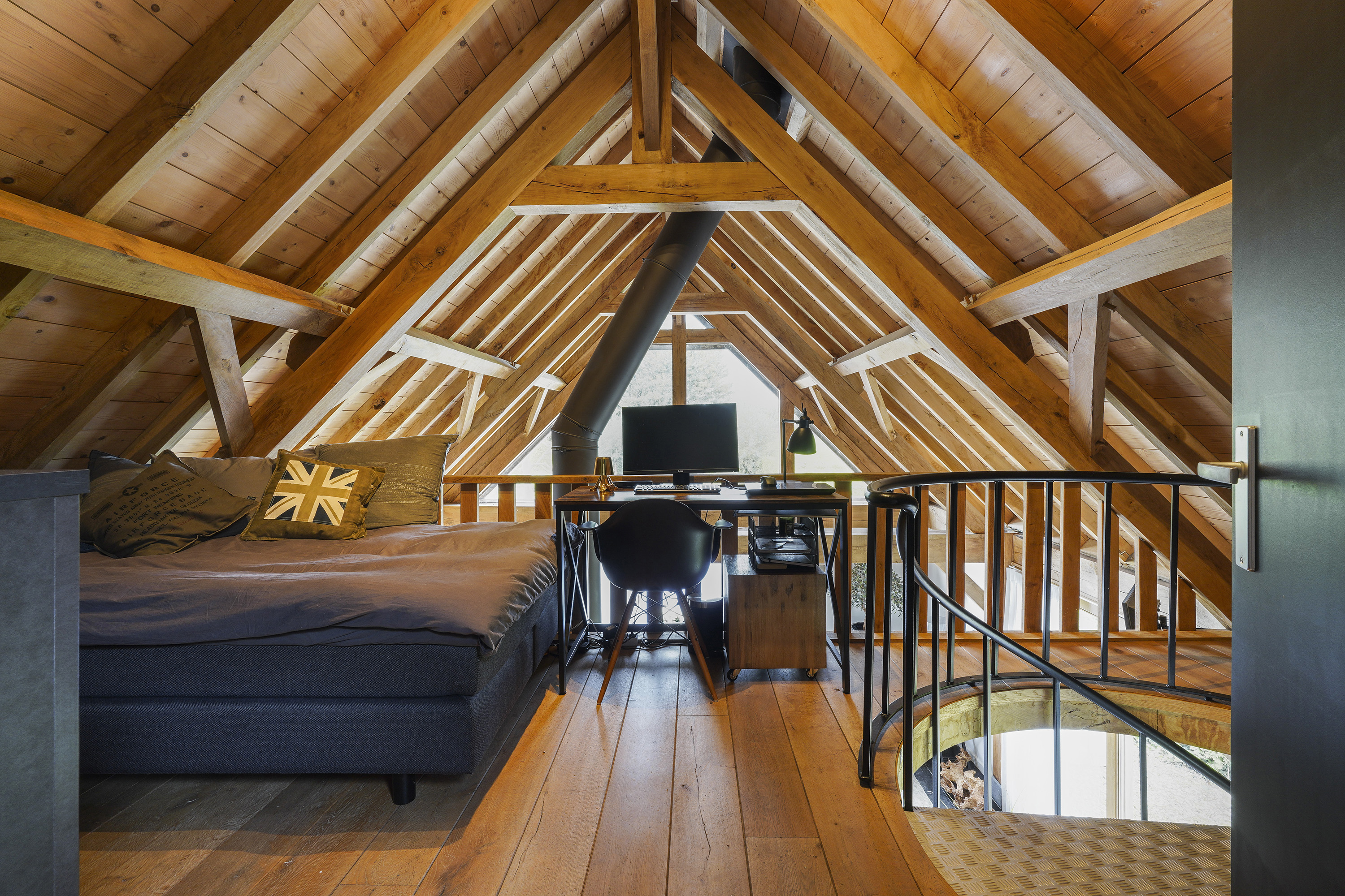 The 323 m² main residence offers six bedrooms and two bathrooms, including a master suite with freestanding bath and walk-in shower. Living spaces are wrapped in light, punctuated by restored oak floors, original beams, and a tunnel fireplace. The kitchen anchors the home with Belgian blue stone beneath and modern appliances, while an oak-floored billiard room and mezzanine office reinforce the villa’s balance of relaxation and productivity.