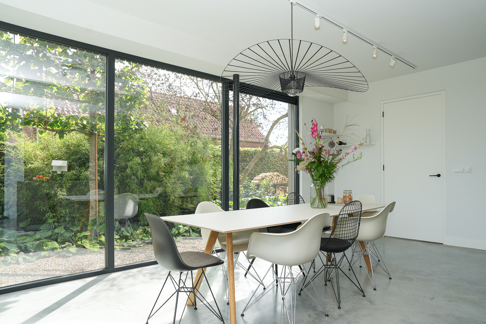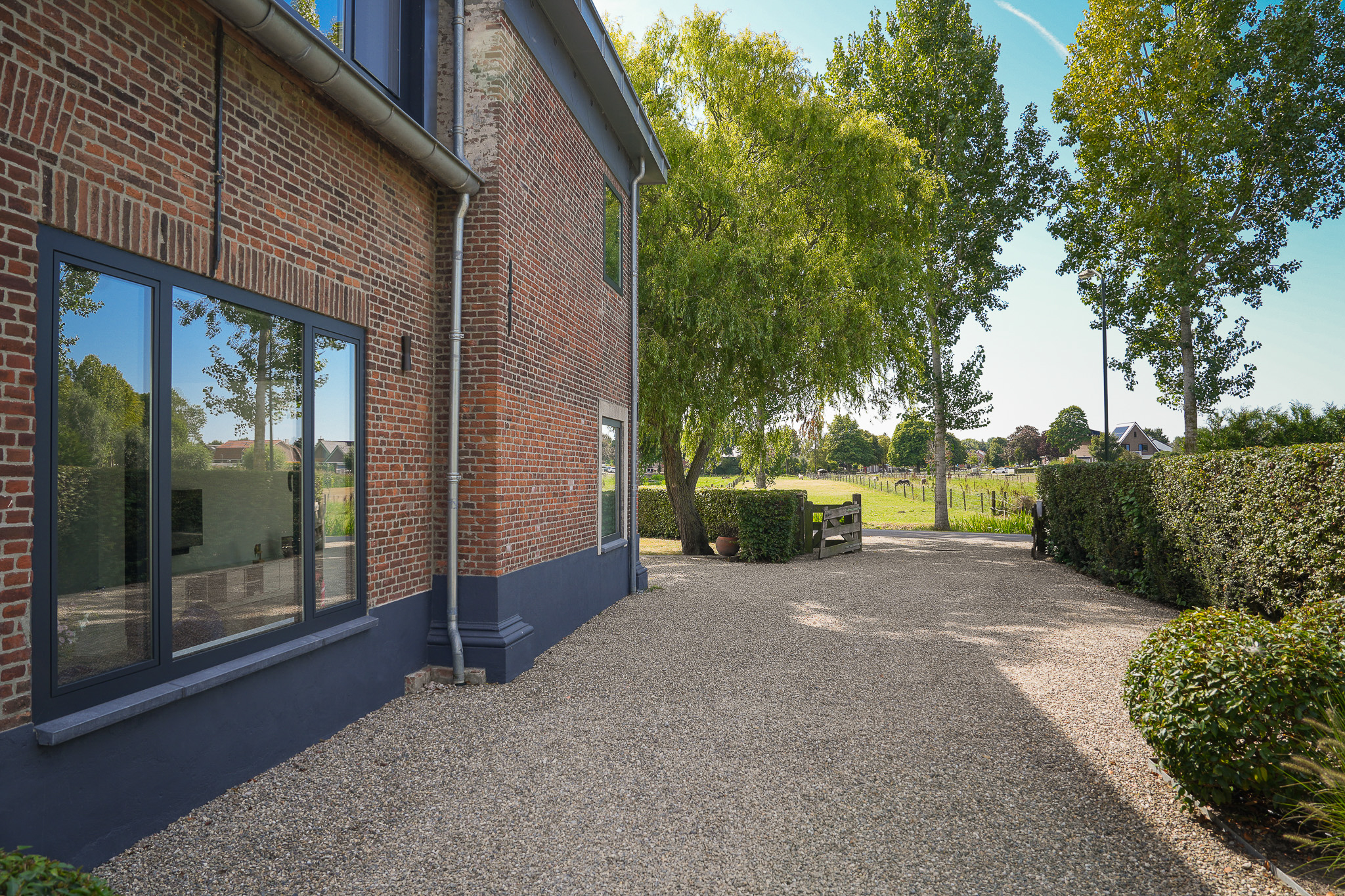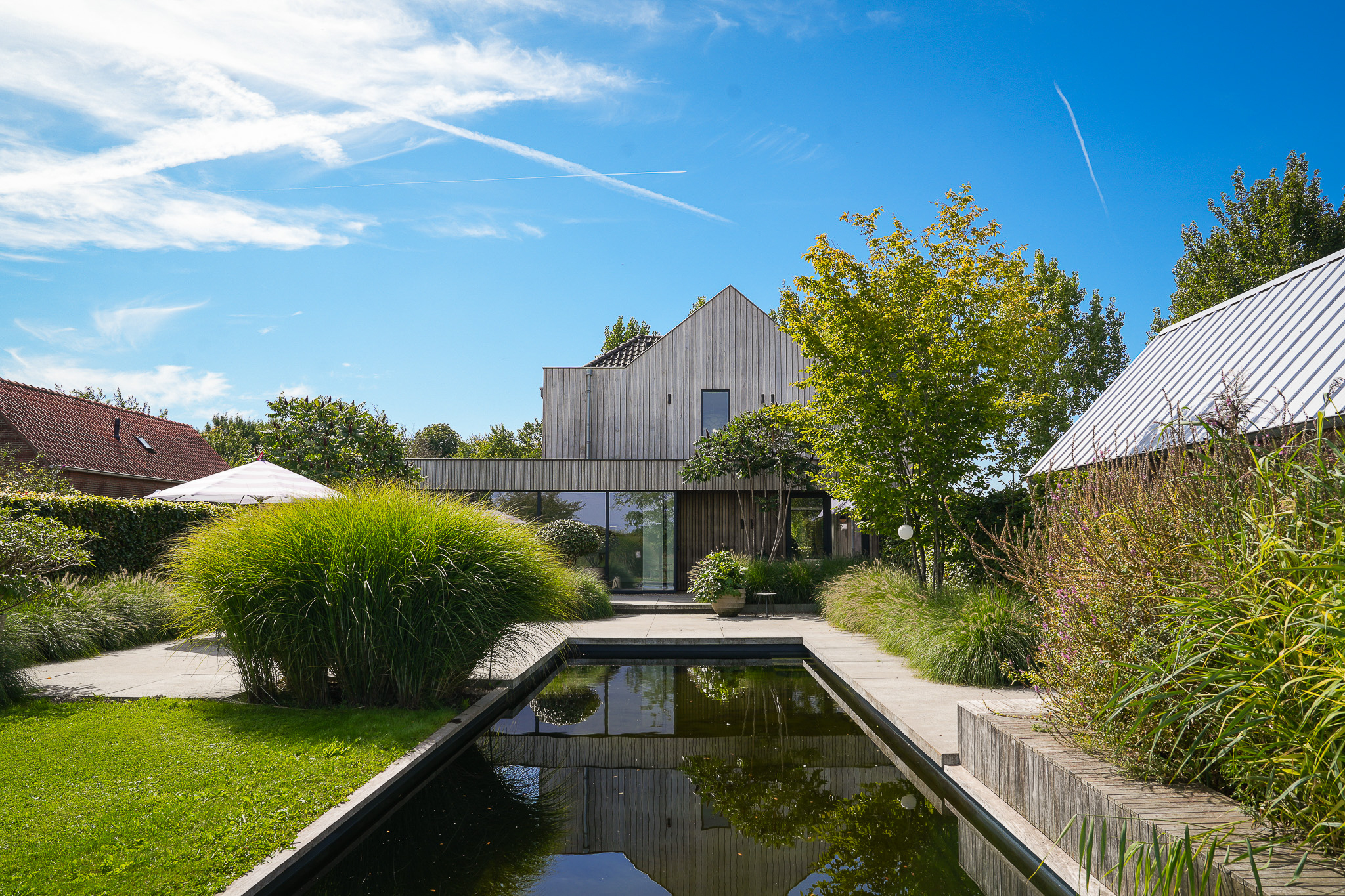 The kitchen extension is a true showpiece, with its glass walls creating a seamless connection to the garden. Indoors you enjoy light and space, outdoors awaits a landscaped green oasis with terraces and a swimming pond. Here, style, comfort and outdoor living come together.