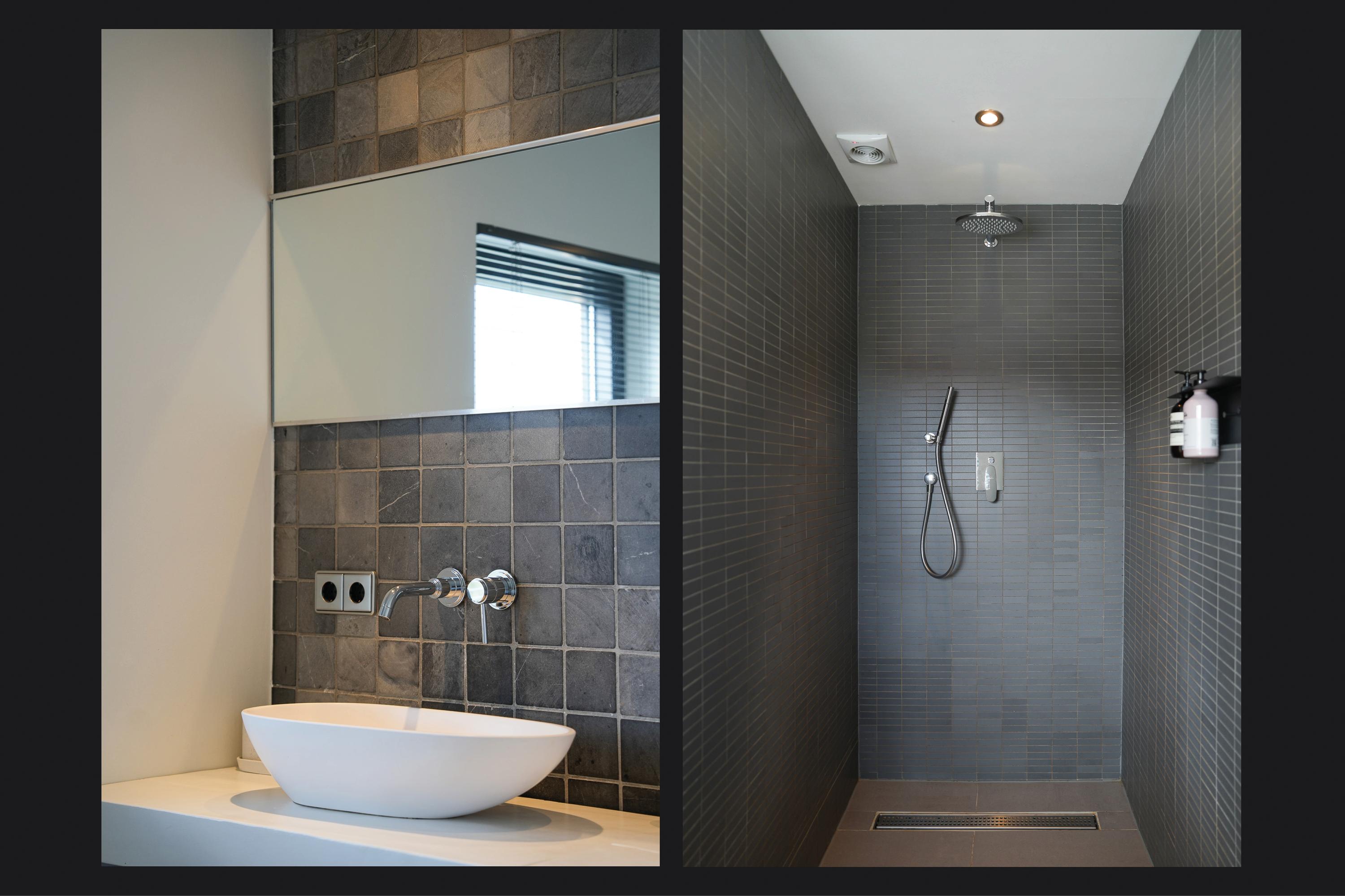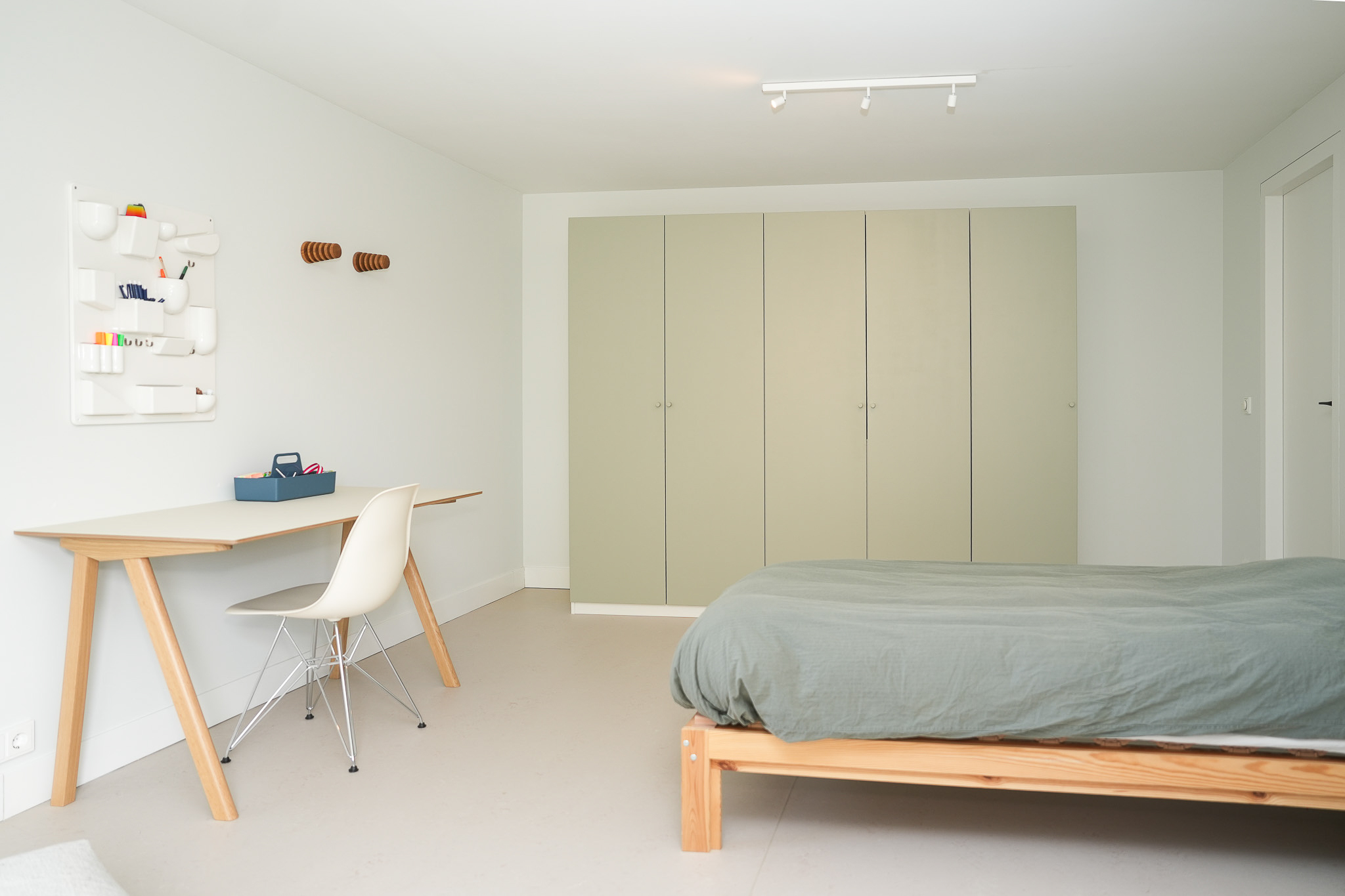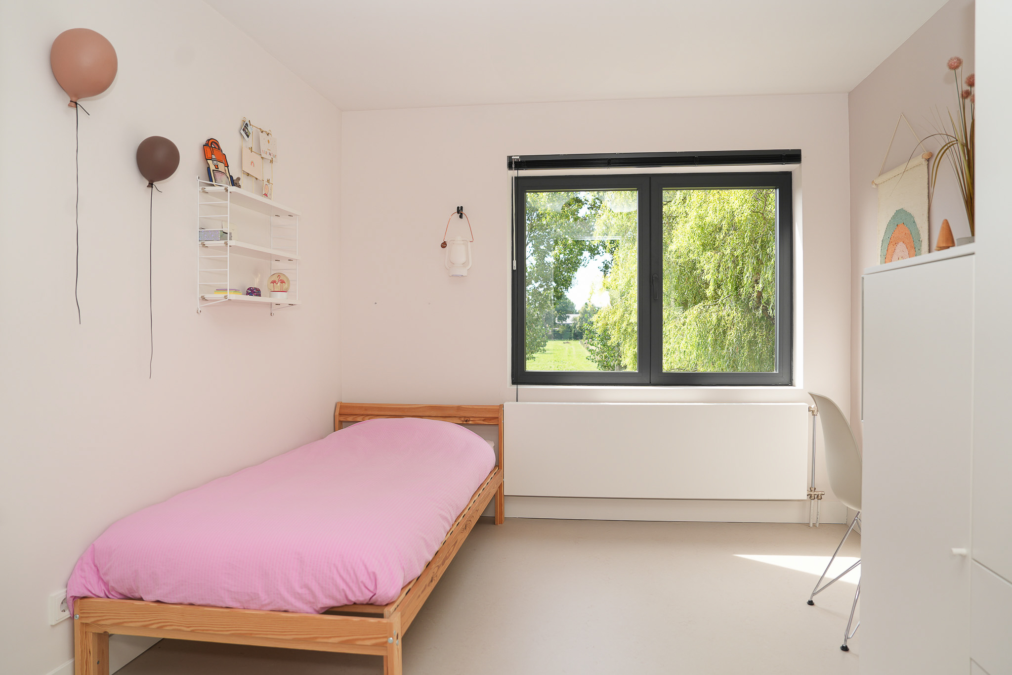 The entrance is centrally located behind the stately front door. The hallway, with its striking metal staircase, links the various rooms. To the left is the bright and atmospheric living room, with large windows, a modern poured floor and aluminium frames with HR++ glazing overlooking the driveway. A contemporary wood stove adds extra comfort on winter days. To the right is a second room, currently used as a playroom, but equally suitable as a study or fifth bedroom.