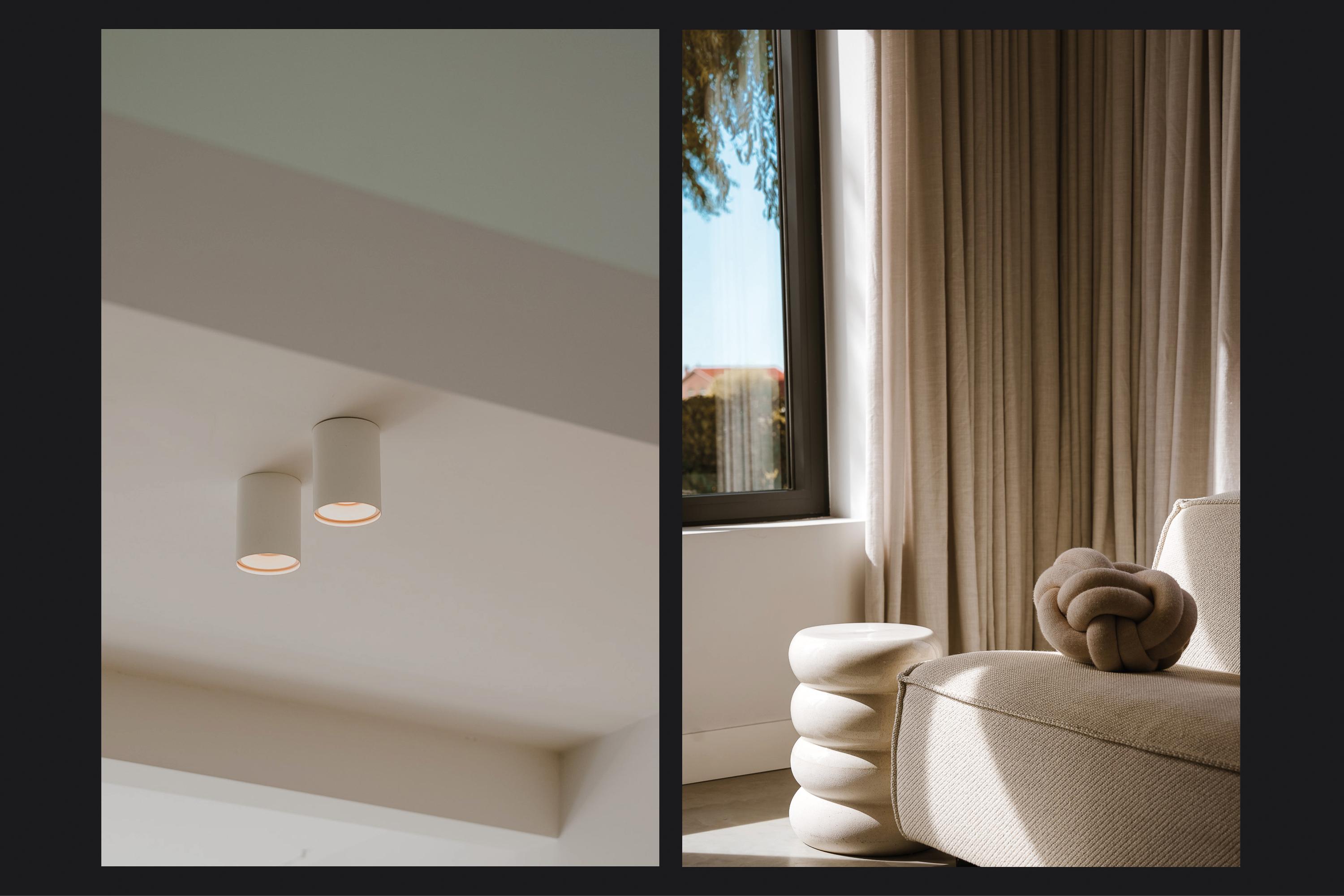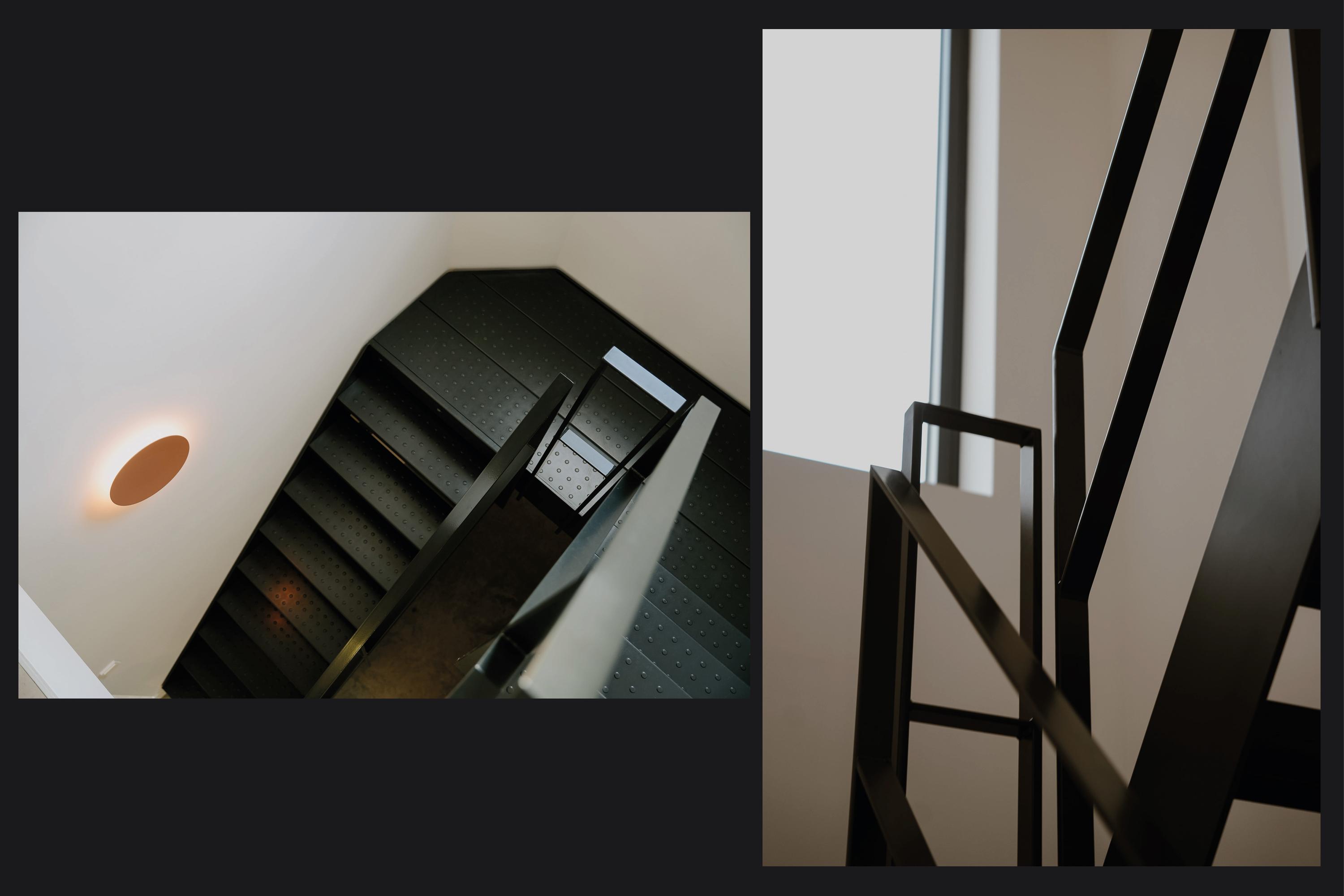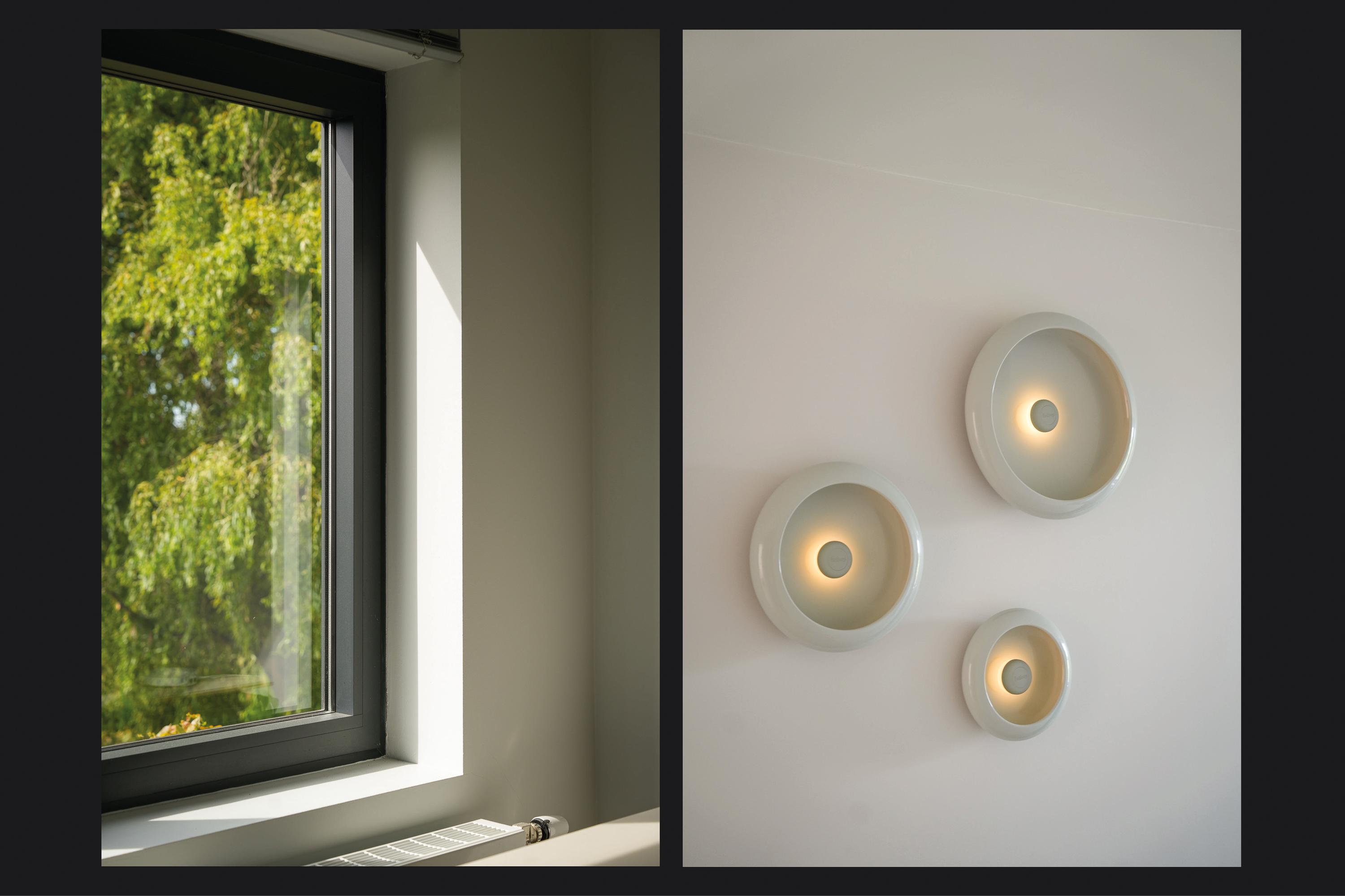 The entrance is centrally located behind the stately front door. The hallway, with its striking metal staircase, links the various rooms. To the left is the bright and atmospheric living room, with large windows, a modern poured floor and aluminium frames with HR++ glazing overlooking the driveway. A contemporary wood stove adds extra comfort on winter days. To the right is a second room, currently used as a playroom, but equally suitable as a study or fifth bedroom.