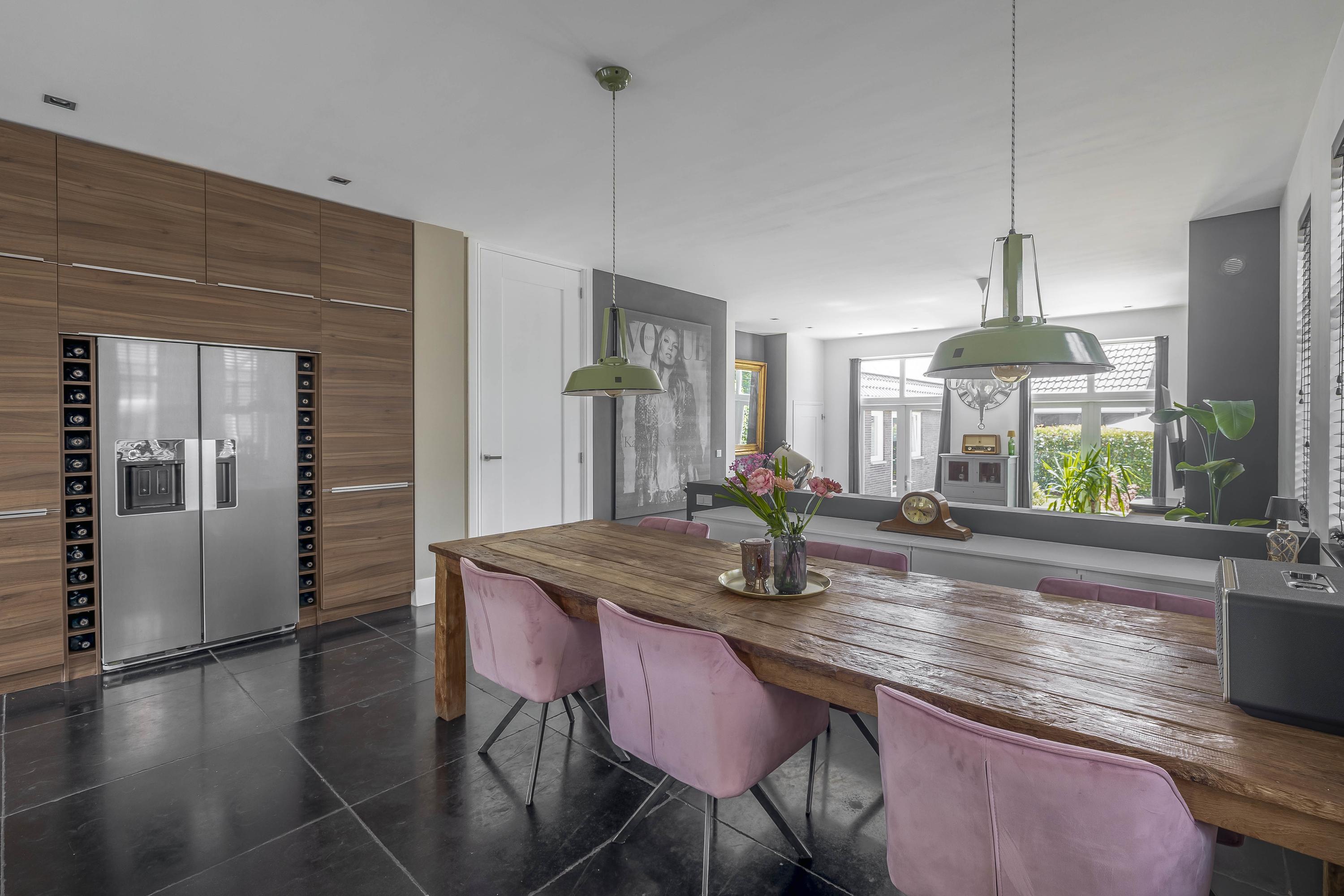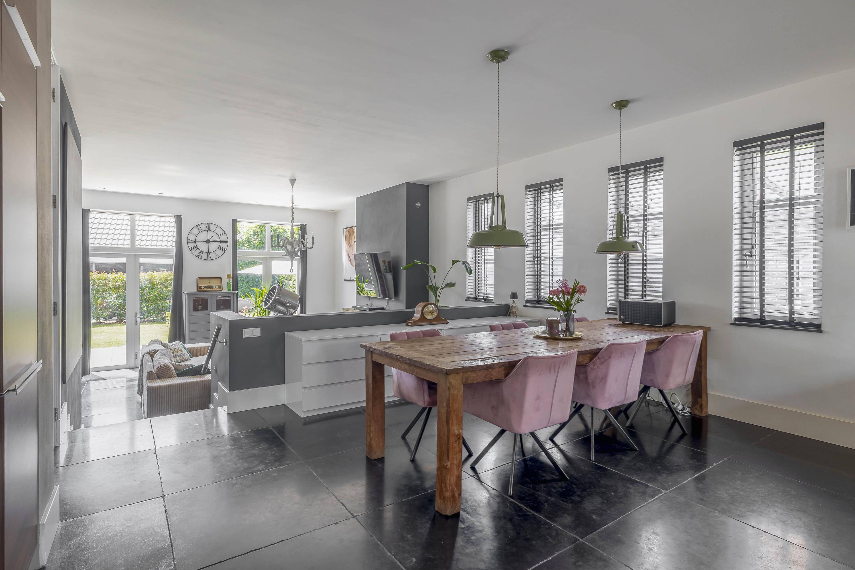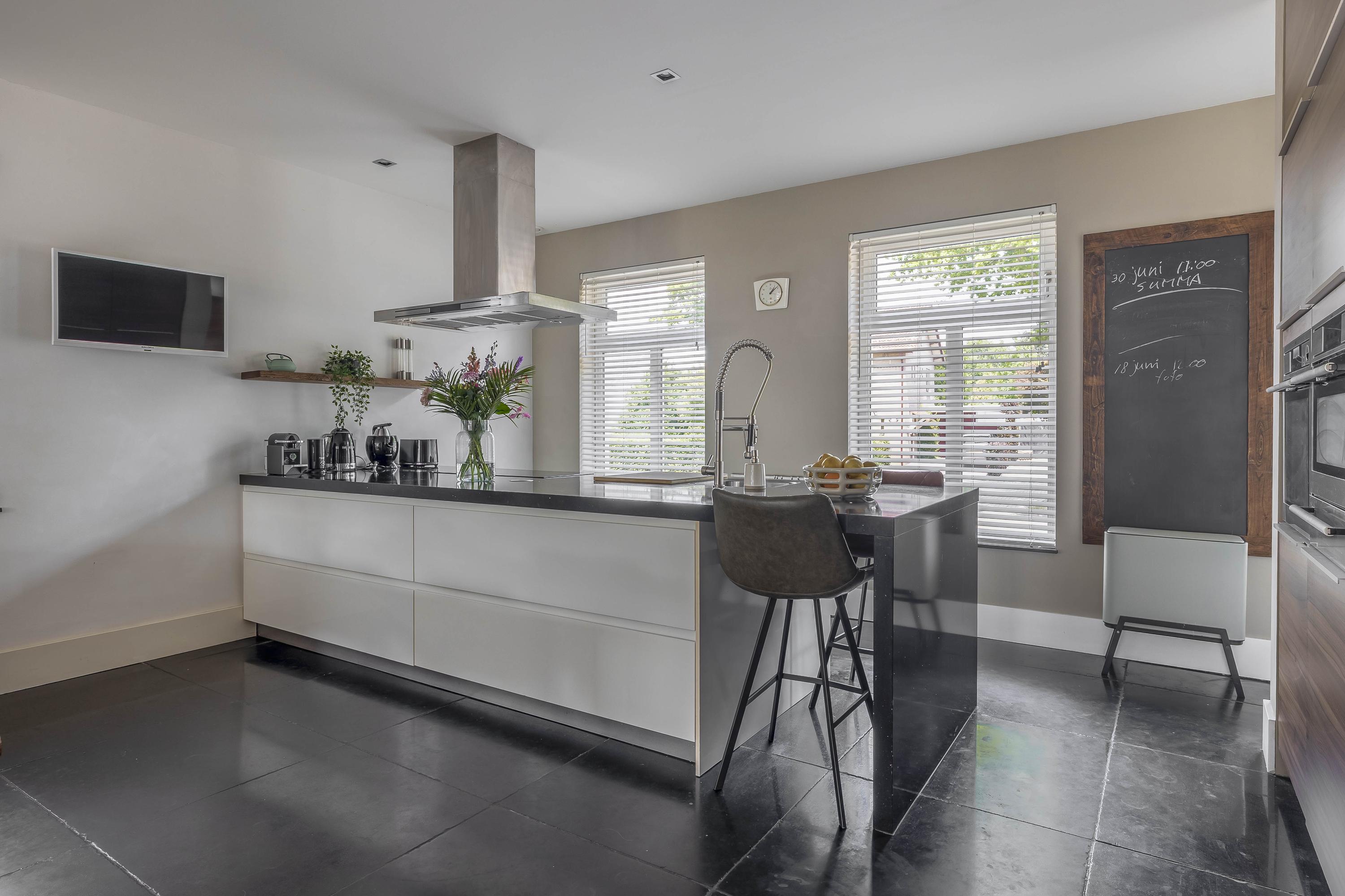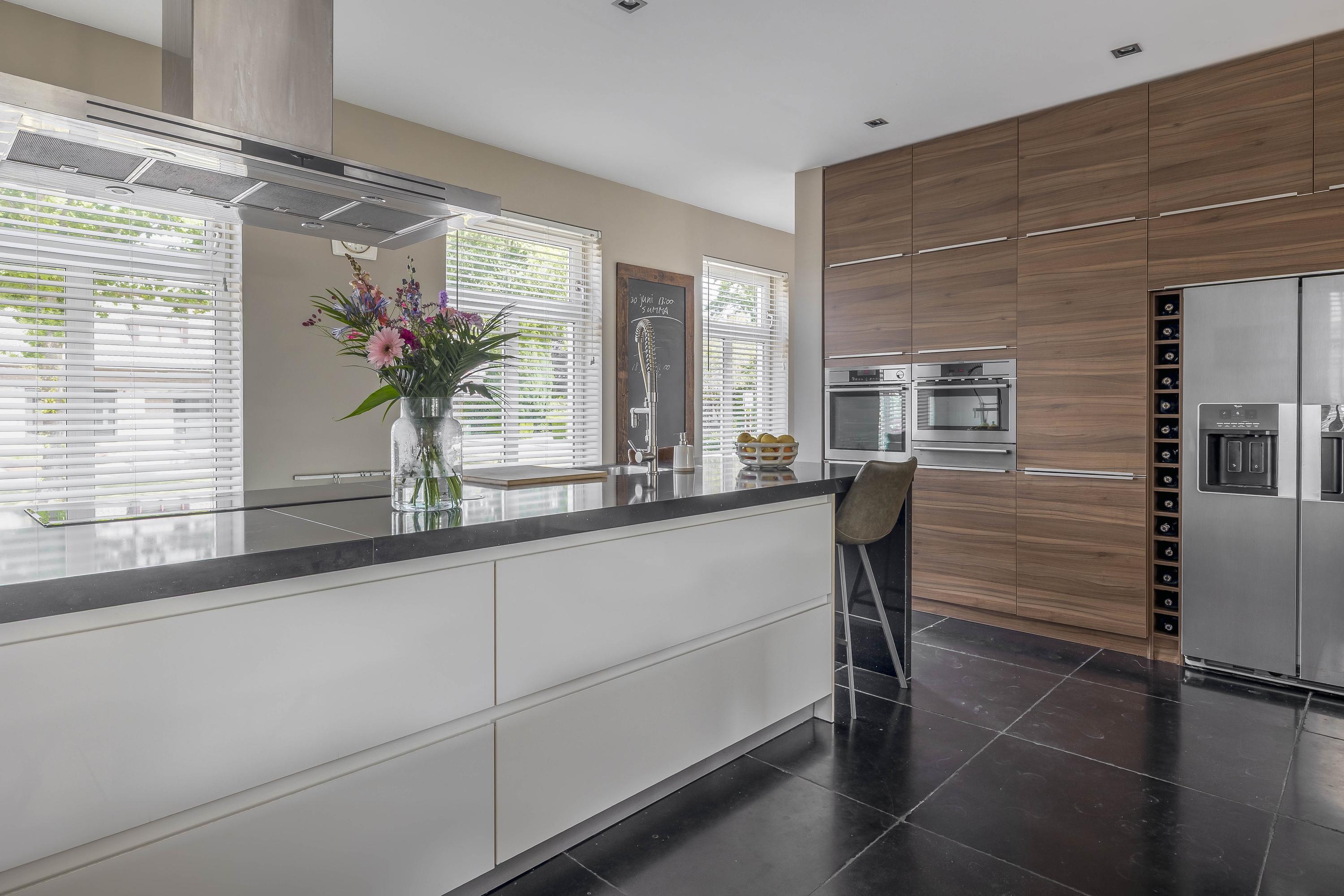 Through the spacious entrance with beautiful tiled floor, modern toilet and extensive meter cupboard, you enter the kitchen at the front of the house. This stylish and complete kitchen is the heart of the house and features a kitchen island, luxury appliances and plenty of workspace. Thanks to the raised floor level, you have a beautiful view of the street.