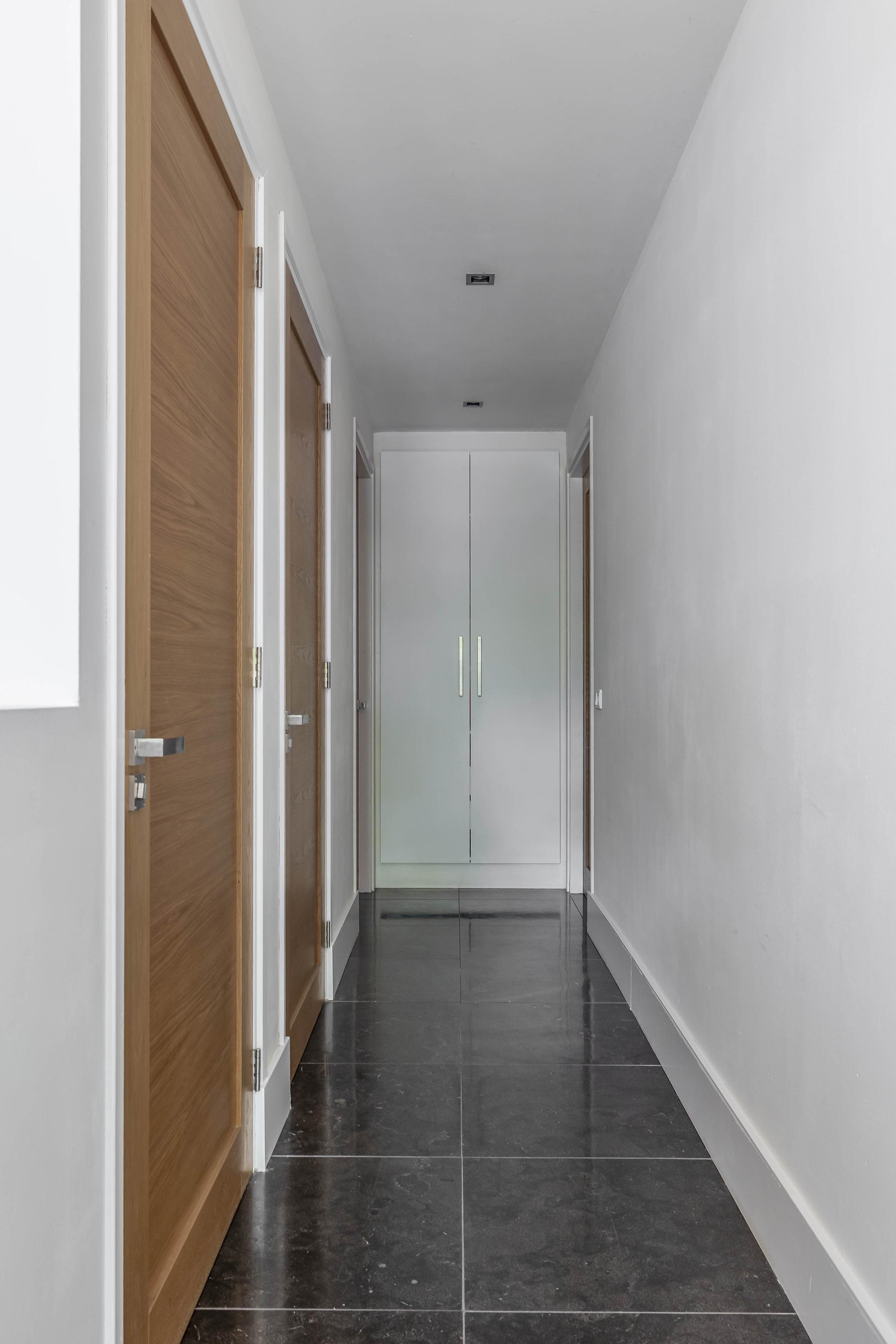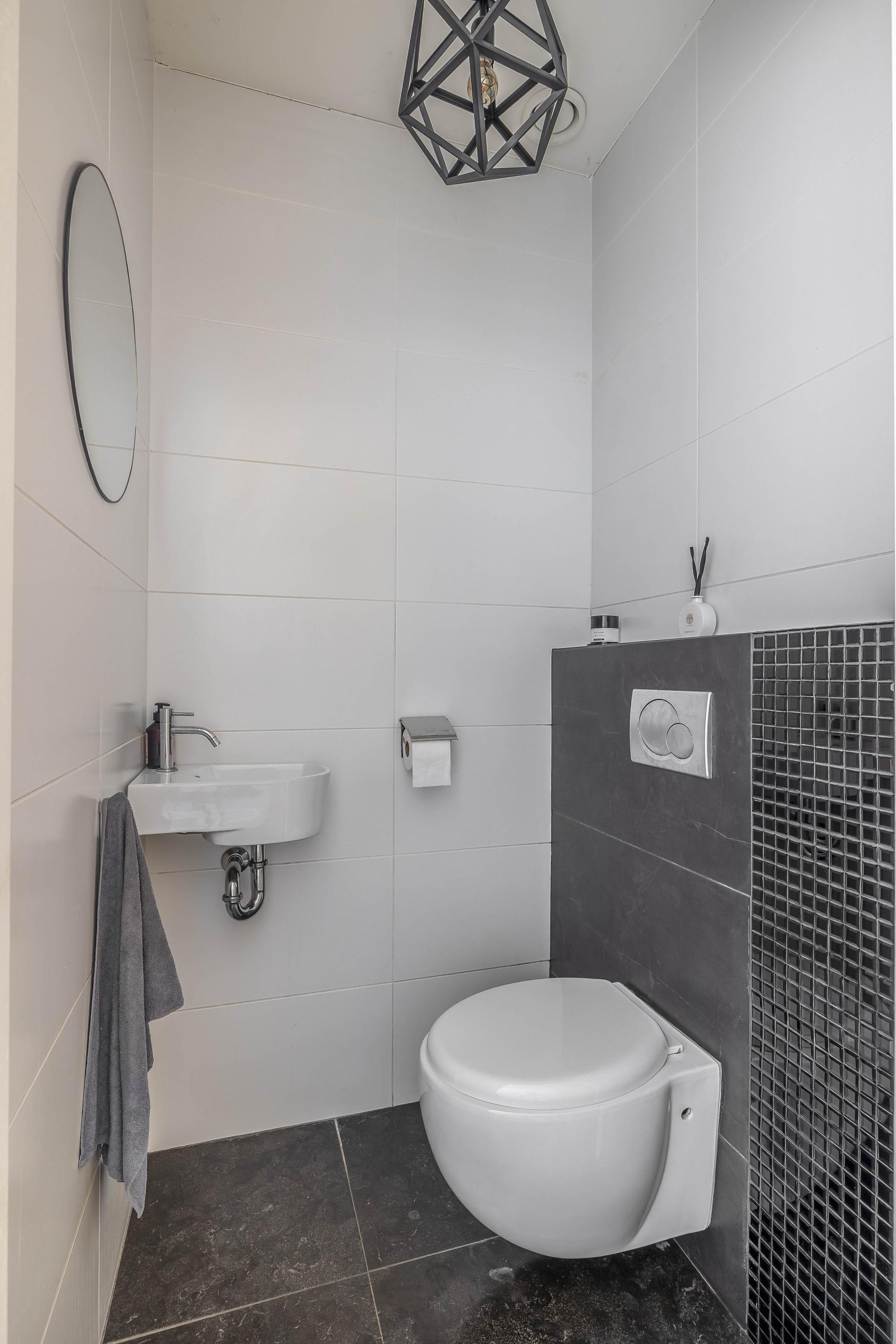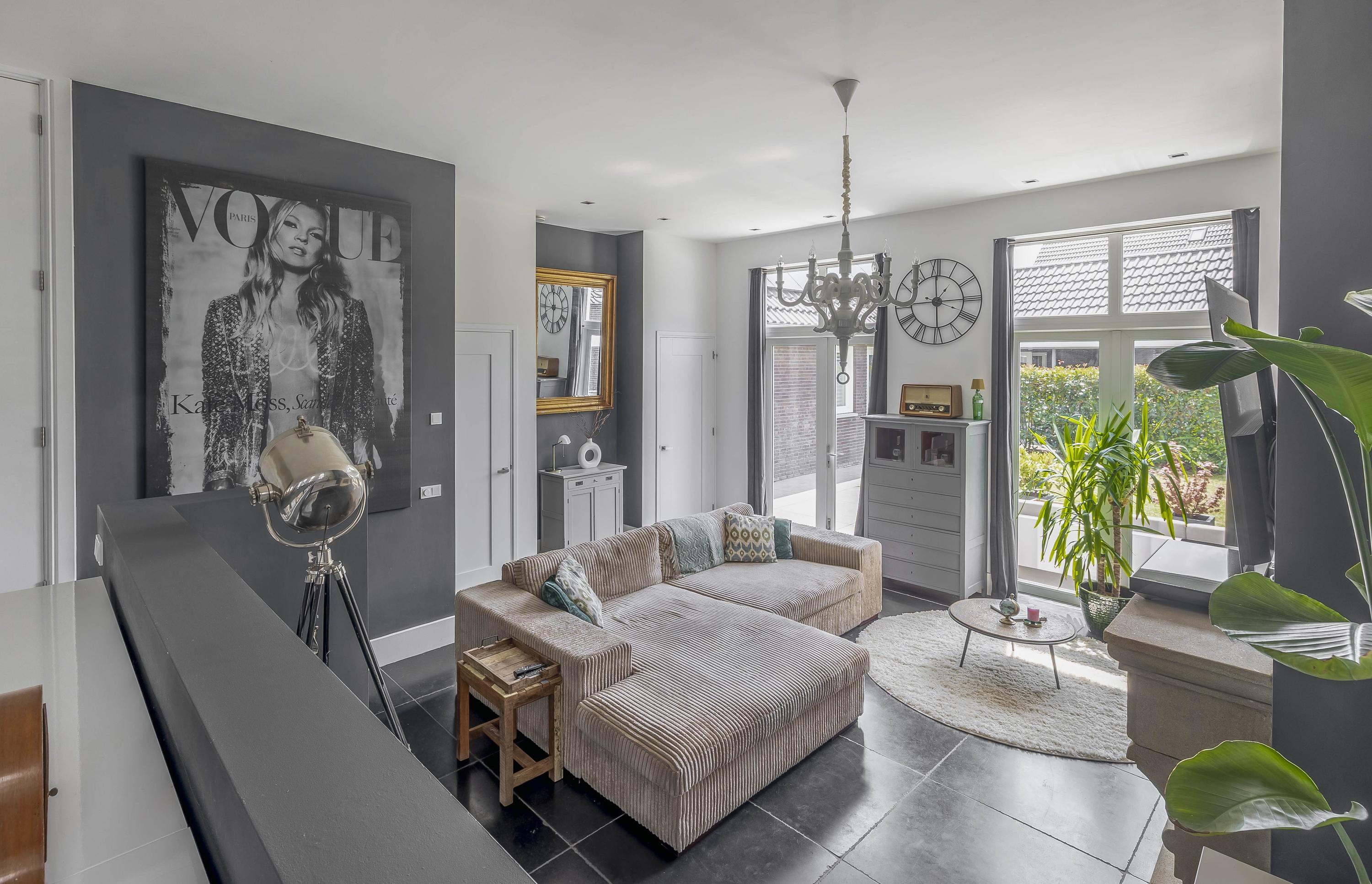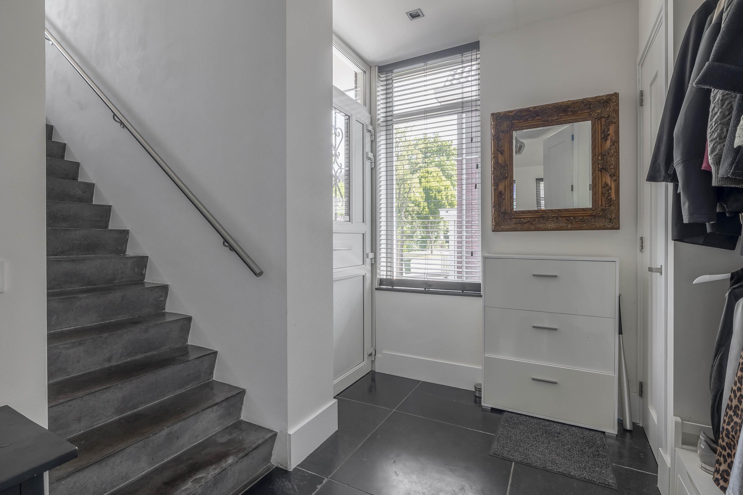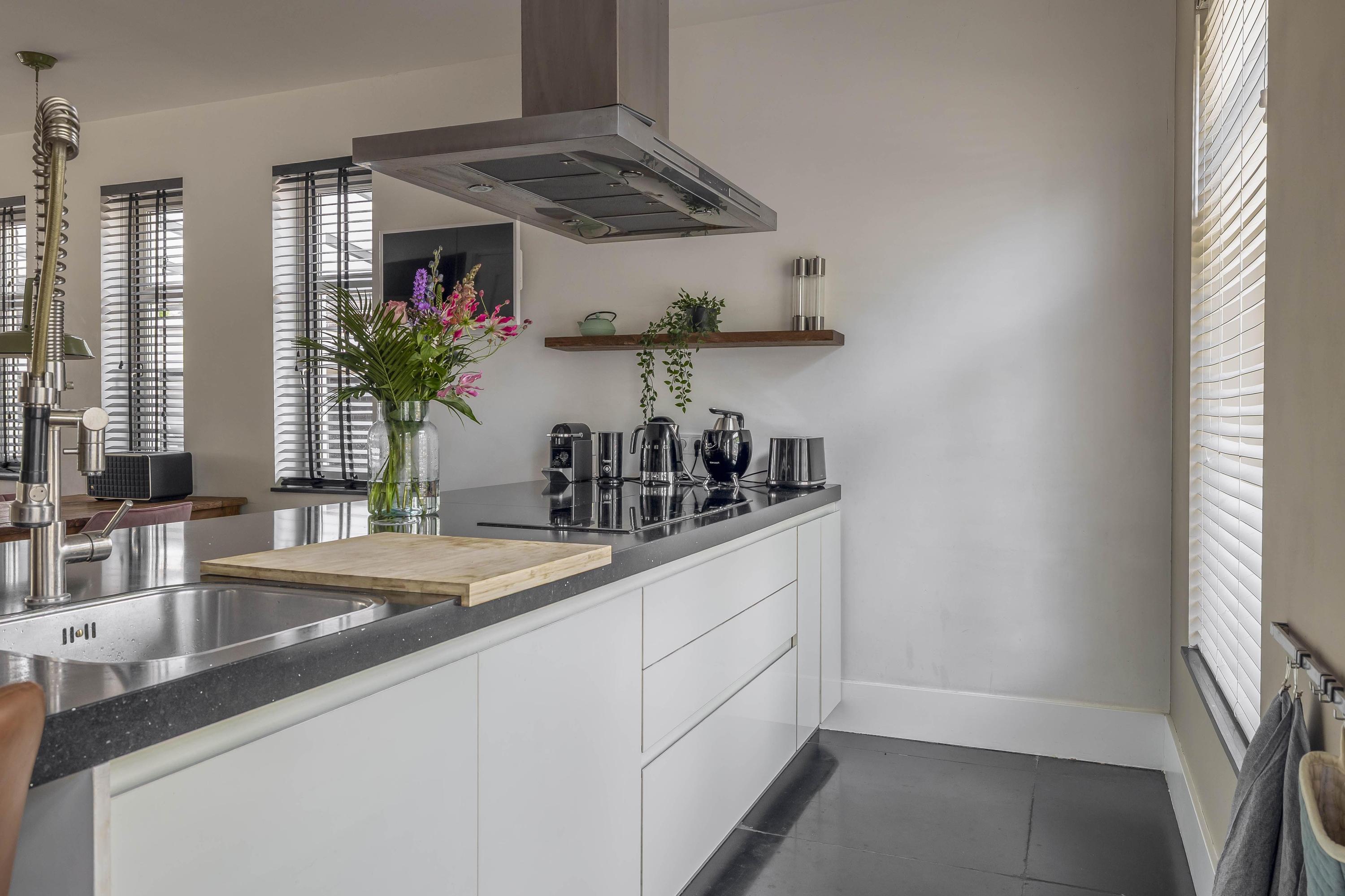Through the spacious entrance with beautiful tiled floor, modern toilet and extensive meter cupboard, you enter the kitchen at the front of the house. This stylish and complete kitchen is the heart of the house and features a kitchen island, luxury appliances and plenty of workspace. Thanks to the raised floor level, you have a beautiful view of the street.