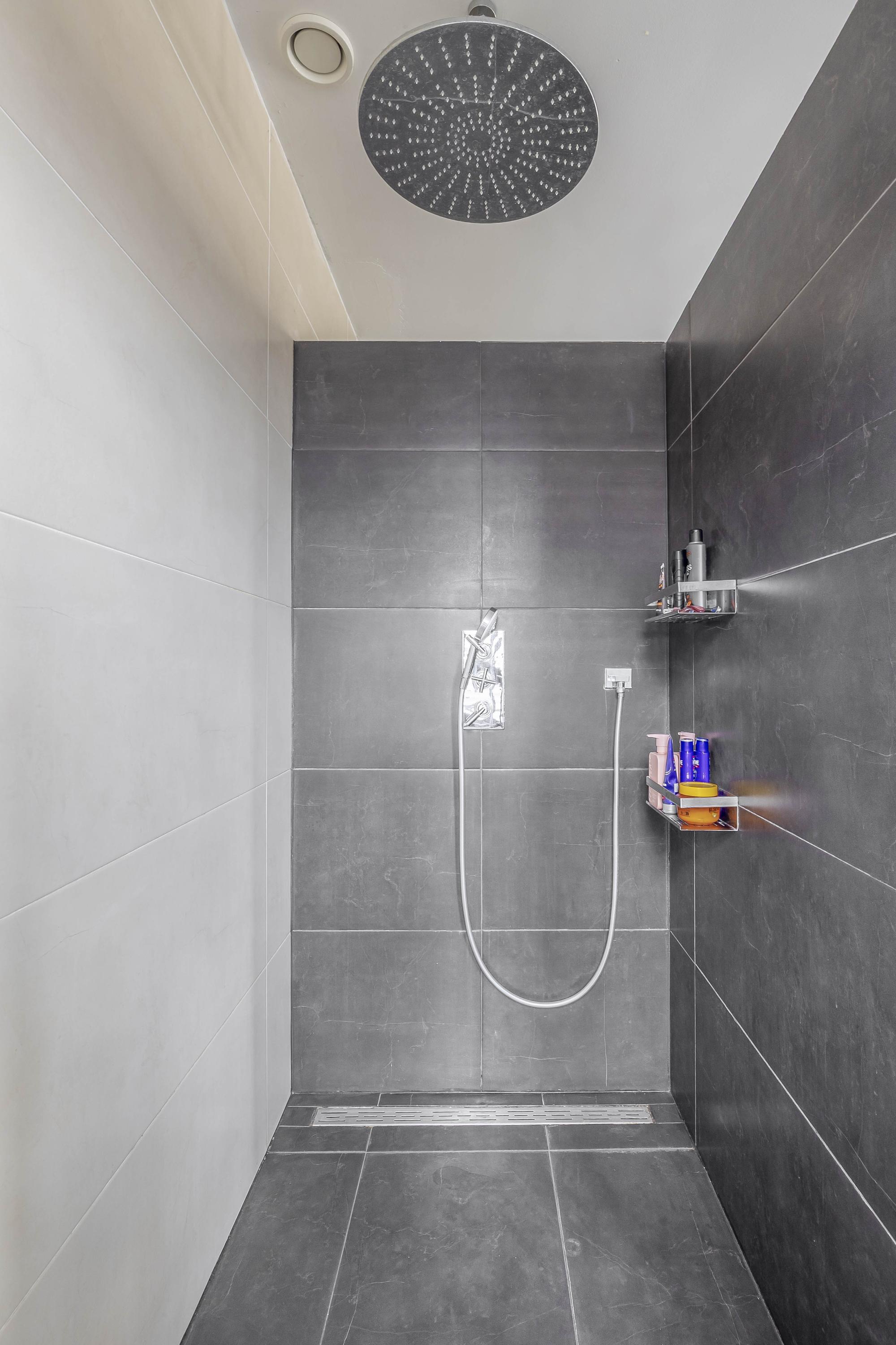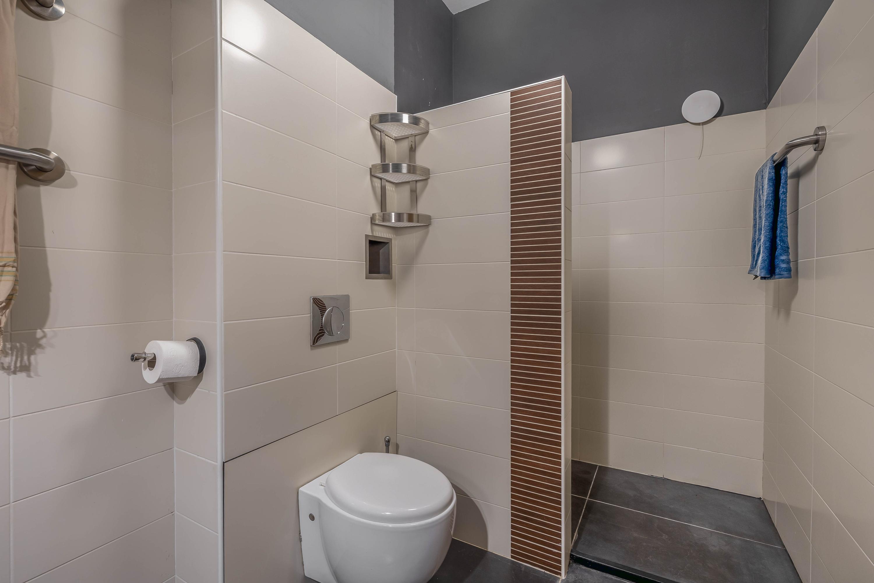 The partially tiled bathroom is equipped with a walk-in shower, wall closet and a washbasin shelf with basin.