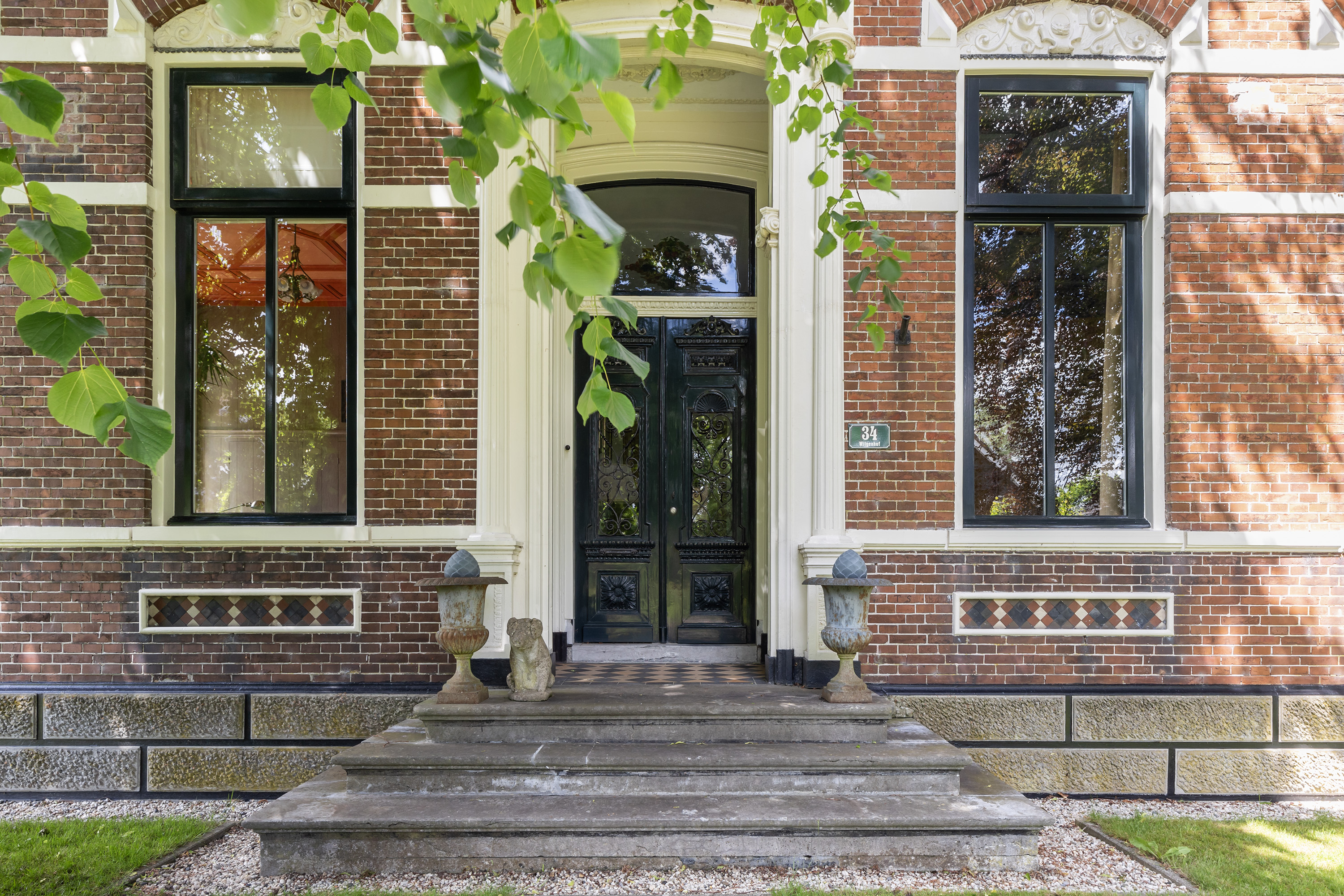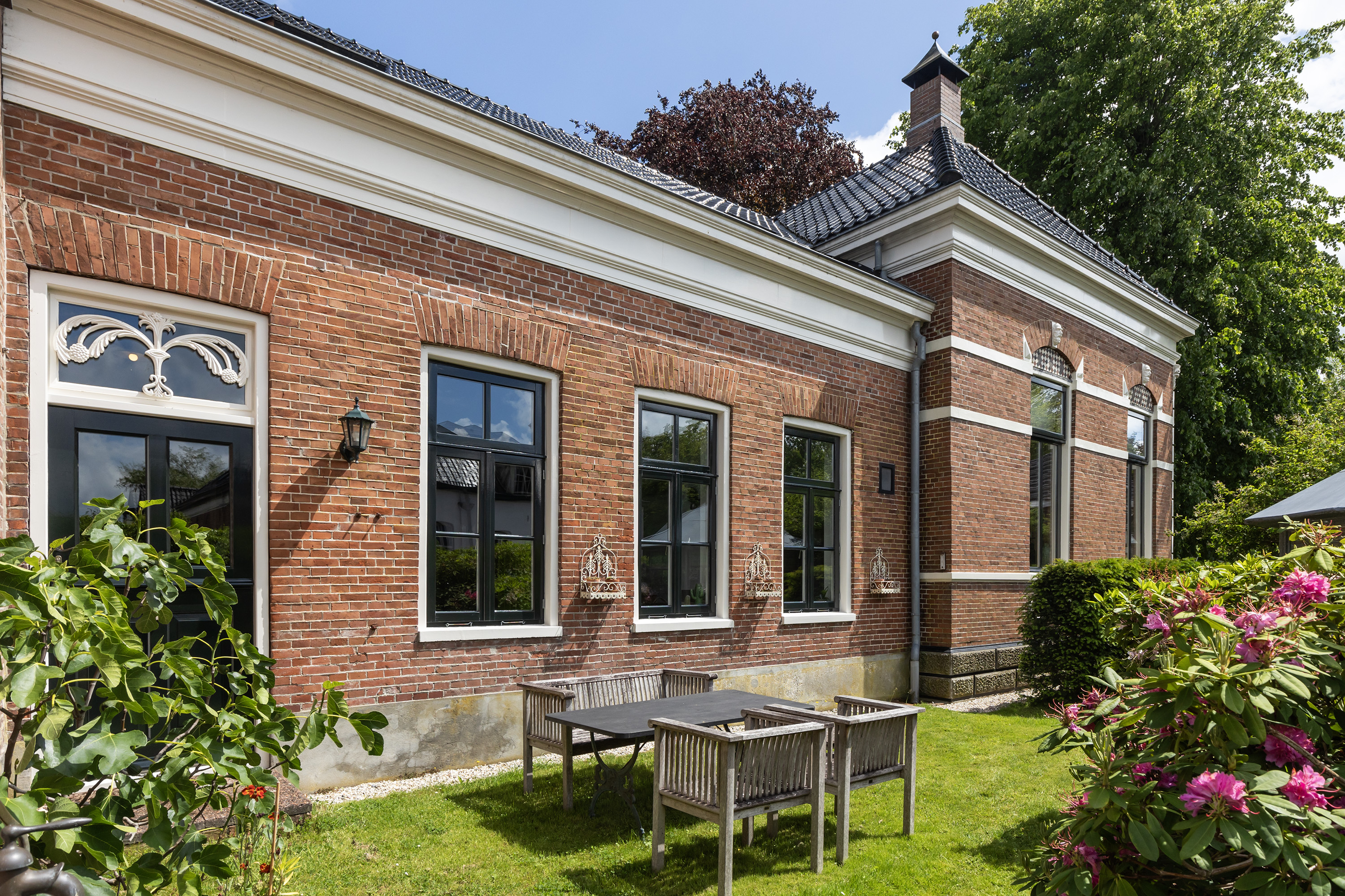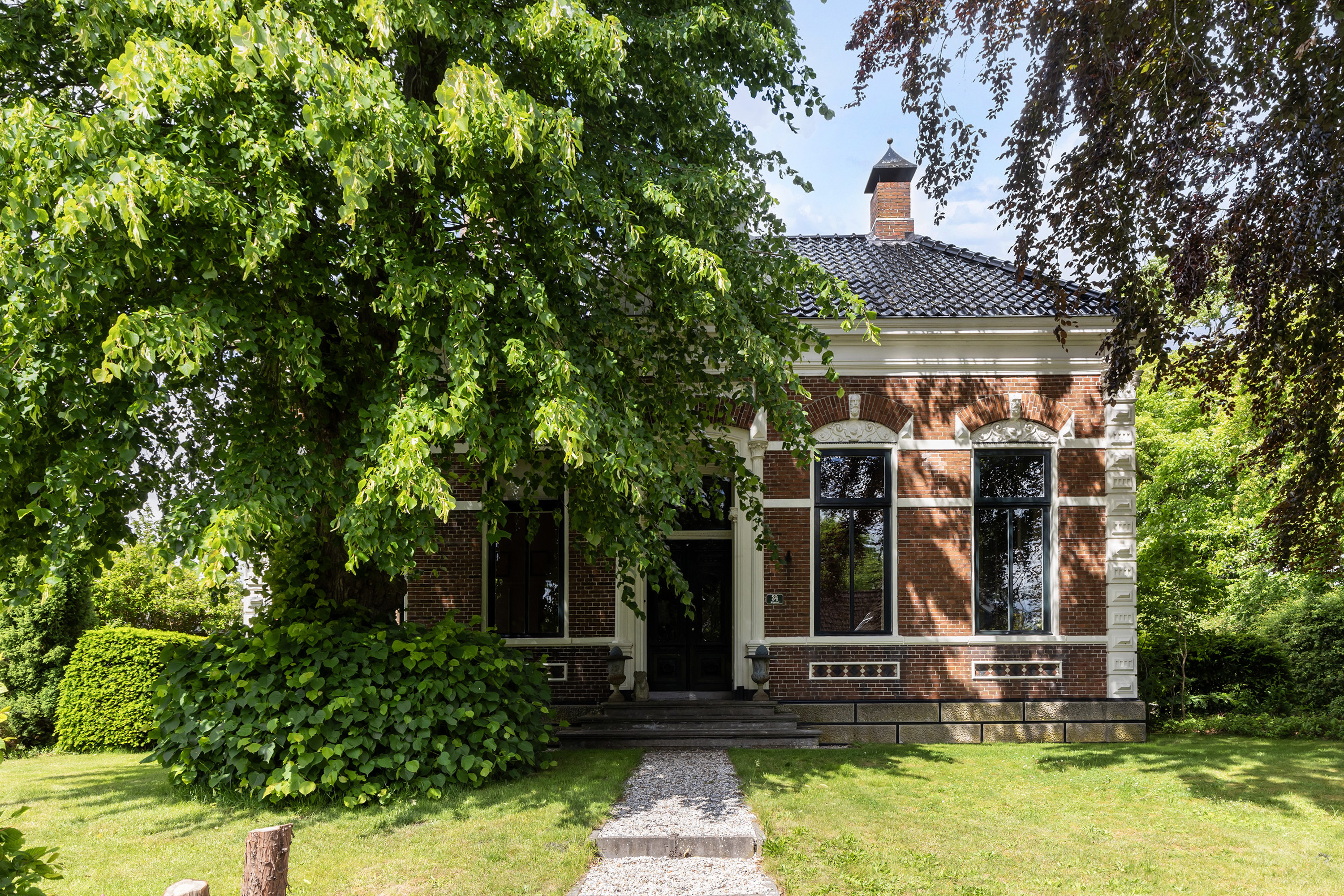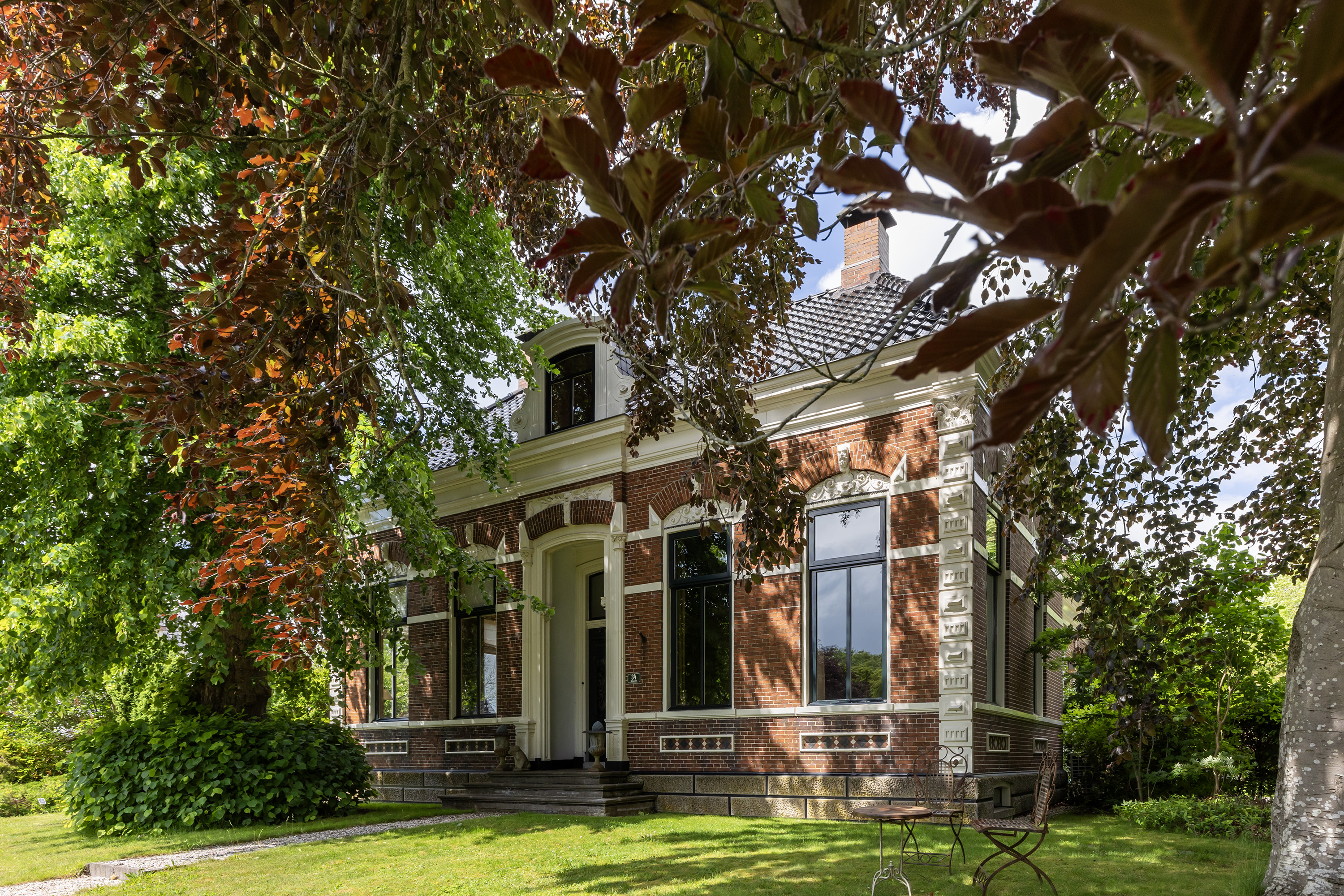 Originally built in 1850, the main residence was reconstructed in 1892 after destruction. The front façade of this monumental home is a tribute to the rich architectural tradition of Groningen. Its symmetrical front elevation with natural stone steps, ornate brickwork, decorative plasterwork and tall windows framed by elegant cornices proudly displays the craftsmanship of a bygone era. In recent years, the property has been fully renovated with great respect for its original features and with a refined sense of style. Numerous sustainability measures have been implemented, including a renewed and insulated roof, interior wall insulation finished with plasterboard, double glazing and a hybrid heat pump with modern central heating system. These features have significantly improved energy efficiency without compromising comfort. During the comprehensive renovation, old oil tanks were removed and the chimney in the kitchen dismantled to create space.