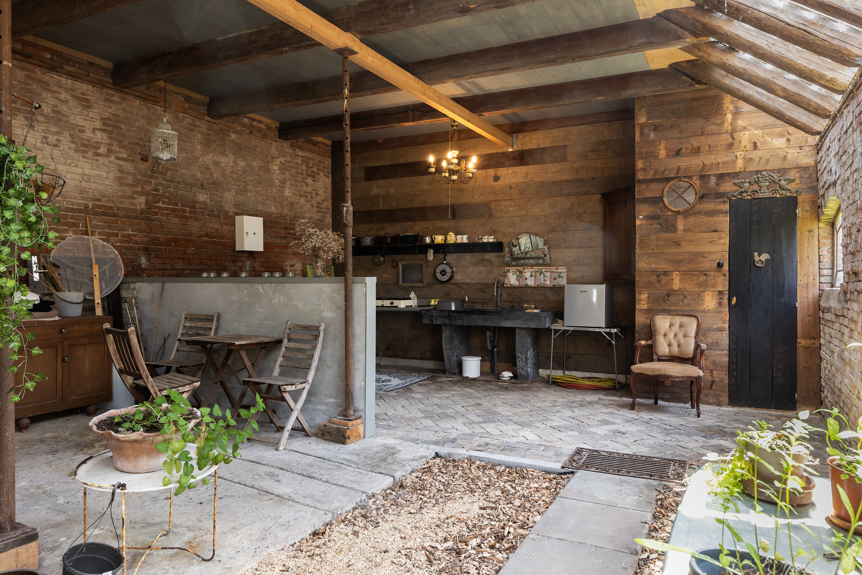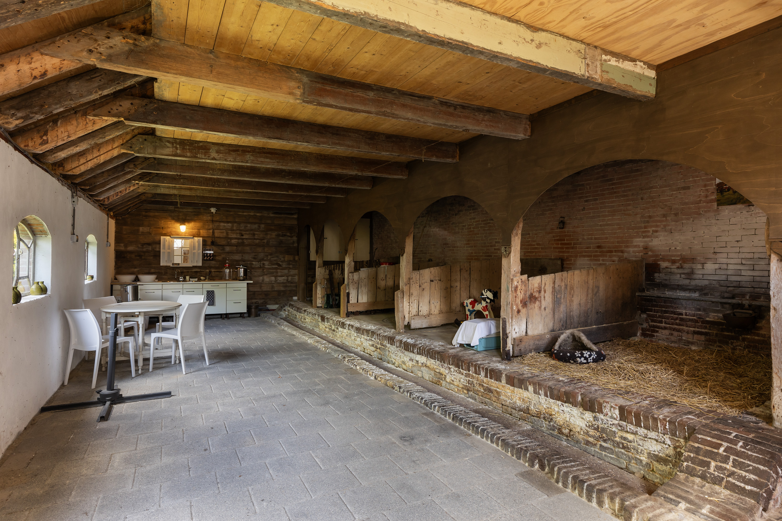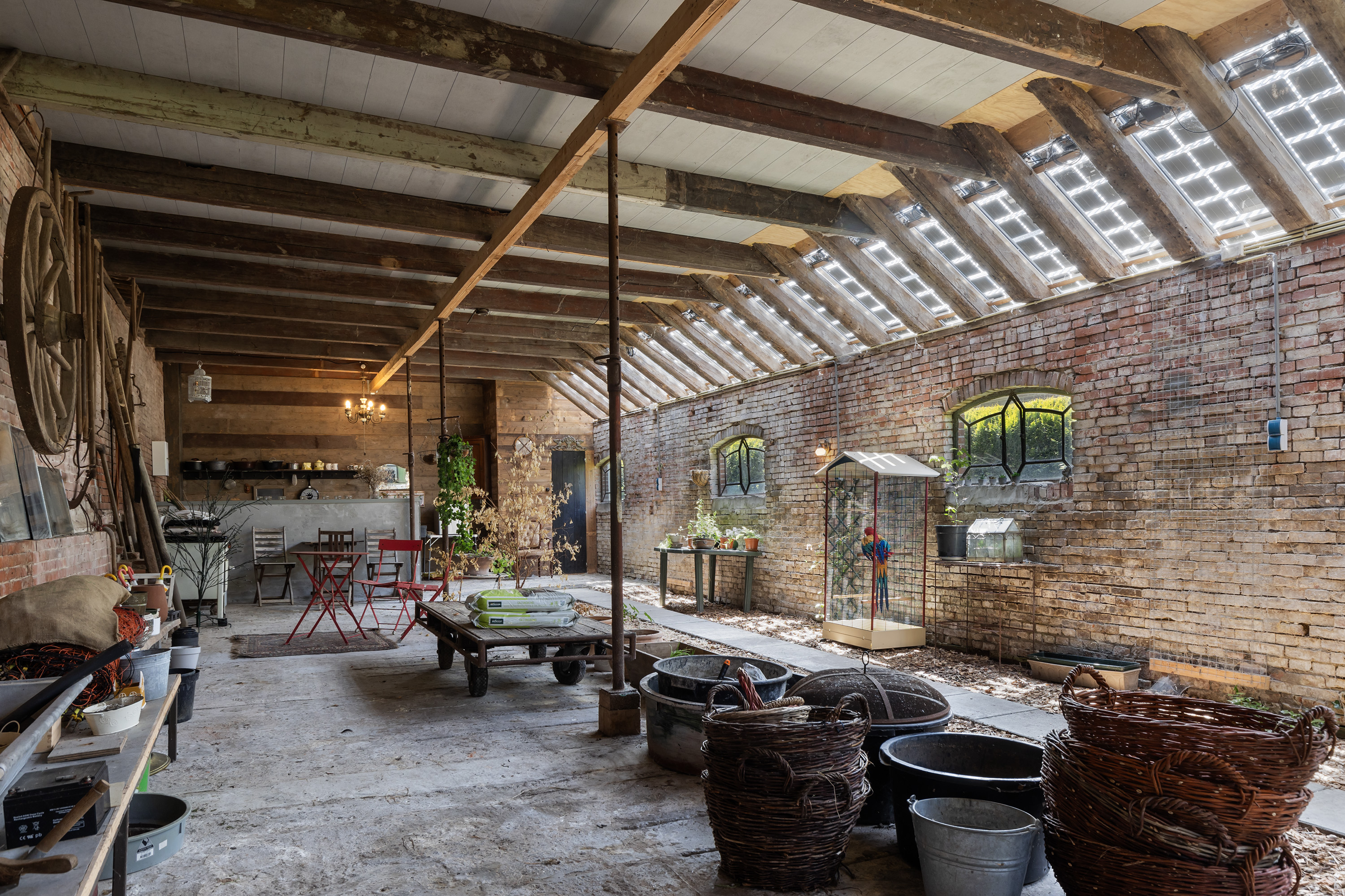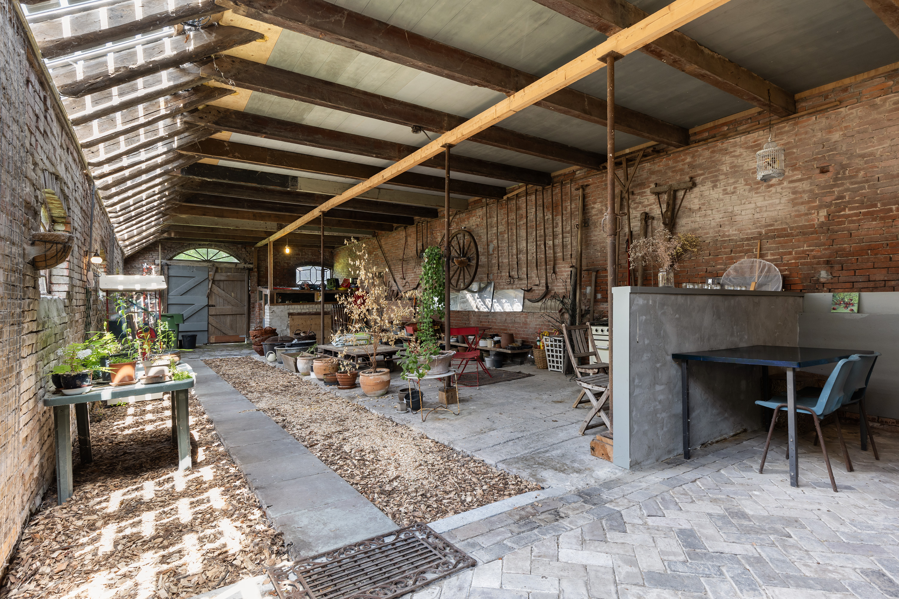 The former rear section has been transformed into a multi-purpose space with exposed brick walls and visible timber beams. Translucent roof panels allow for soft daylight. Currently used as an atelier and reception room, it includes a bar setup, zinc countertops and a seating area — suitable for workshops, exhibitions or intimate events. From here, one can access the courtyard and the adjoining barn.