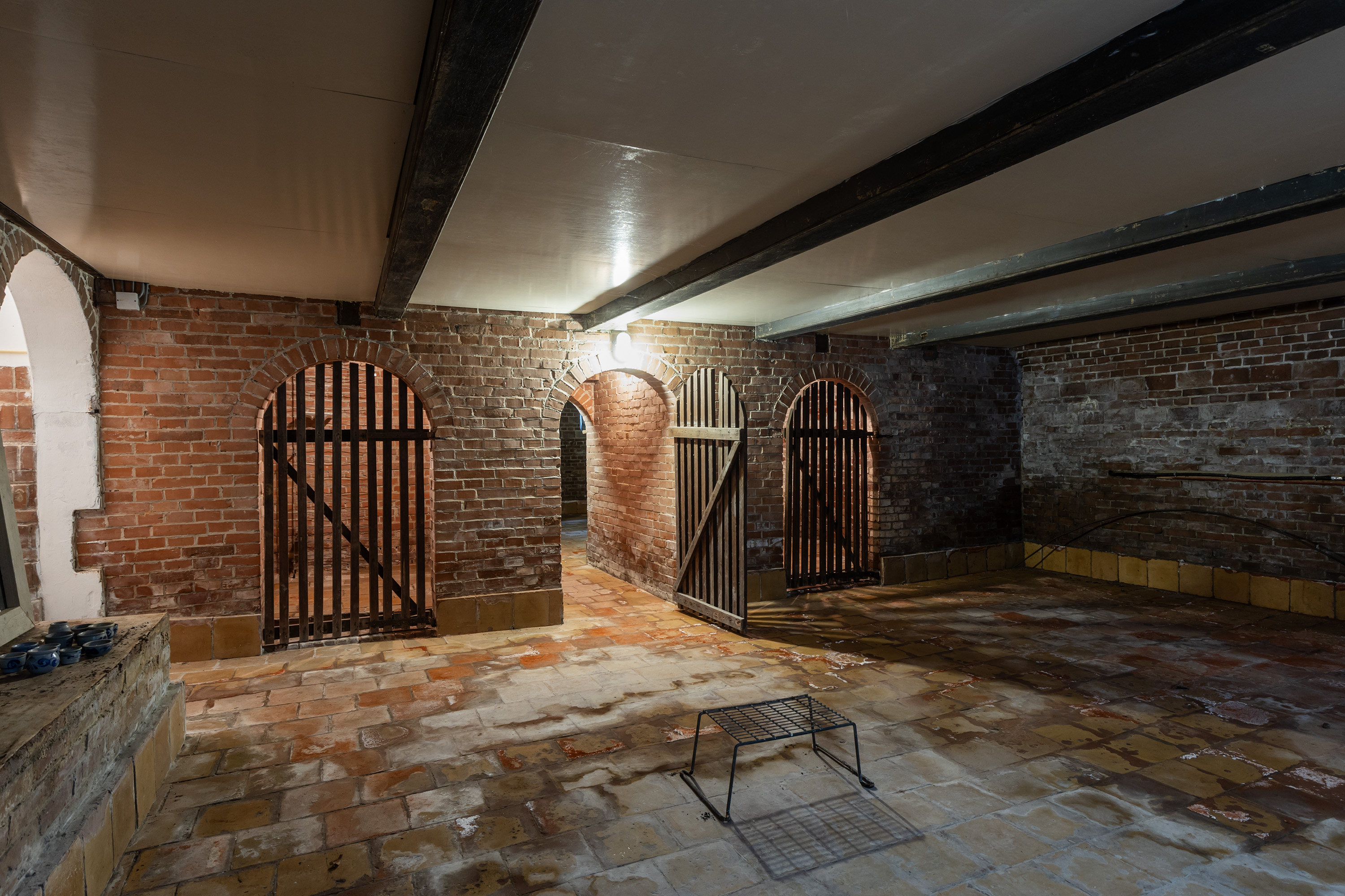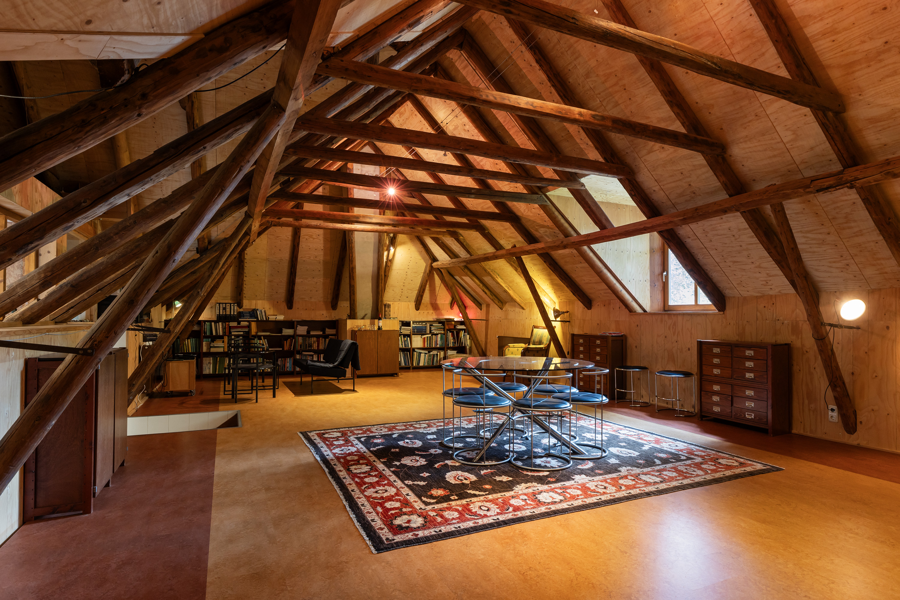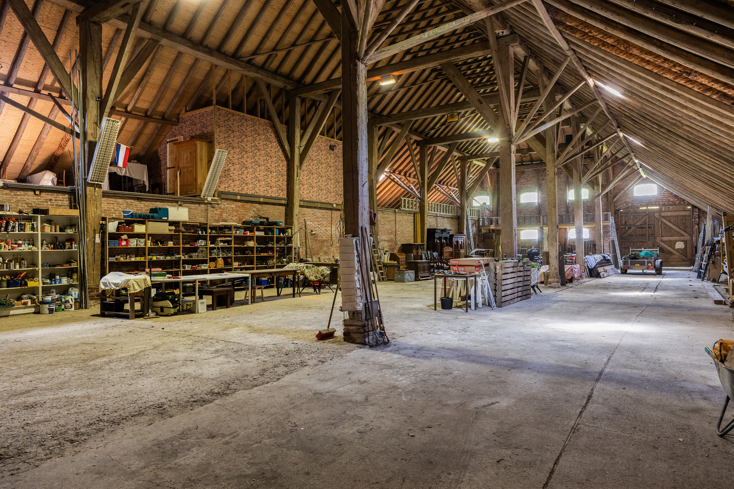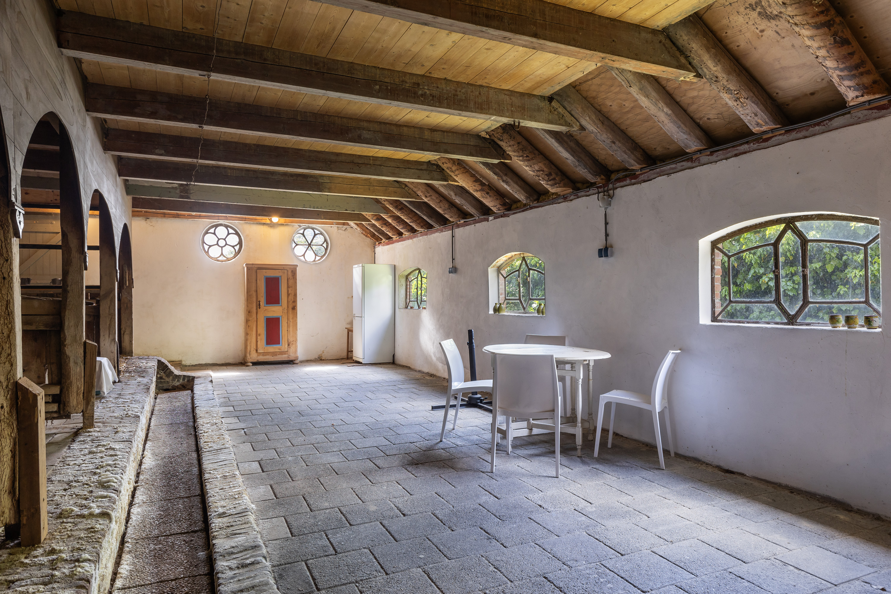 The former rear section has been transformed into a multi-purpose space with exposed brick walls and visible timber beams. Translucent roof panels allow for soft daylight. Currently used as an atelier and reception room, it includes a bar setup, zinc countertops and a seating area — suitable for workshops, exhibitions or intimate events. From here, one can access the courtyard and the adjoining barn.