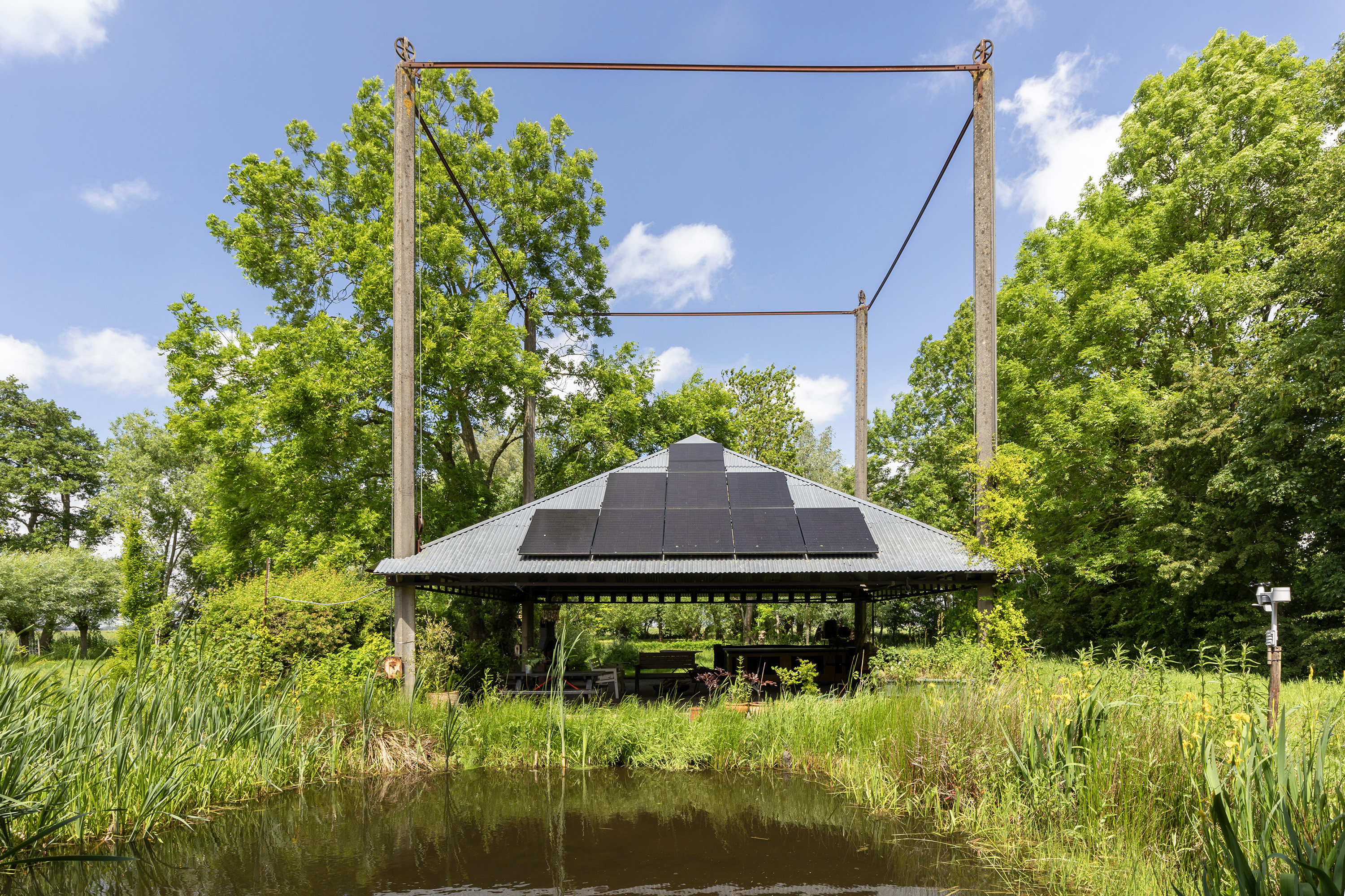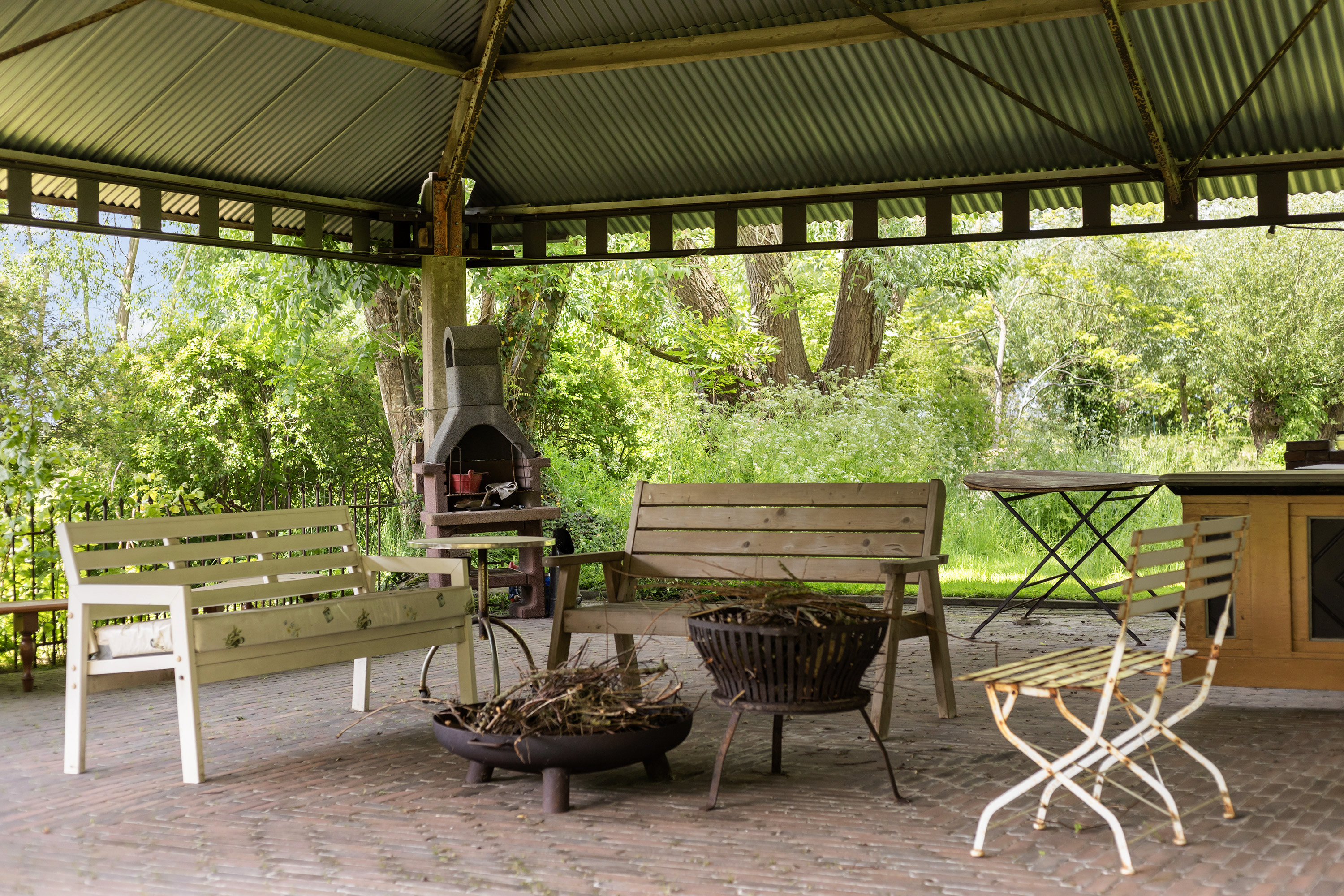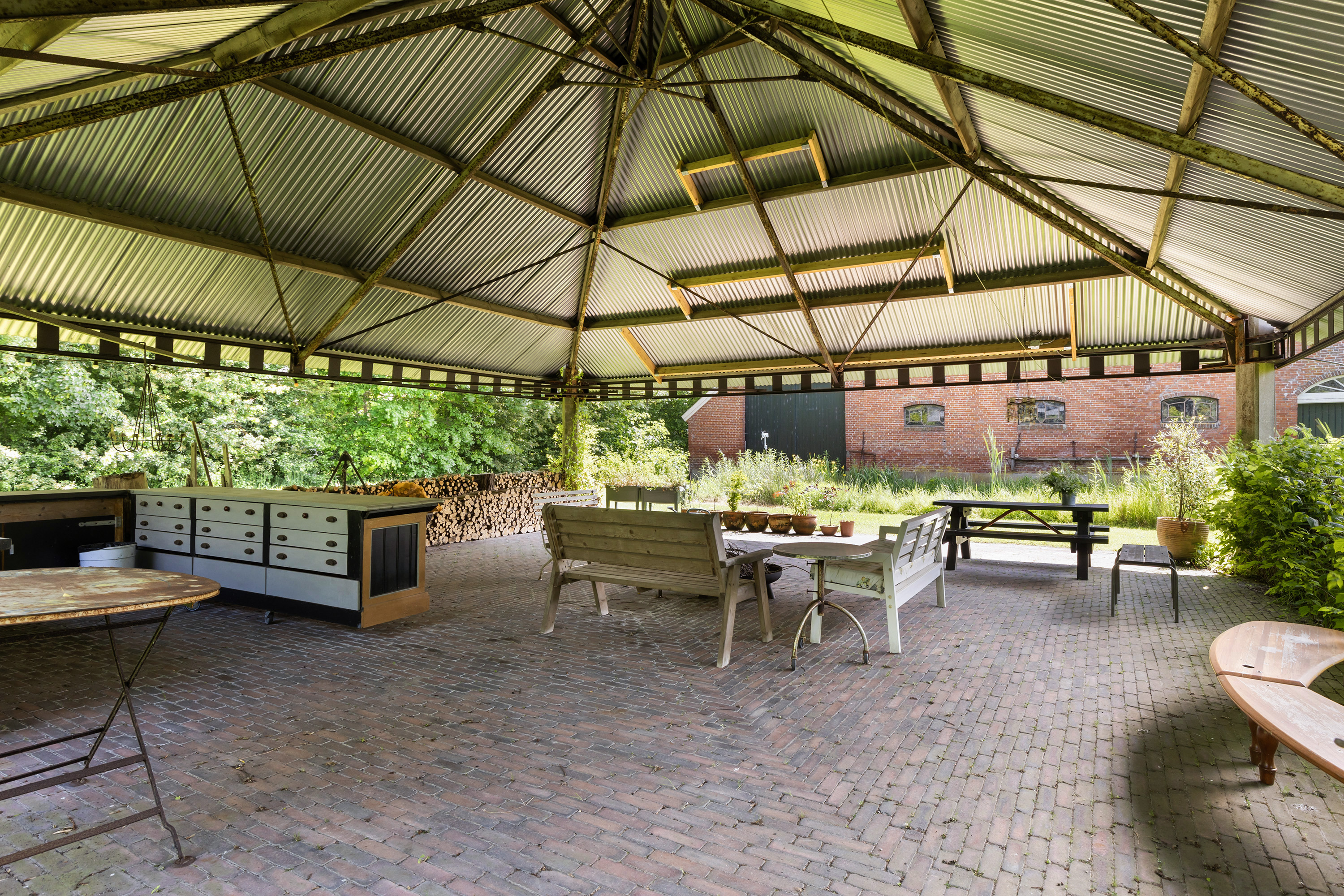 At the rear of the property stands a picturesque open haystack structure with galvanised steel roof, sheltering an outdoor kitchen, firepit, bar and several seating areas. This inviting outdoor room provides protection from sun and rain and is ideal for al fresco dining or relaxation. The garden is deep, lush and private, bordered by mature trees that ensure privacy without compromising the view. A glass tea house, garden shed and various sun and shaded terraces complete the outdoor experience. Indoor and outdoor living blend effortlessly.