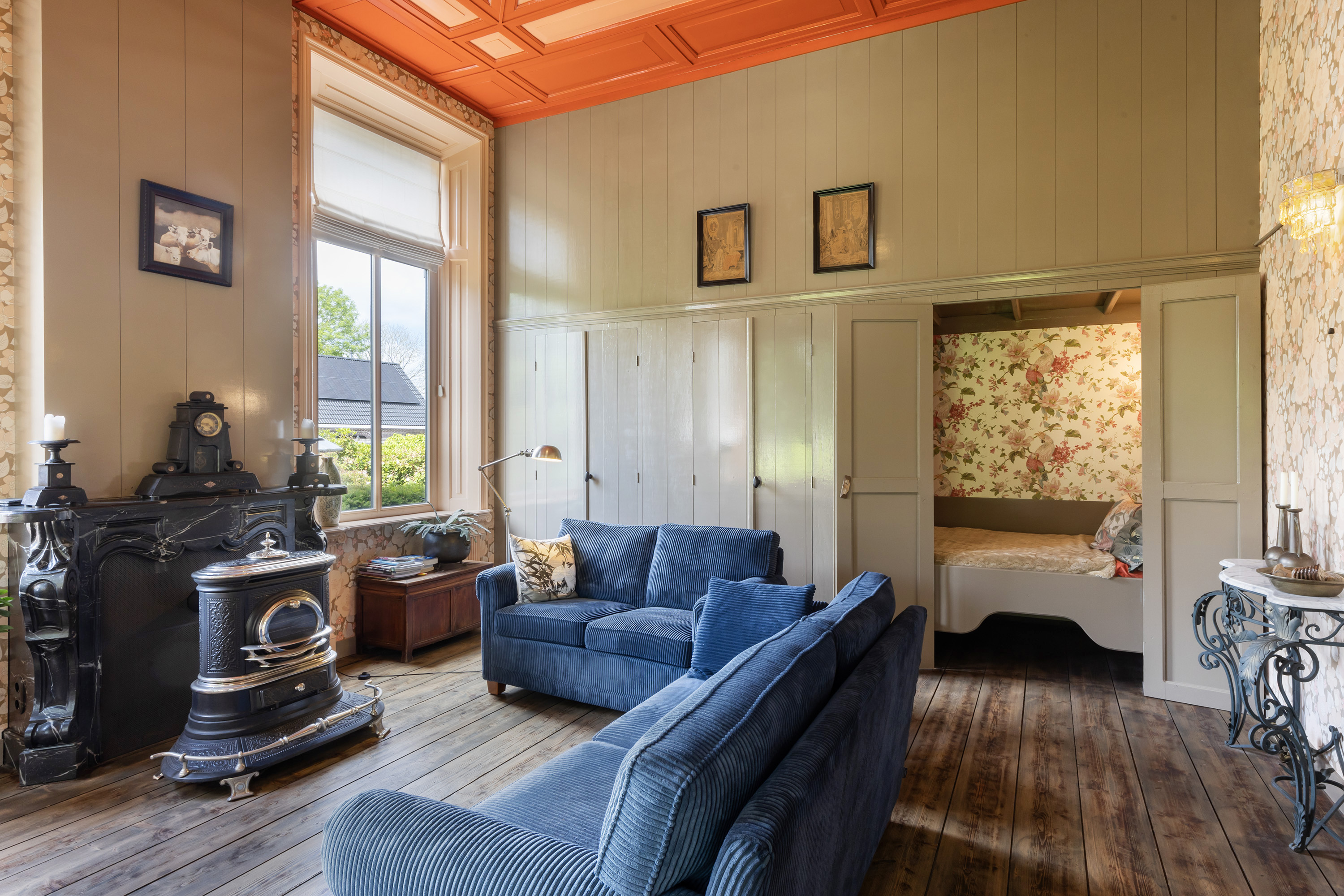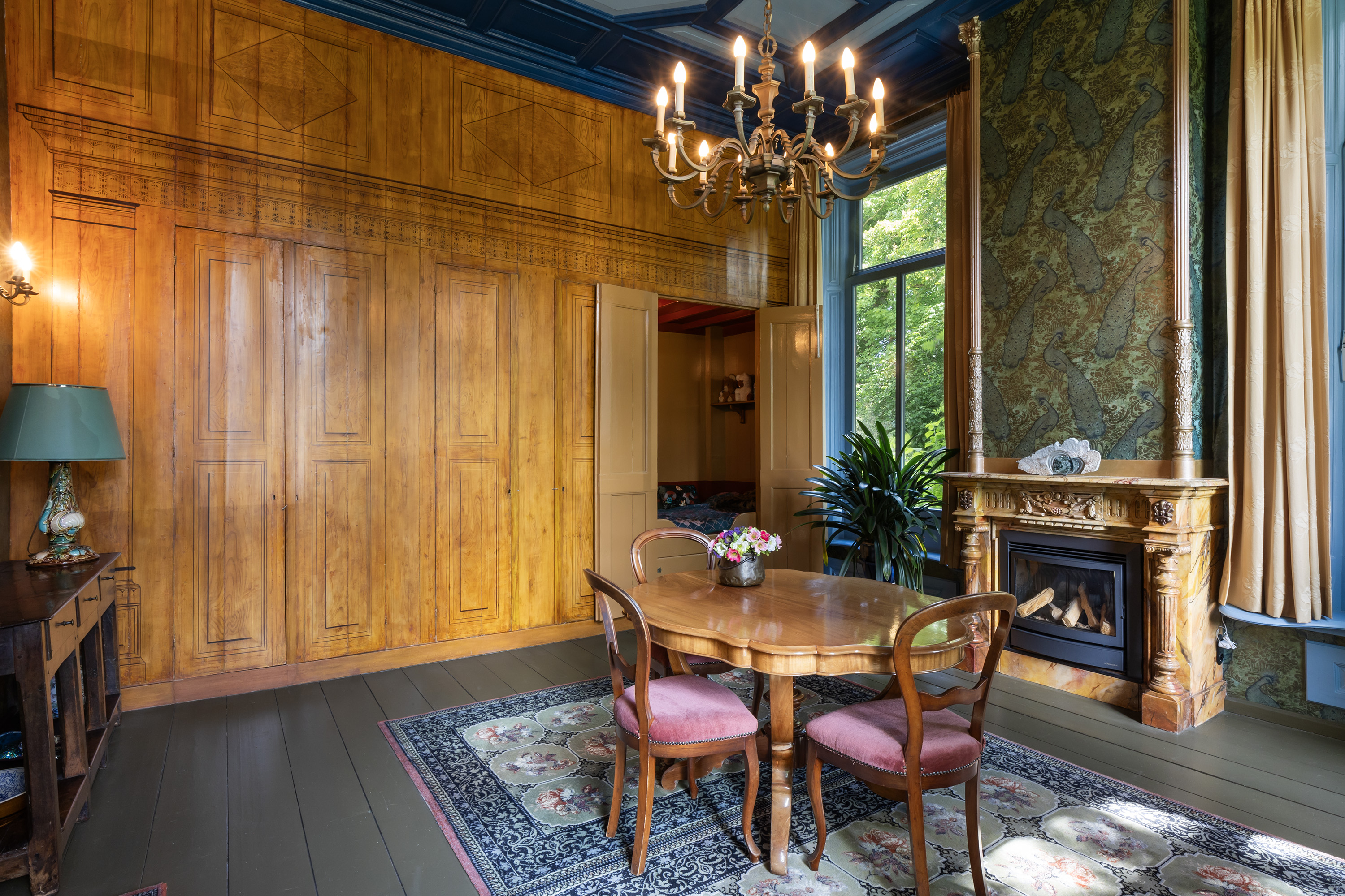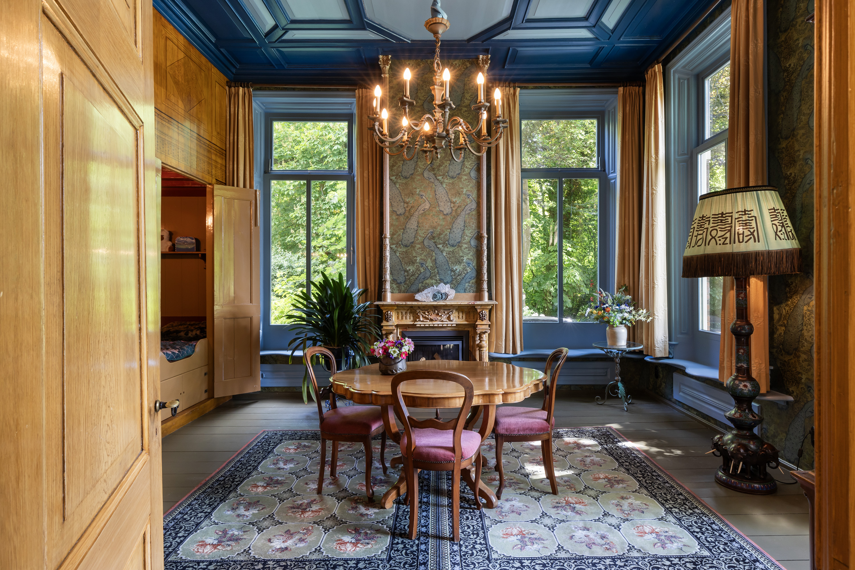This impressive space features deep-set windows on two sides, an ornate mantelpiece, elegant wallpaper and a blue-toned painted ceiling with decorative mouldings. The built-in wall includes a box bed and three cupboards, creating both charm and functionality. Perfect as a formal dining room or private library.