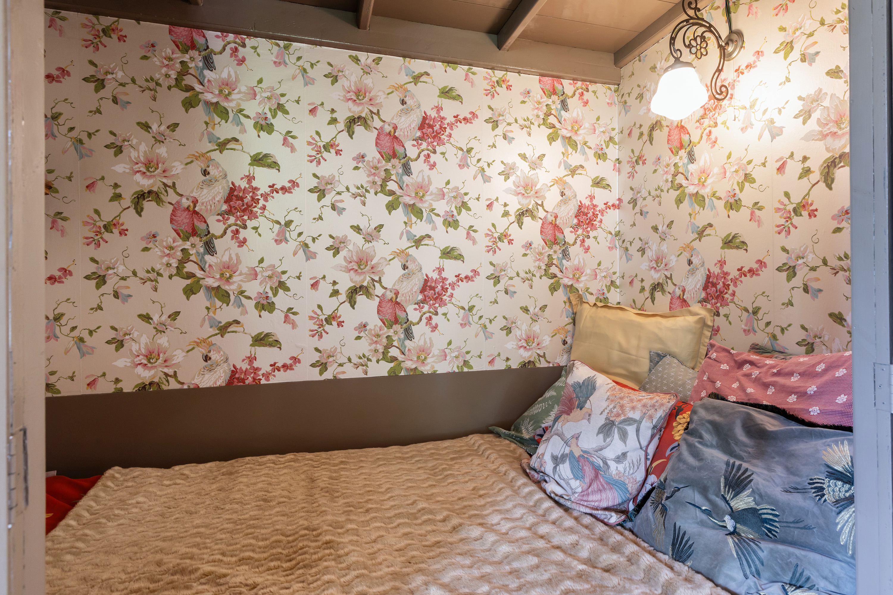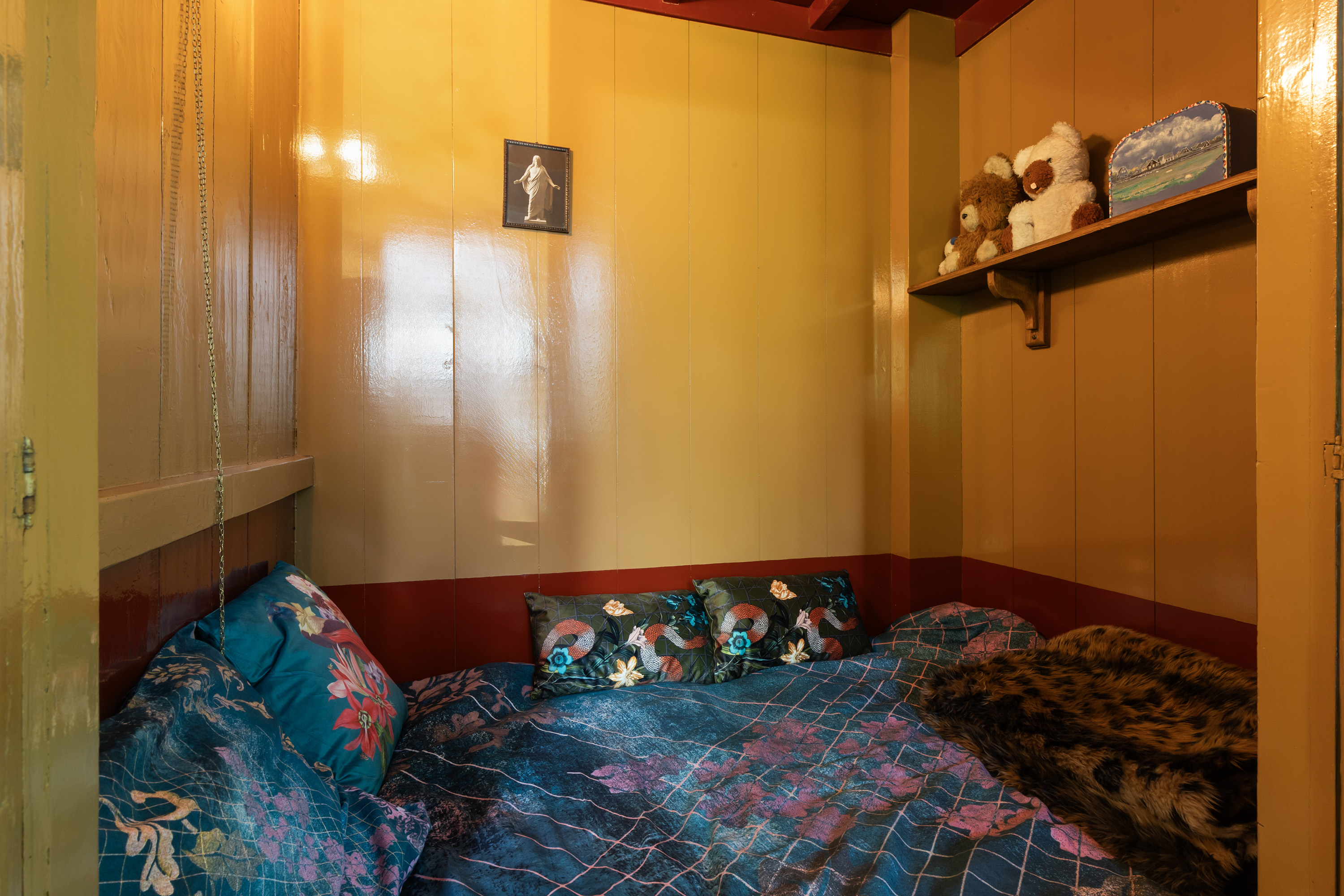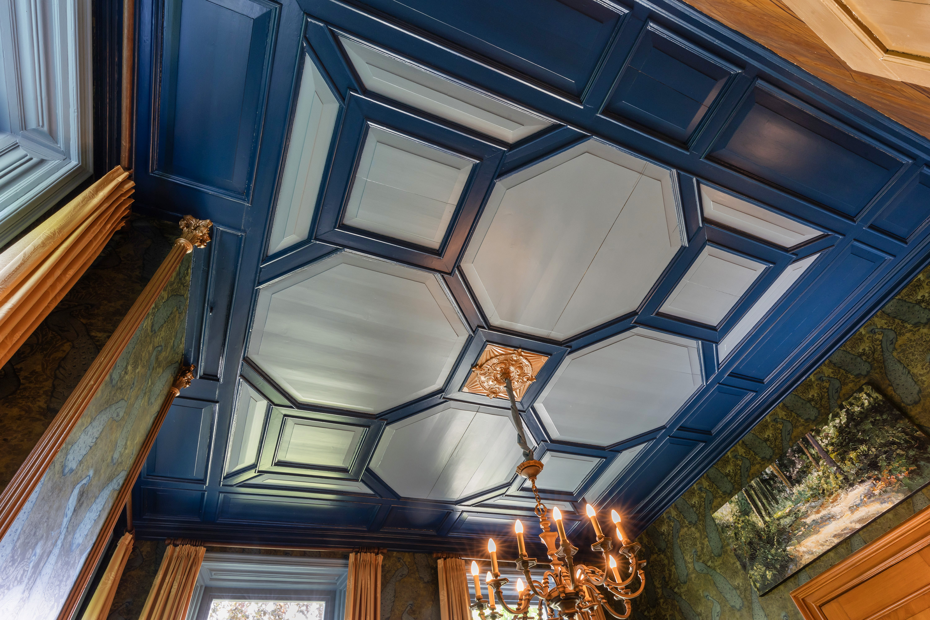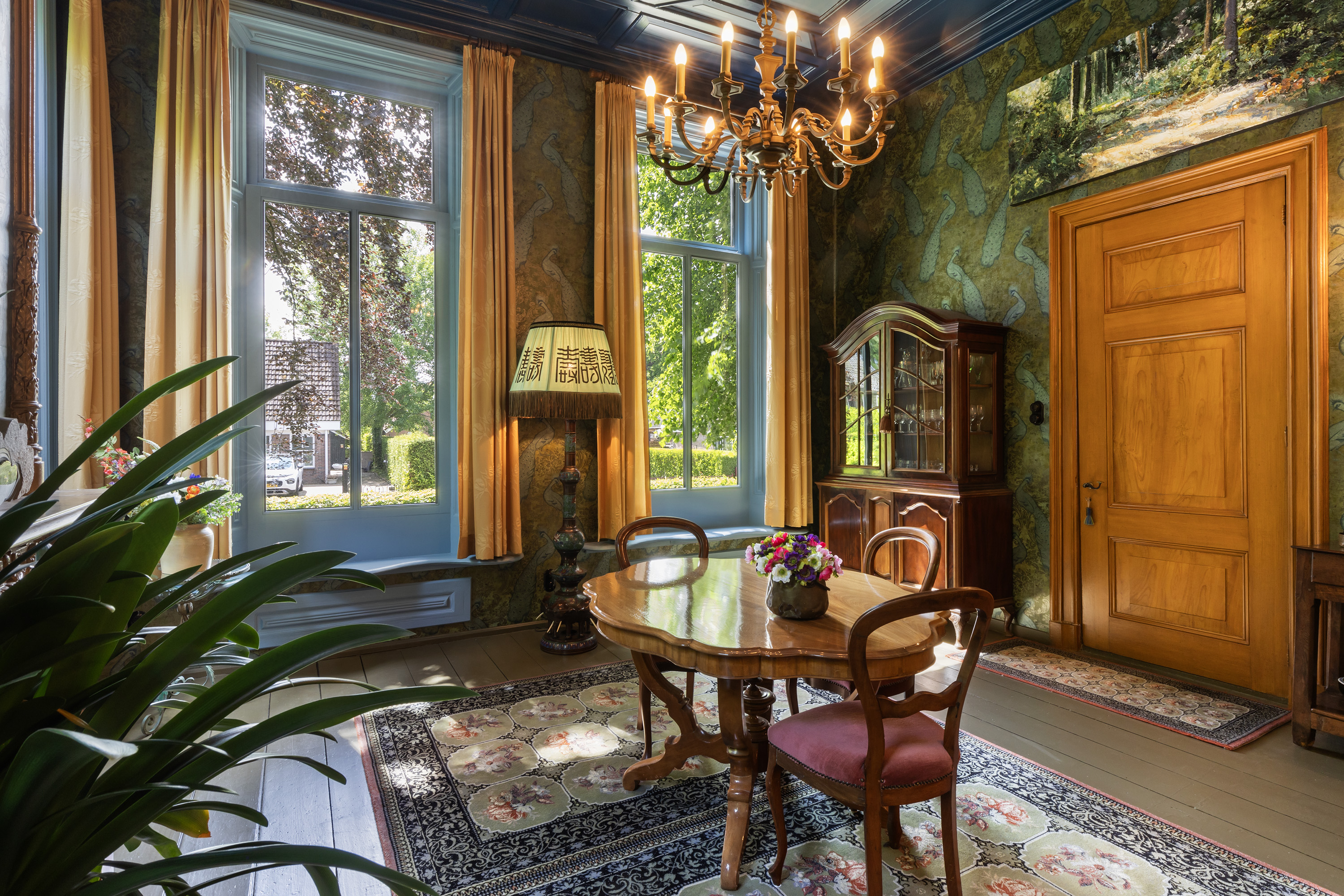 This impressive space features deep-set windows on two sides, an ornate mantelpiece, elegant wallpaper and a blue-toned painted ceiling with decorative mouldings. The built-in wall includes a box bed and three cupboards, creating both charm and functionality. Perfect as a formal dining room or private library.